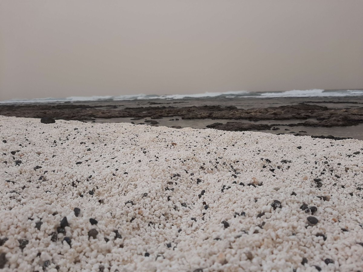 И вот мы на острове Фуэртевентура. Видимость совсем упала, и мы направились на заселение в апартаменты. Проехали мимо песчаных дюн. Там было всё плохо, ничего не видно. Также было боязно ходить по улице, так как вдруг калима вредна для здоровья. В общем, мы решили ещё всё-таки заехать по пути в один город. Сходили там на набережную и сделали пару фоток:
