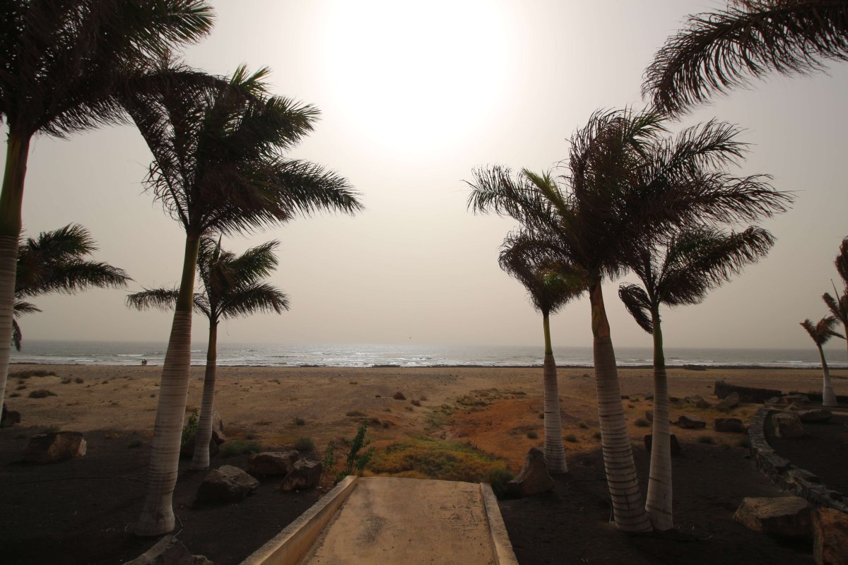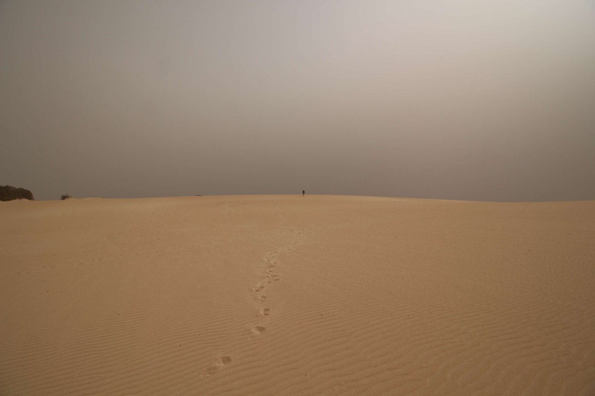 Утро 23-го февраля. Я встал не так рано, в 8 утра. Пошёл как всегда разбираться, куда можно поехать и вообще целесообразно ли куда-то выезжать при калиме. Посмотрел в окно. Видимость была не такая, как вчера, поэтому я подумал, что калима начала уходить. Разбудил Свету, мы поели, собрались и поехали кататься по острову. Сначала поехали на дюны. Но пока доехали туда, что-то калима опять затянула, и как-то всё очень плохо было, но мы всё равно пошли гулять.