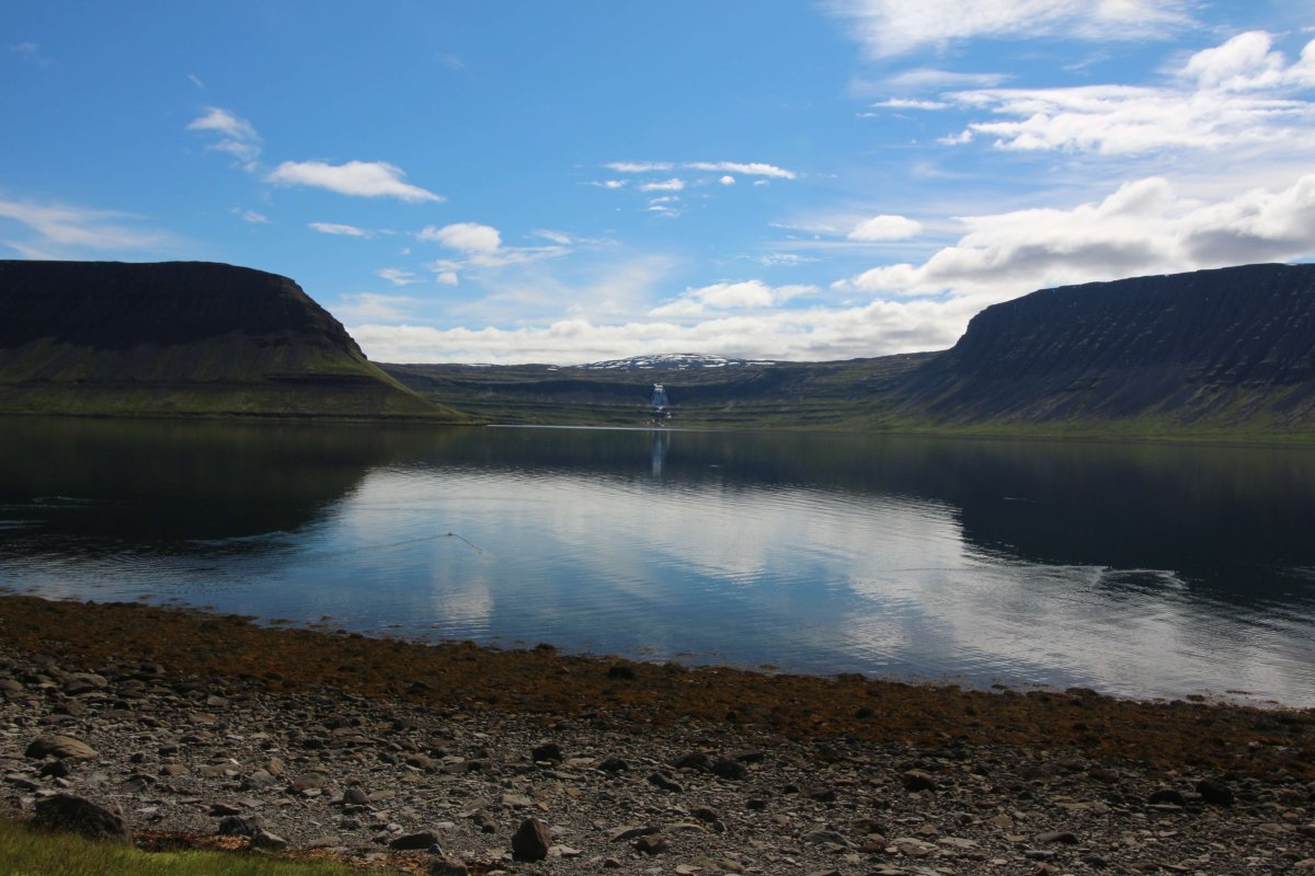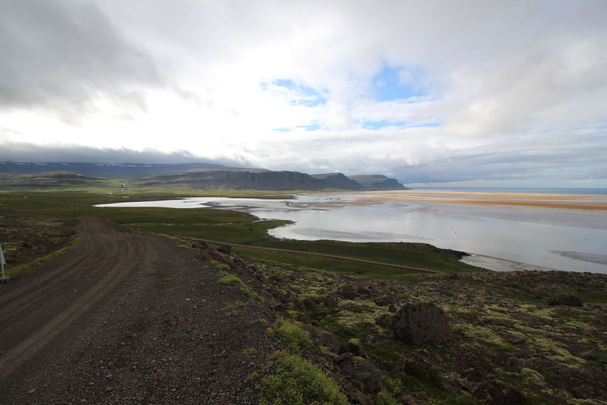 В принципе всё. Нам оставалось теперь ехать в Судавик. Там я забронировал гостиницу, зная, что этой ночью там будет холодно. Едем мы такие по промозглой погоде, дождик иногда хлещет. Мы уже усталые от долгой утомительной дороги. И тут неожиданно мы выезжаем из-за перевала на северо-западные Исландские фьорды, и вдруг тучи рассеиваются, и перед нами прорезается синее небо. Как оказалось, там дождём и не пахнет - не пускают горы. Такую же ситуацию с погодой мы наблюдали на Лофотенах в Норвегии, и красоты там были такие же. Я вот сейчас писал эти слова про Лофотены, а потом заглянул в свой файлик с точками, которые нужно было посетить в Исландии, и вот эти фьорды были мной при планировании отмечены следующим комментарием: "возможно, имеют такую же красоту, как и Лофотены".