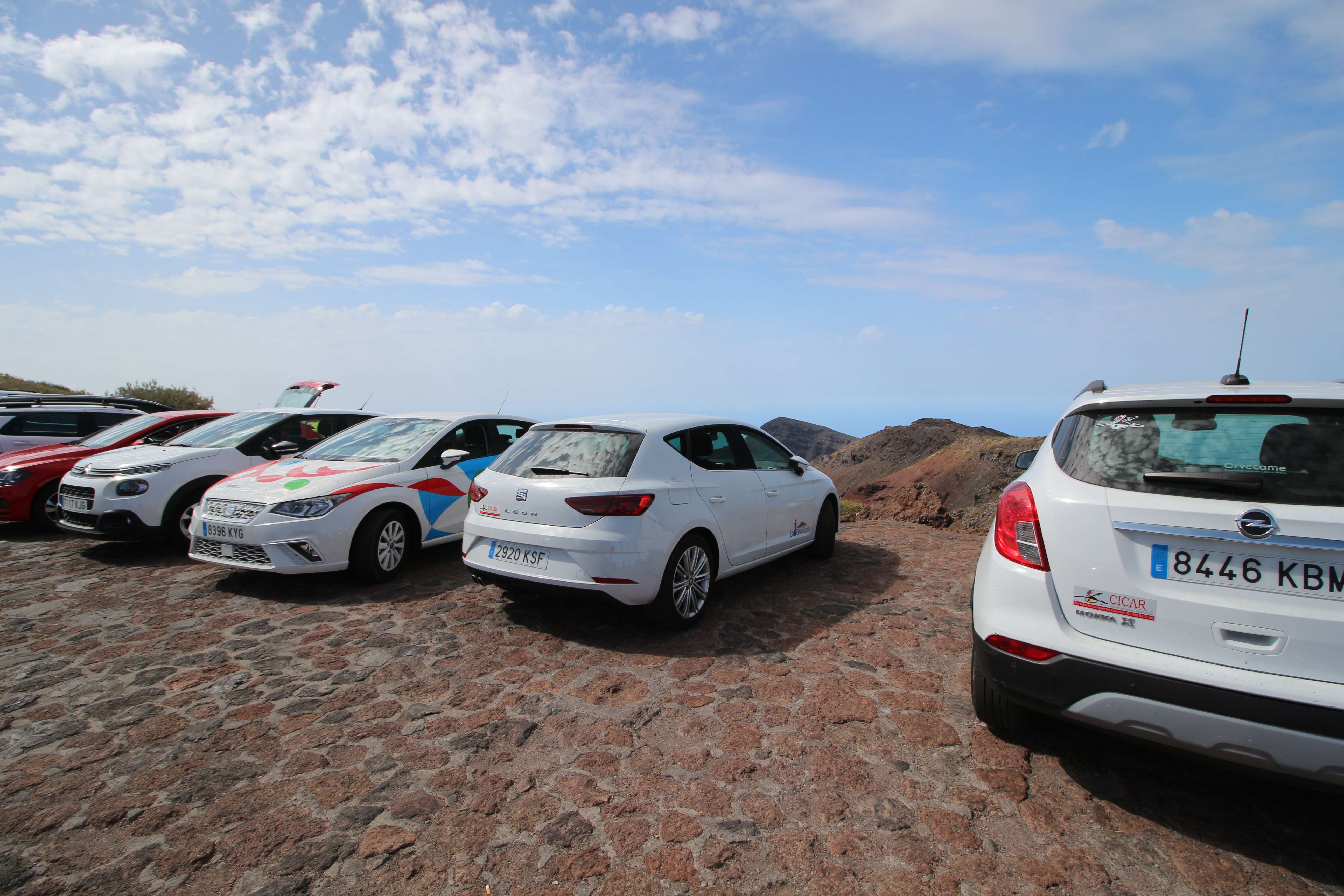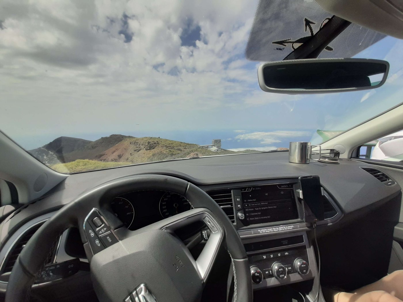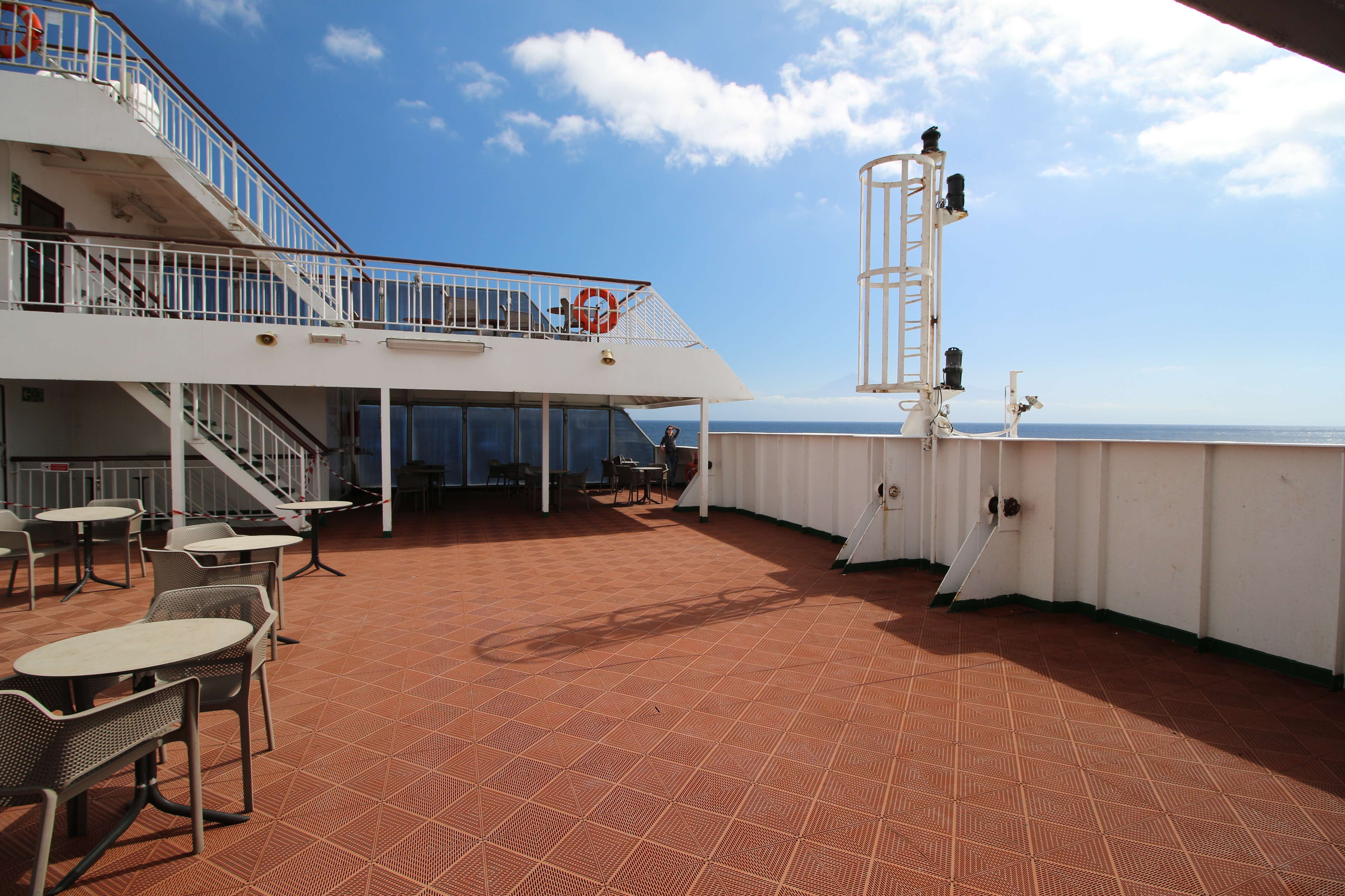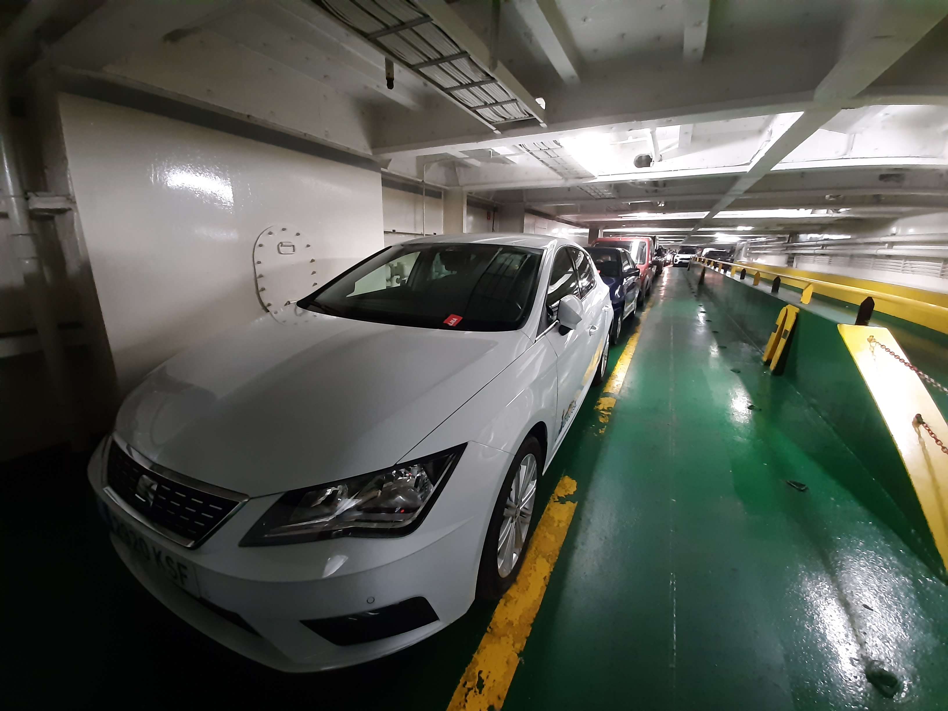 Когда мы летели над Европой, я приметил то место в Австрии, где мы были в 2017 году: А дальше вблизи от нас пролетел другой самолёт: Пока летели, Света как всегда посматривала фильмы на экране, встроенном в кресло впереди сидящего пассажира, а я читал статьи на телефоне и слушал подкасты. А когда пришло время обеда, она отдала мне все пирожные, что дали ей) По прилёту мы очень долго простояли в очереди на паспортный контроль. Может, два рейса пришло в один час, но вокруг нас все были русскоговорящие. После контроля мы забрали наши чемоданы, которые уже давно крутились на ленте, и пошли оформлять машину. Благо мы знали, куда идти. Оформление прошло без сюрпризов. Настраивать машину долго не пришлось, я помнил всё. Кстати, именно поэтому я и решил забронировать точно такую же машину. А то каждый раз с новой машиной приходится разбираться, это требует и времени, и сил. Сели в машину и погнали. И вот тут была какая-то проблема: навигаторы в обоих телефонах долго не могли понять, где мы. Возможно, быстрая смена местоположения на земном шаре заставляет их призадуматься и долго проверять, не ошибка ли это. Через минут 20 мы уже были у ворот нашей первой гостиницы. Кстати, эта гостиница (гостевой дом) была последней в нашем мартовском путешествии. И вот тут облом: подъехали, а ворота закрыты. Я начал включать мобильный интернет в дримсиме, но первый раз спустя так много времени ему так же, как и нашим навигаторам, требуется время, чтобы понять, где мы. В общем, я списался по вотсапу с управляющим, и нам открыл ворота наш старый знакомый. Мы с ним уже по-русски стали разговаривать, он нас сразу узнал. Это был гостевой дом El Cerro de la Luna. Когда мы катили чемоданы в наш номер, управляющий встретил своего тестя, которого в марте мы не застали, и про которого он рассказывал, что тот часто ездит в Дубну. Мы немного поговорили и пошли заселяться. Также мы спросили, где тут у них супермаркет. Нам его показали (пальцем вдаль) и сказали, что, возможно, он уже скоро закроется, так что мы поторопились уйти. В итоге мы бегали по городу и искали этот супермаркет. Машину пришлось поставить поодаль, и поэтому купленную провизию мы тащили за тридевять земель. В общем, всё сделали и пошли в номер готовиться к завтрашнему дню. Я настраивал машину, потом разбирал вещи и раскладывал их по чемоданам так, чтобы в одном чемодане были вещи, которые почти никогда не достаются, а в другом чемодане - вещи, которые почти всегда таскаются с собой. После нам надо было купить билеты на паром и забронировать гостиницу на Ла Пальме. Спать легли поздно. Утро 14-го сентября. Встали рано, когда было темно, так как нам надо было в 7:45 быть в порту. У нас был паром на Ла Пальму. Там такое правило: если приезжаешь на машине, то надо быть на месте за 1 час до отплытия. А само отплытие было в 8:45. Приехали, было ещё темно, и почти никого не было. Я походил по пристани и поспрашивал, куда нужно подъехать на машине, чтобы попасть на паром Армас. С местом определились, и настало время долгих ожиданий. Паром, по-моему, сильно опоздал. Вот эта махина. Въезд к нему в трюм был через нос: Когда он причалил, из него ещё долго выезжали грузовики и легковушки. Видимо, он плыл с другого острова. Вот так выглядит парковка внутри него: Там несколько этажей, и наша машина стояла на втором этаже. А попала она туда по трапу, который на фотографии уже по