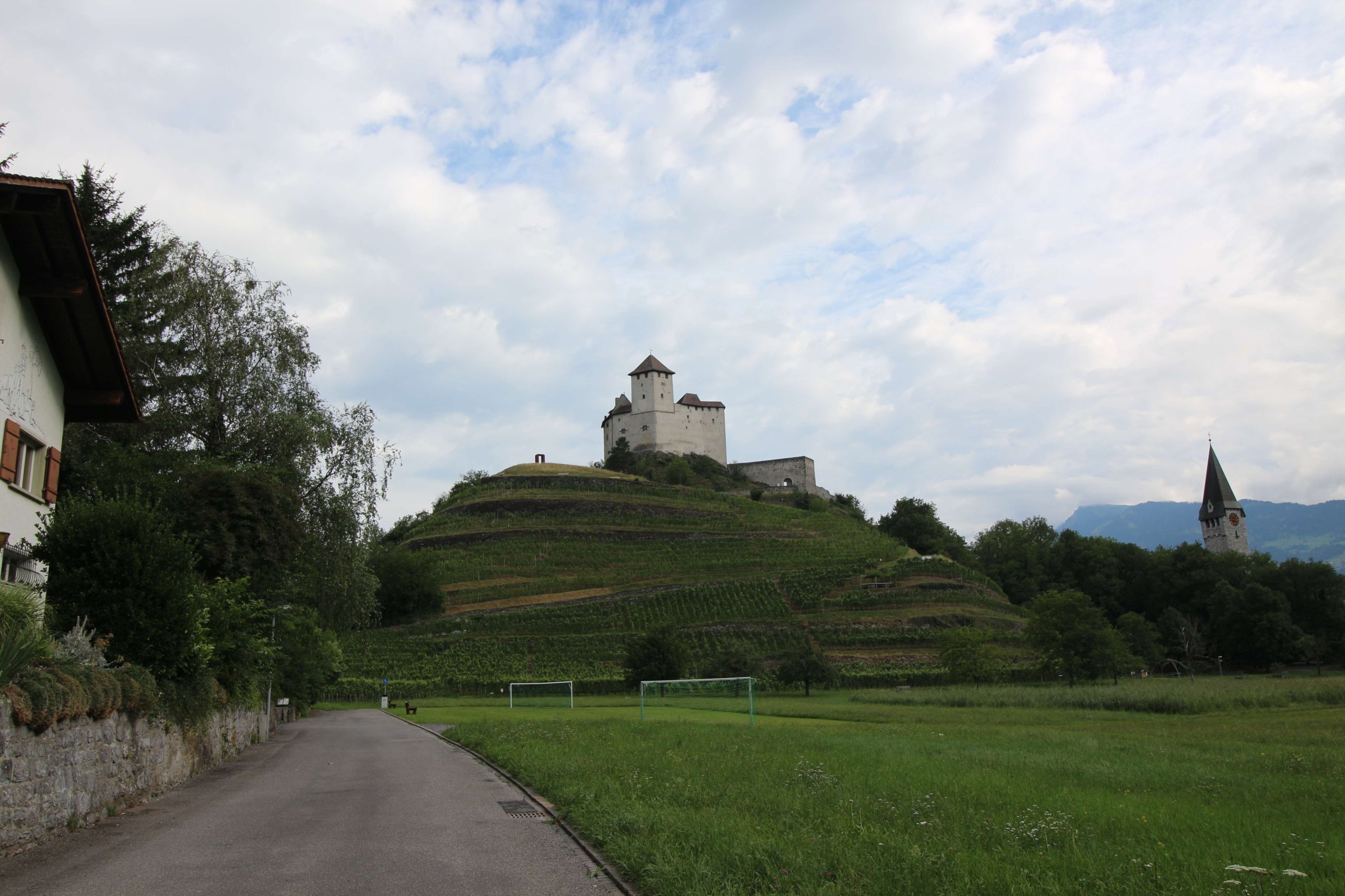 23-е июля. Встали рано утром, раньше всех, и тихонечко уехали, чтобы никого не разбудить. Едем смотреть замок Burg Gutenberg в Лихтенштейне. На улицах никого, так как это утро воскресенья. Подъезжаем мы такие к замку, а там на парковке стоит машина, и поодаль семья фотографируется. Ну мы как-то не обратили внимания на них, и тут они молвят русским голосом нам слова приветствия. Это было неожиданно для нас - мы, посреди безлюдного города у замка, встречаем путешественников, и они, оказывается, из Лобни. Мы немного пообсуждали, где лучше проходить границу, и разошлись в разные стороны парка. В принципе ничего интересного в этом замке я для себя не нашёл.