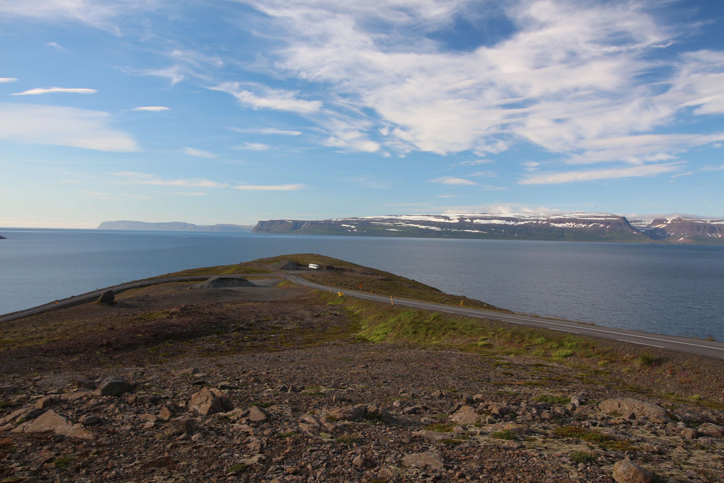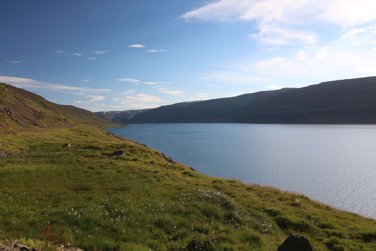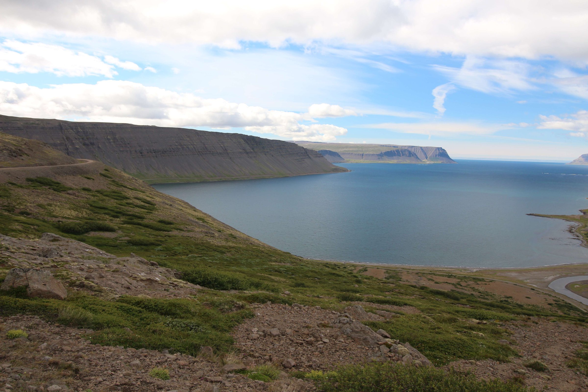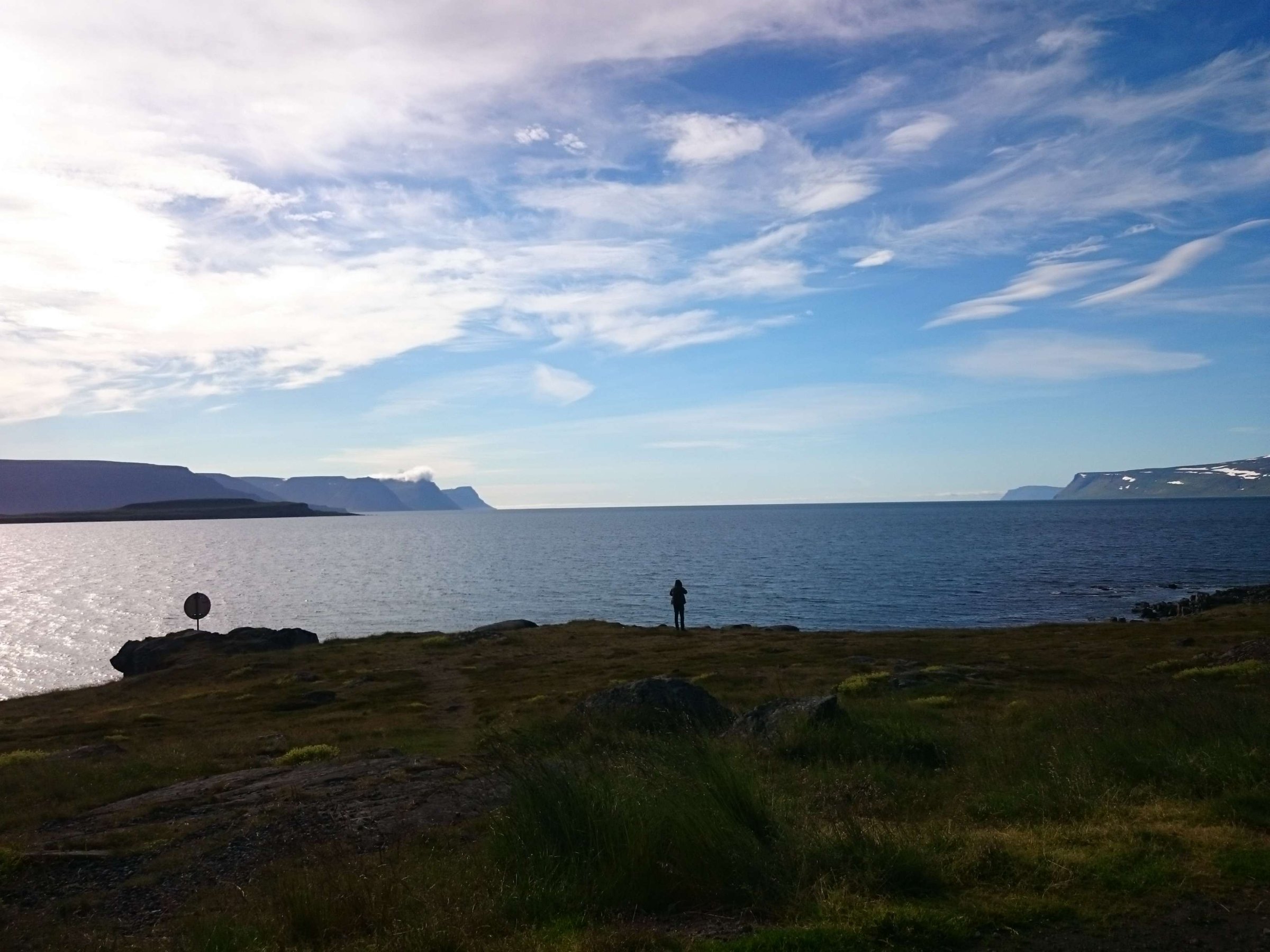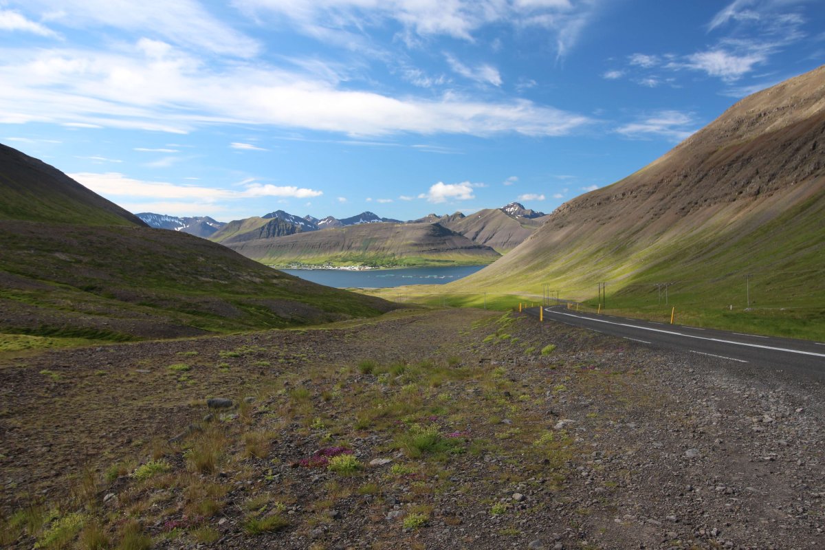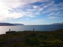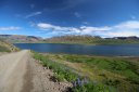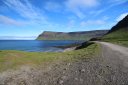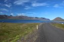 В принципе всё. Нам оставалось теперь ехать в Судавик. Там я забронировал гостиницу, зная, что этой ночью там будет холодно. Едем мы такие по промозглой погоде, дождик иногда хлещет. Мы уже усталые от долгой утомительной дороги. И тут неожиданно мы выезжаем из-за перевала на северо-западные Исландские фьорды, и вдруг тучи рассеиваются, и перед нами прорезается синее небо. Как оказалось, там дождём и не пахнет - не пускают горы. Такую же ситуацию с погодой мы наблюдали на Лофотенах в Норвегии, и красоты там были такие же. Я вот сейчас писал эти слова про Лофотены, а потом заглянул в свой файлик с точками, которые нужно было посетить в Исландии, и вот эти фьорды были мной при планировании отмечены следующим комментарием: "возможно, имеют такую же красоту, как и Лофотены".