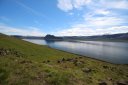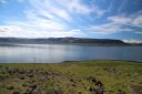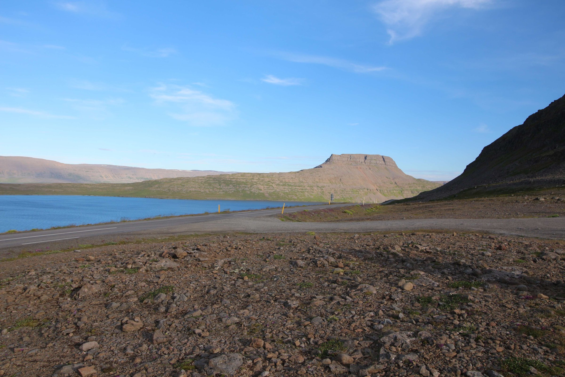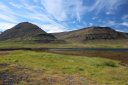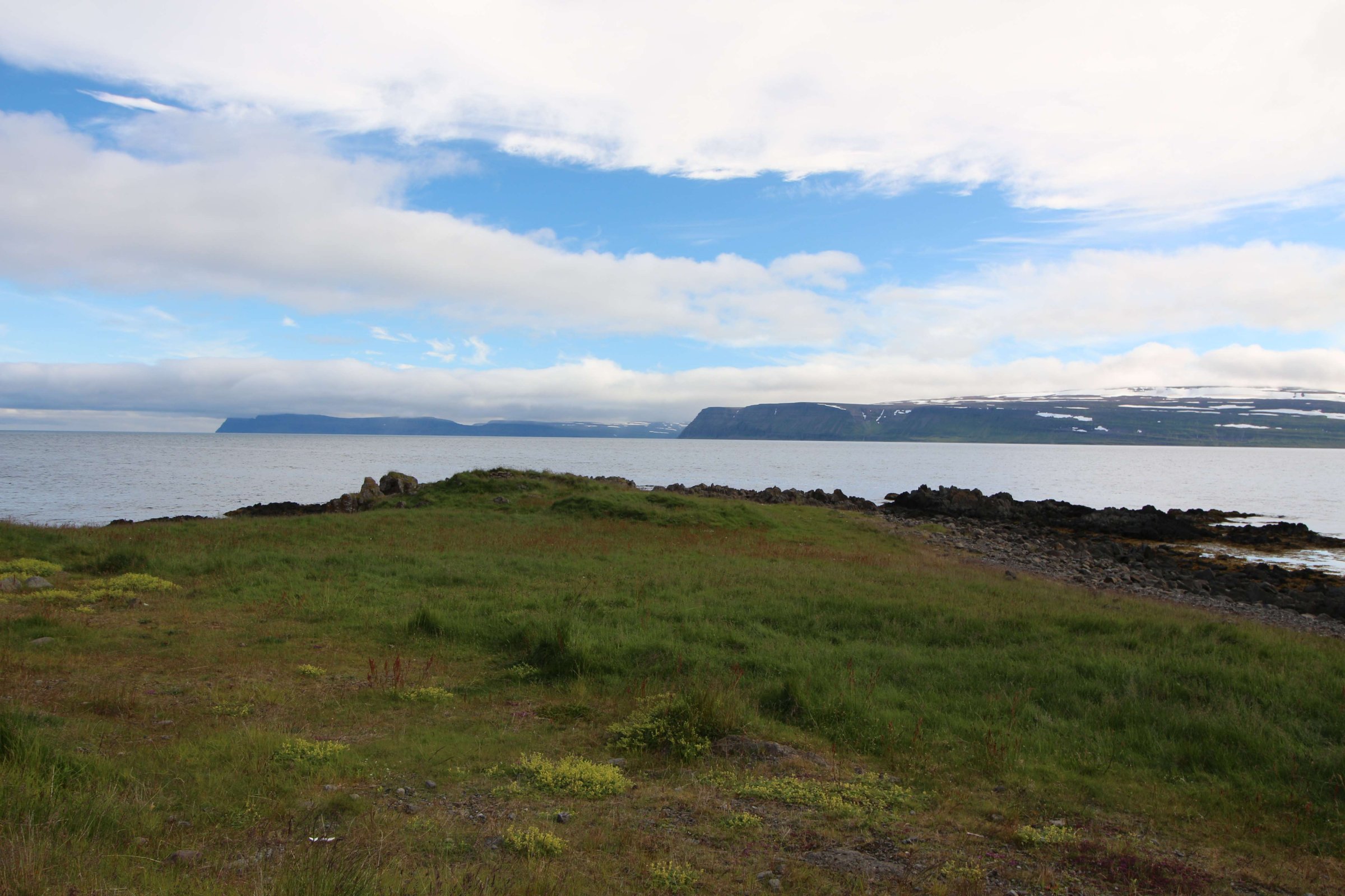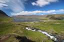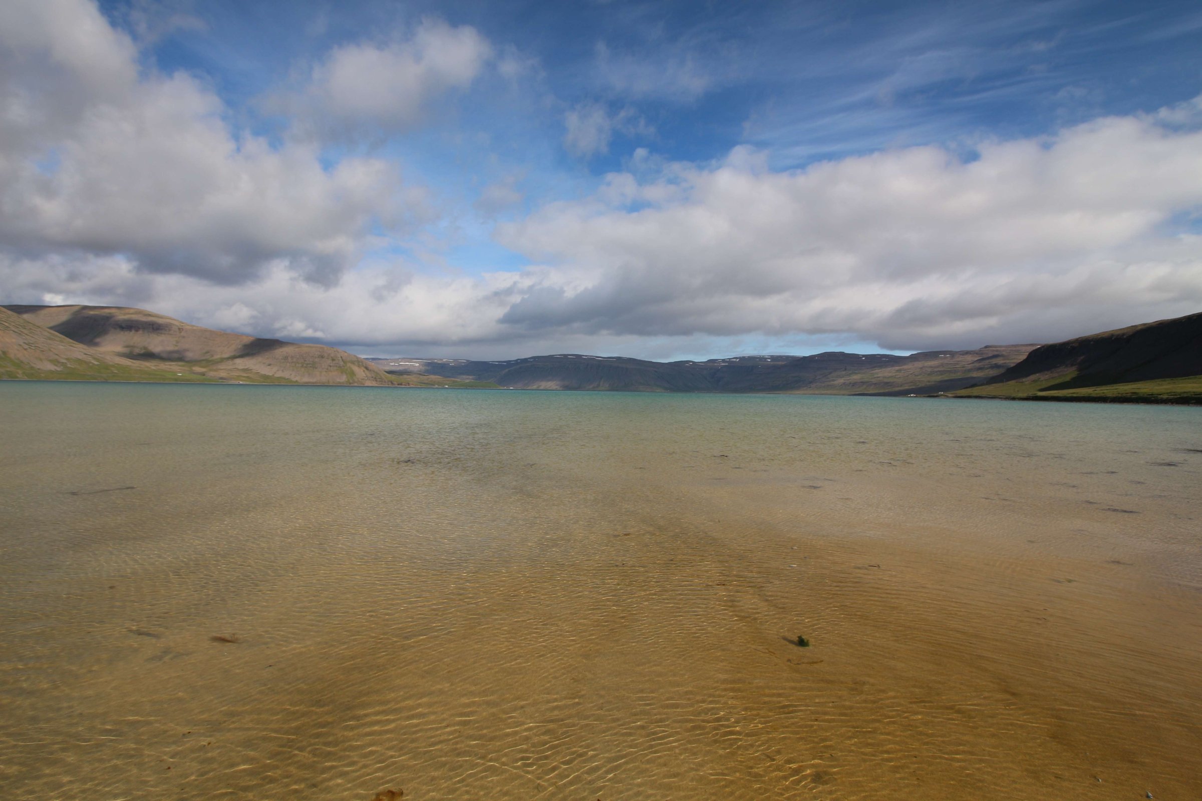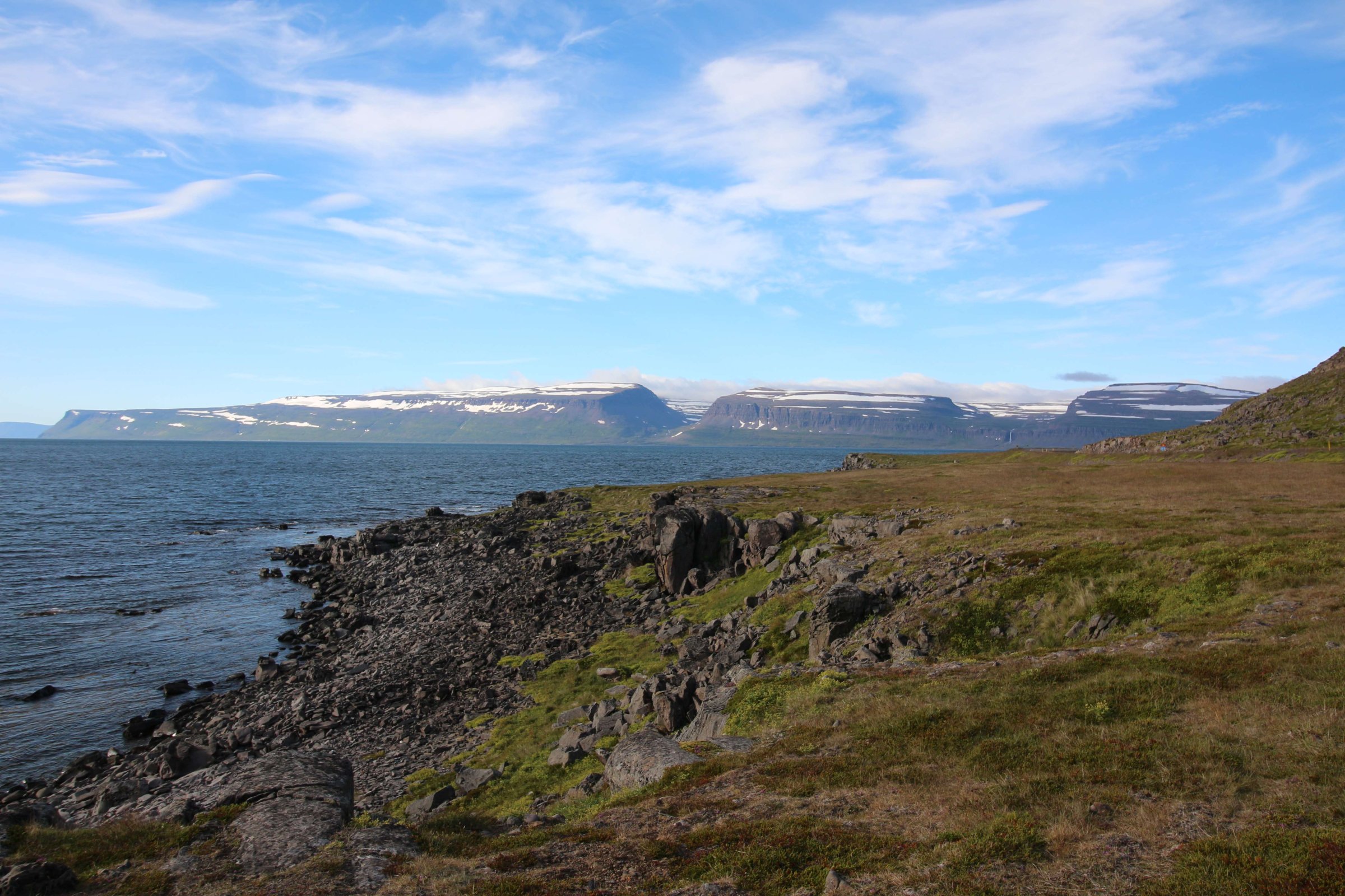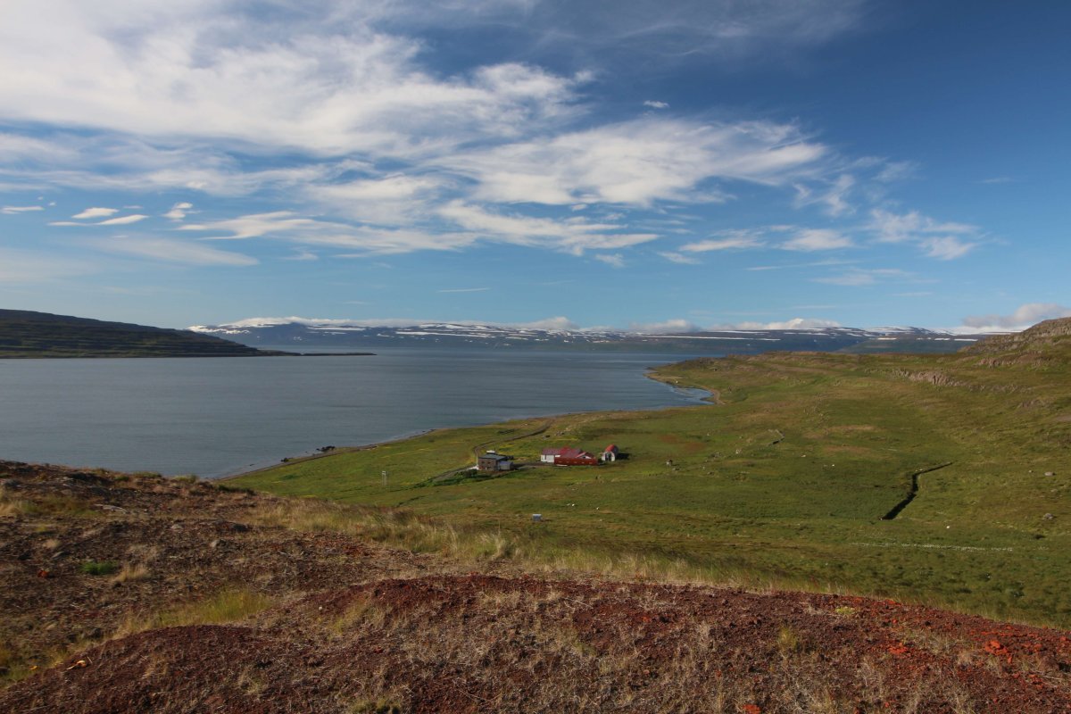В принципе всё. Нам оставалось теперь ехать в Судавик. Там я забронировал гостиницу, зная, что этой ночью там будет холодно. Едем мы такие по промозглой погоде, дождик иногда хлещет. Мы уже усталые от долгой утомительной дороги. И тут неожиданно мы выезжаем из-за перевала на северо-западные Исландские фьорды, и вдруг тучи рассеиваются, и перед нами прорезается синее небо. Как оказалось, там дождём и не пахнет - не пускают горы. Такую же ситуацию с погодой мы наблюдали на Лофотенах в Норвегии, и красоты там были такие же. Я вот сейчас писал эти слова про Лофотены, а потом заглянул в свой файлик с точками, которые нужно было посетить в Исландии, и вот эти фьорды были мной при планировании отмечены следующим комментарием: "возможно, имеют такую же красоту, как и Лофотены".