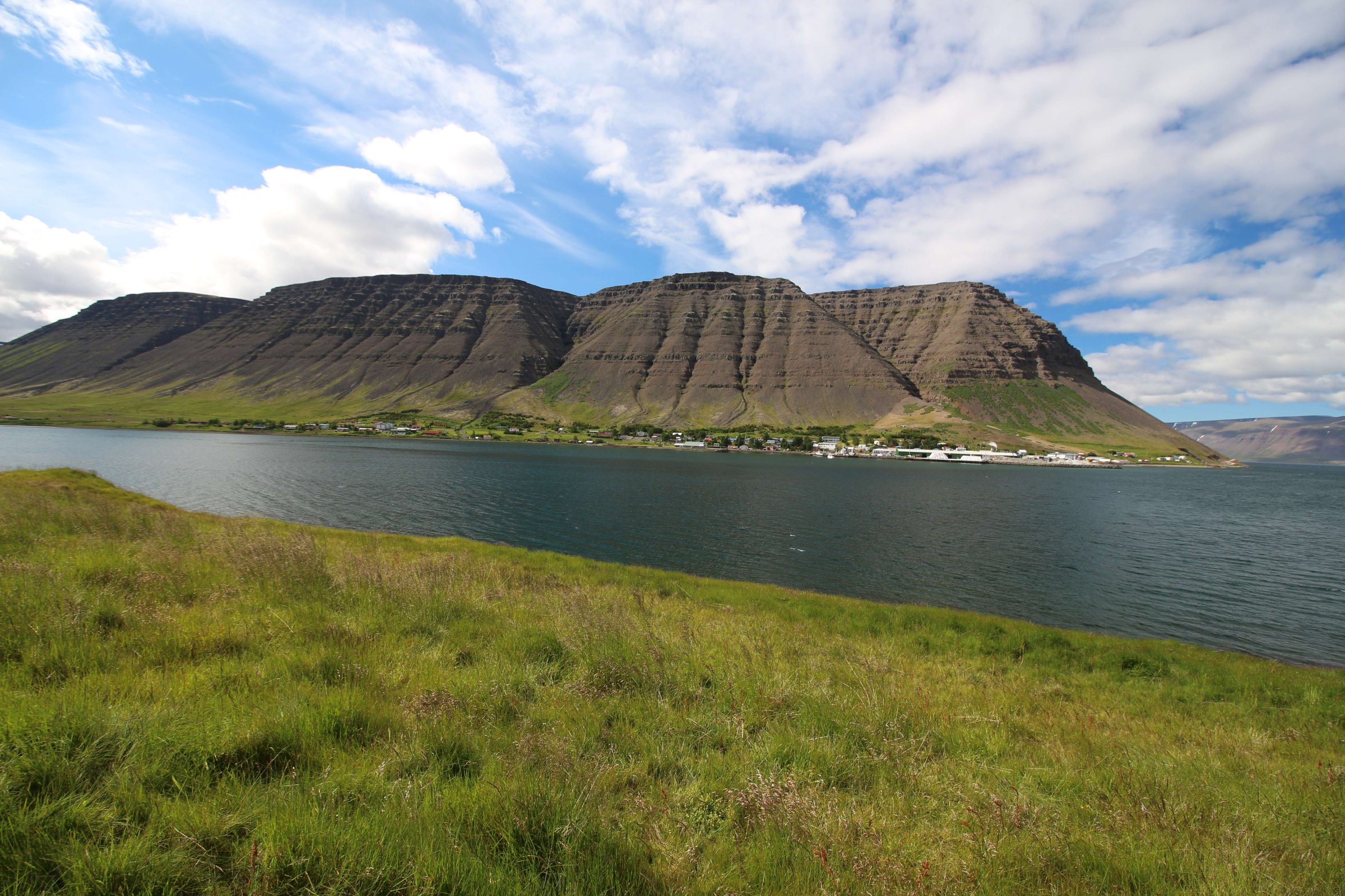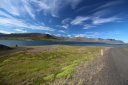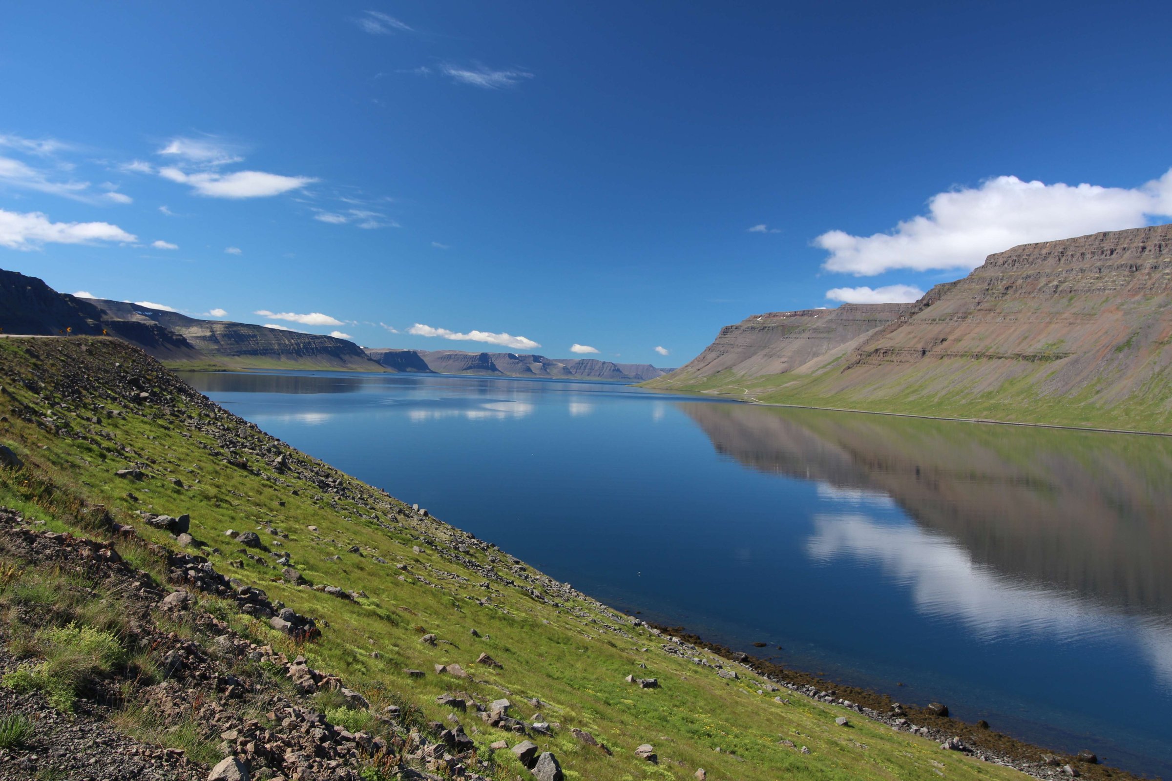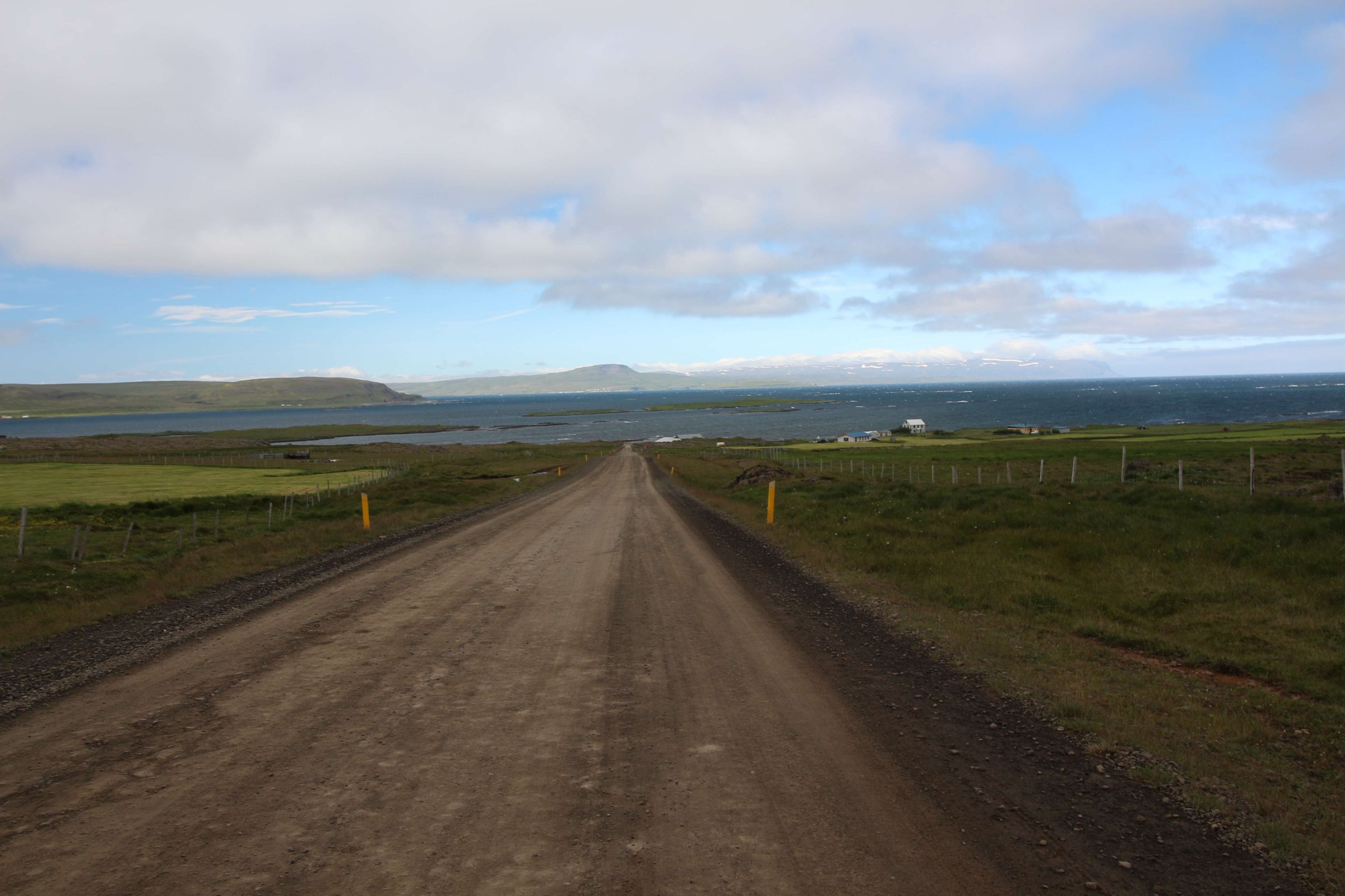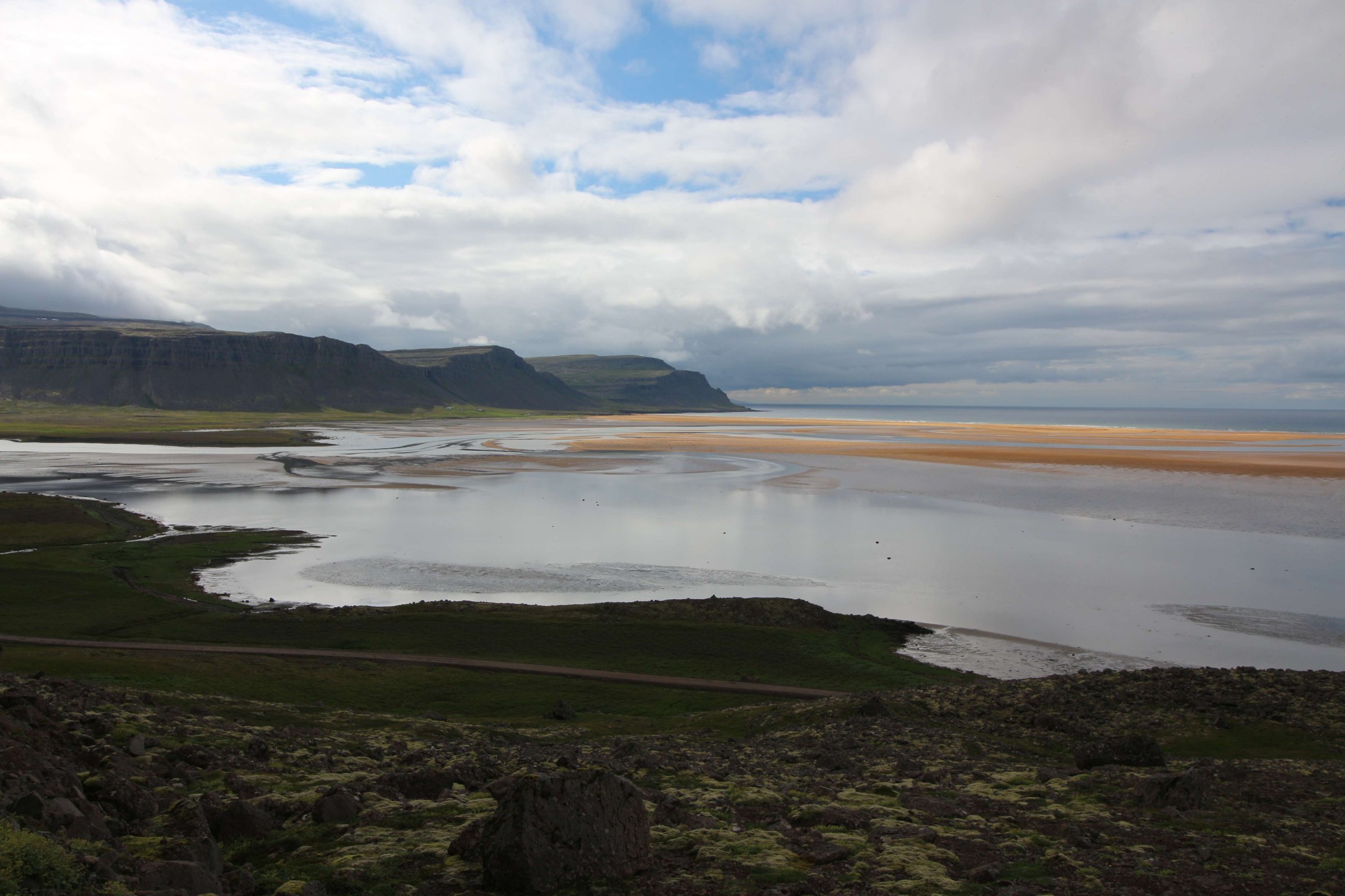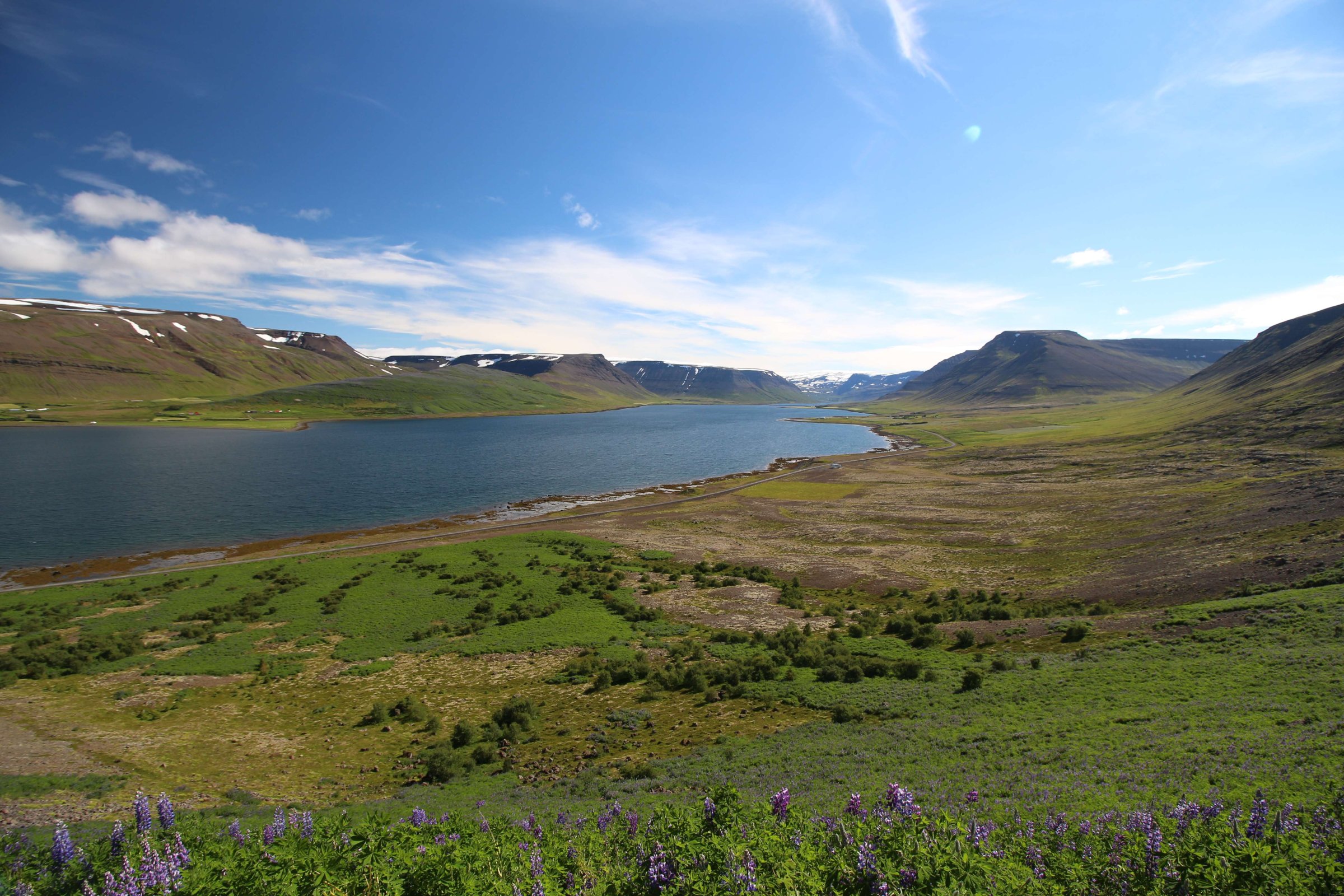 В принципе всё. Нам оставалось теперь ехать в Судавик. Там я забронировал гостиницу, зная, что этой ночью там будет холодно. Едем мы такие по промозглой погоде, дождик иногда хлещет. Мы уже усталые от долгой утомительной дороги. И тут неожиданно мы выезжаем из-за перевала на северо-западные Исландские фьорды, и вдруг тучи рассеиваются, и перед нами прорезается синее небо. Как оказалось, там дождём и не пахнет - не пускают горы. Такую же ситуацию с погодой мы наблюдали на Лофотенах в Норвегии, и красоты там были такие же. Я вот сейчас писал эти слова про Лофотены, а потом заглянул в свой файлик с точками, которые нужно было посетить в Исландии, и вот эти фьорды были мной при планировании отмечены следующим комментарием: "возможно, имеют такую же красоту, как и Лофотены".
