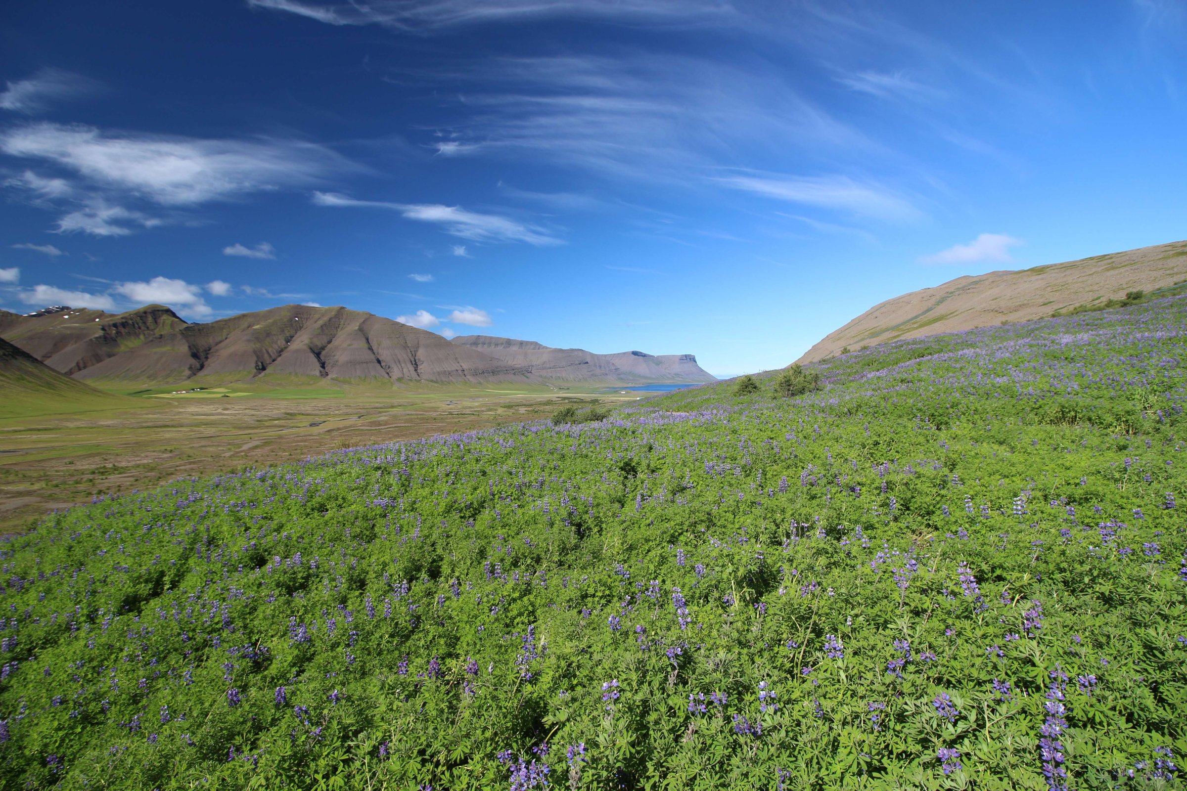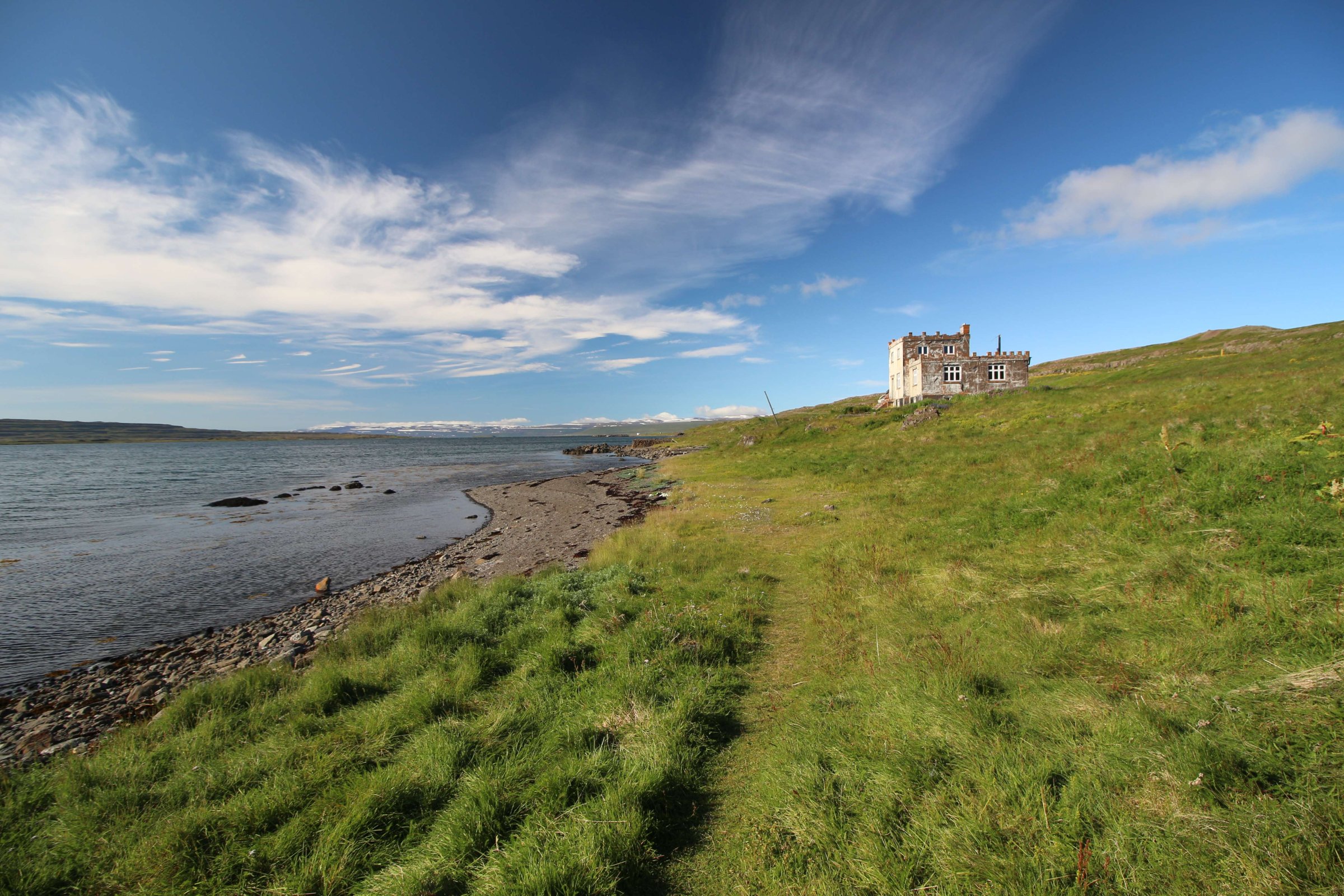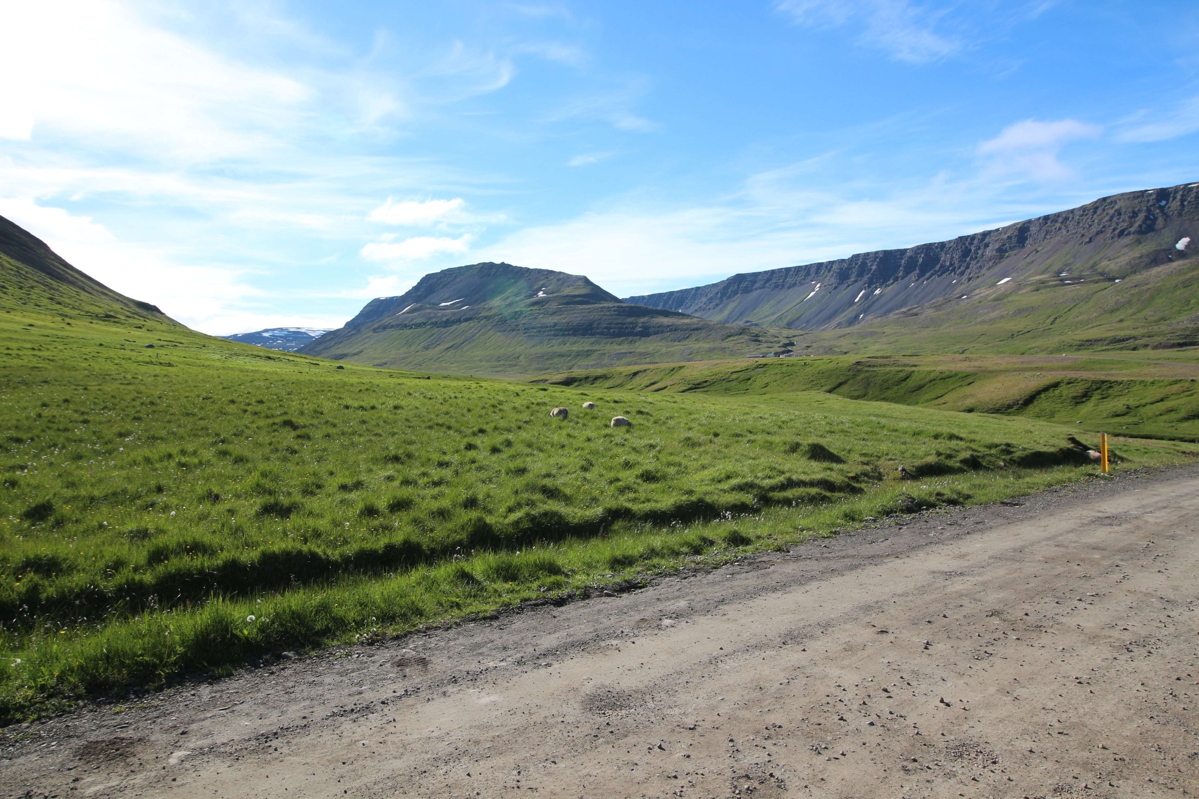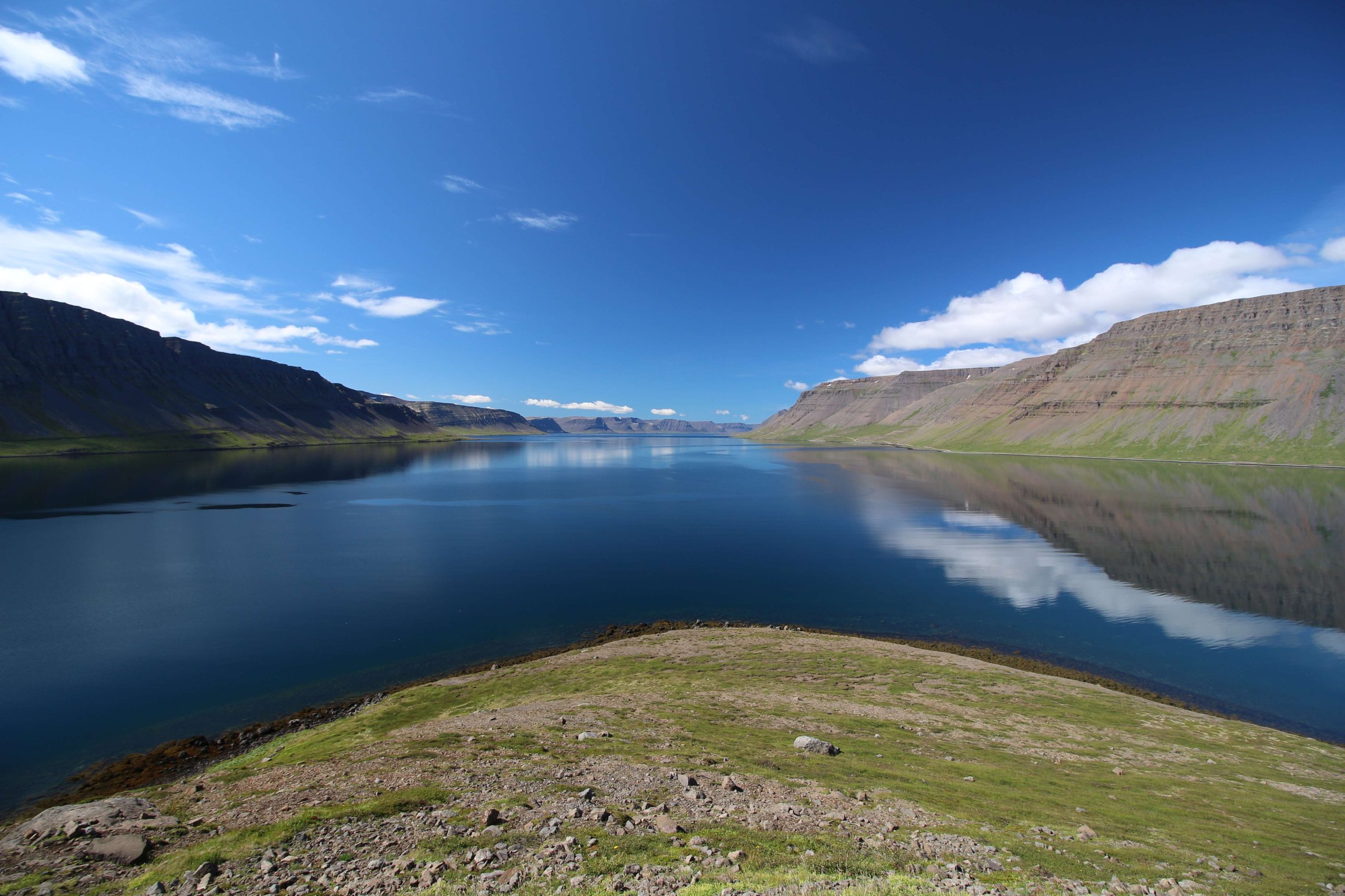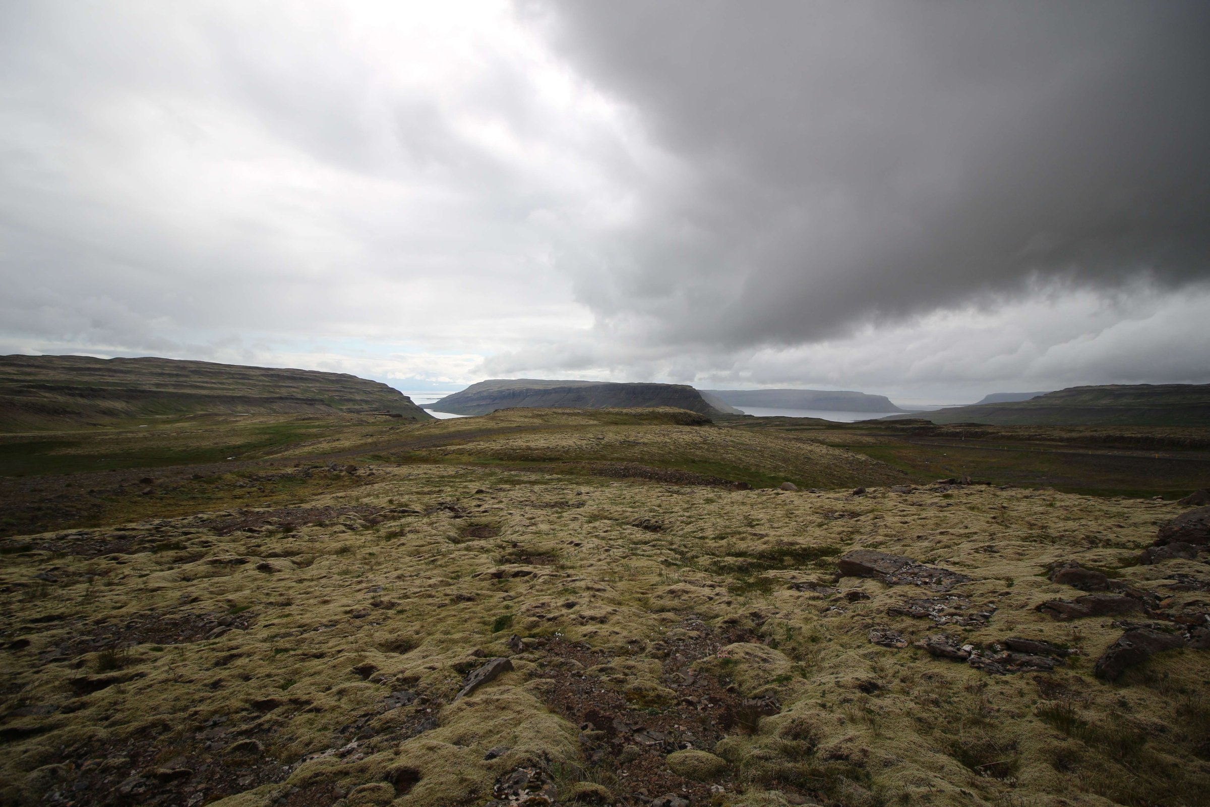 В принципе всё. Нам оставалось теперь ехать в Судавик. Там я забронировал гостиницу, зная, что этой ночью там будет холодно. Едем мы такие по промозглой погоде, дождик иногда хлещет. Мы уже усталые от долгой утомительной дороги. И тут неожиданно мы выезжаем из-за перевала на северо-западные Исландские фьорды, и вдруг тучи рассеиваются, и перед нами прорезается синее небо. Как оказалось, там дождём и не пахнет - не пускают горы. Такую же ситуацию с погодой мы наблюдали на Лофотенах в Норвегии, и красоты там были такие же. Я вот сейчас писал эти слова про Лофотены, а потом заглянул в свой файлик с точками, которые нужно было посетить в Исландии, и вот эти фьорды были мной при планировании отмечены следующим комментарием: "возможно, имеют такую же красоту, как и Лофотены".