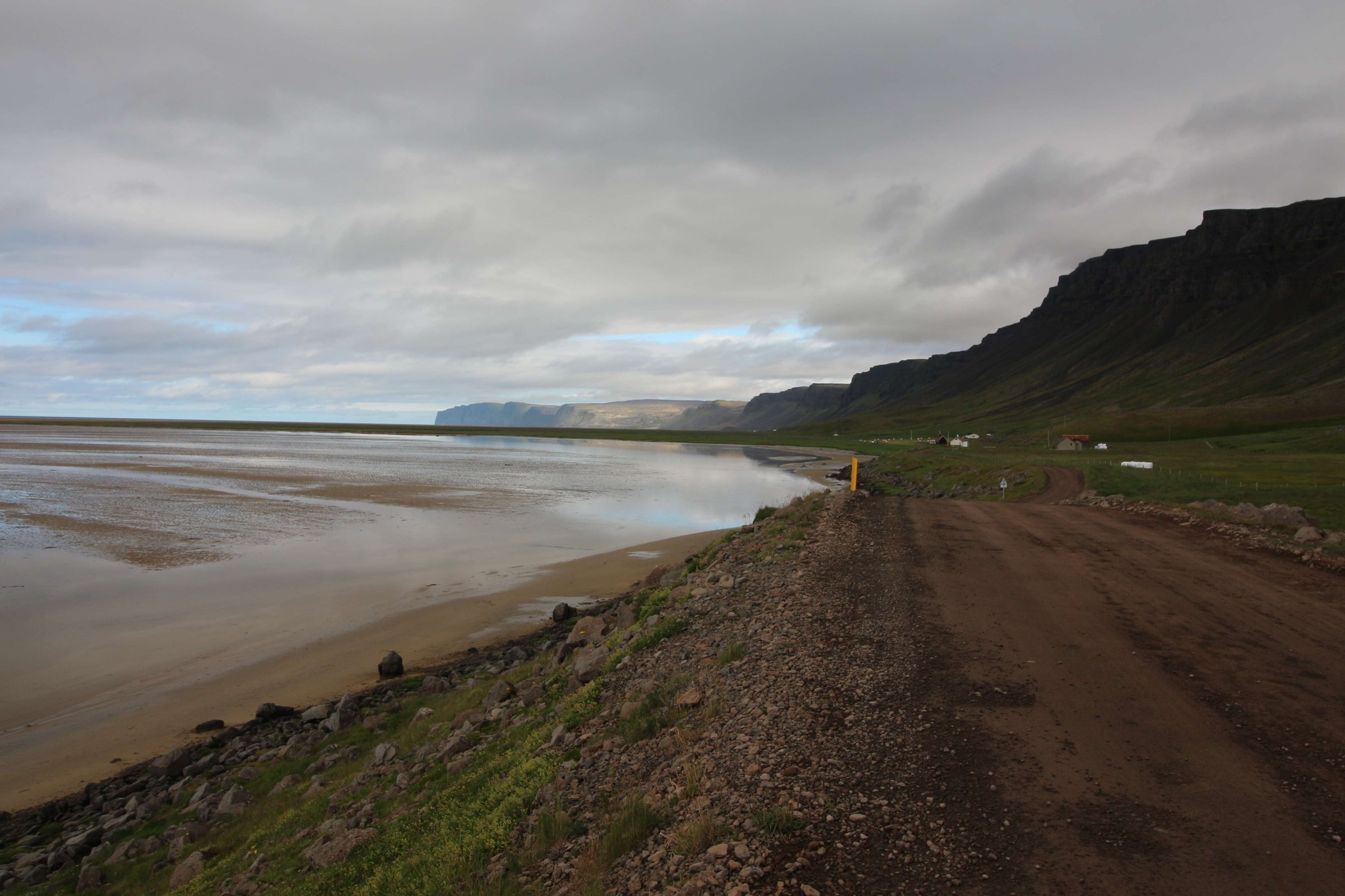 До воды пришлось долго идти по пескам в полутумане. Пока шли, встретили вольно гуляющих коз) После этого пляжа мы долго ехали по фьордам. Погода часто менялась. Как всегда приходилось часто ехать по грунтовке. И один раз мы проехали несколько десятков километров по не очень хорошей дороге. Она была сильно мокрая и сильно грязнила машину. В моей жизни такой грязной не была ни одна из моих машин)