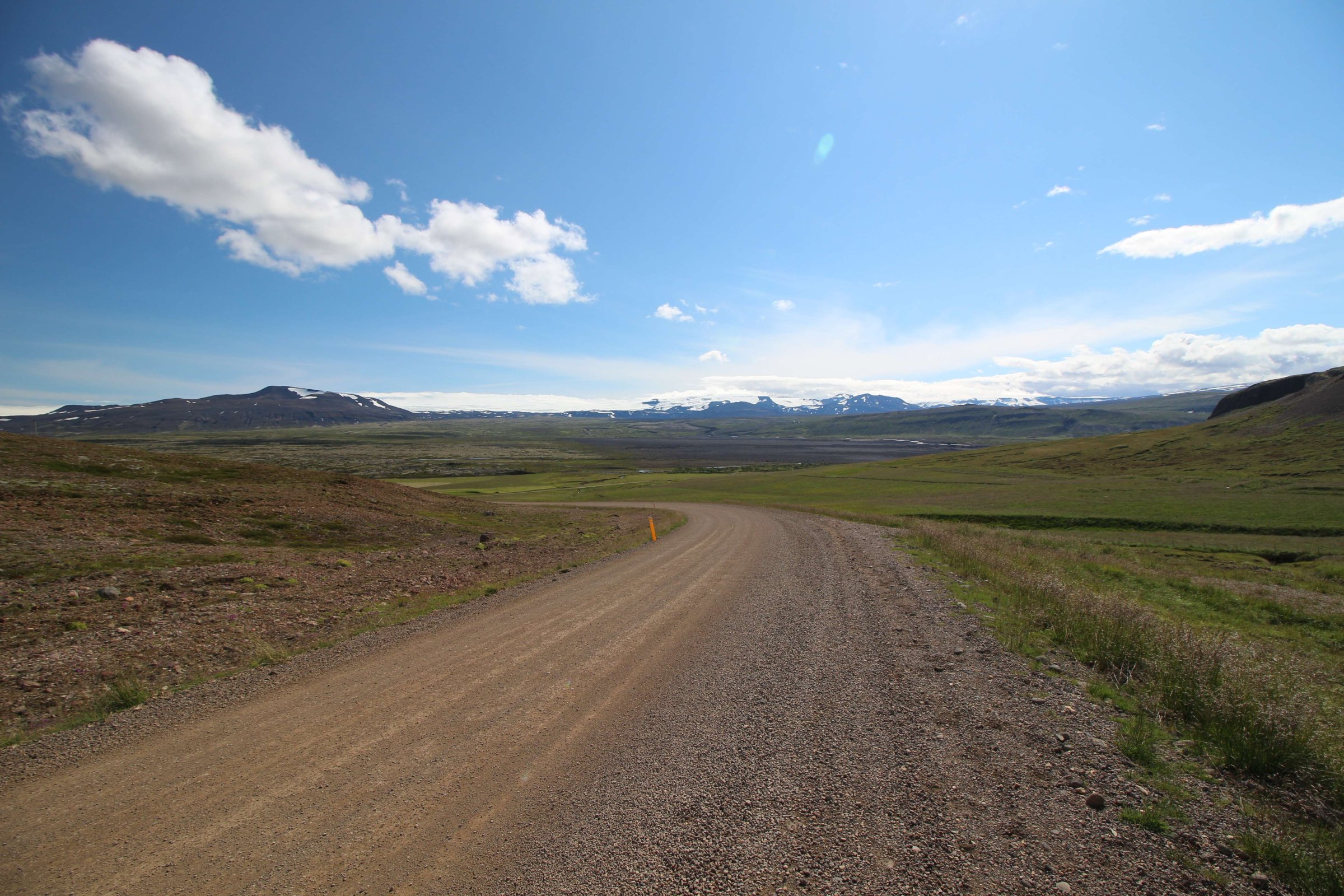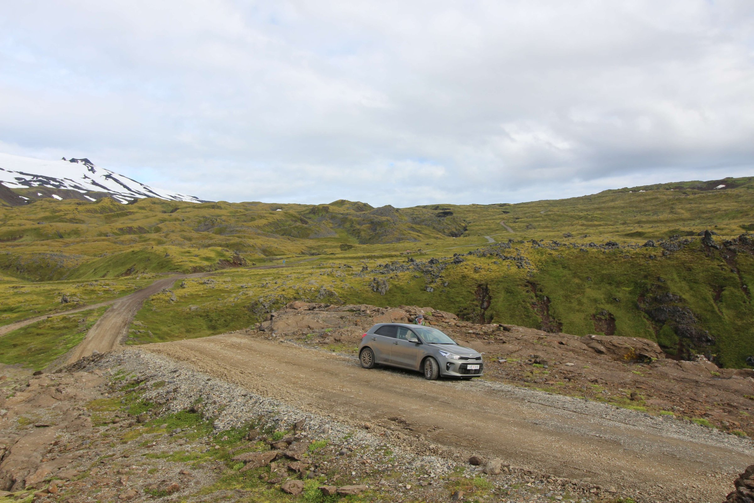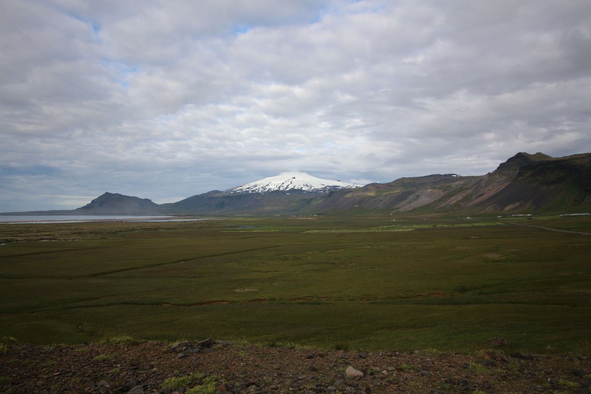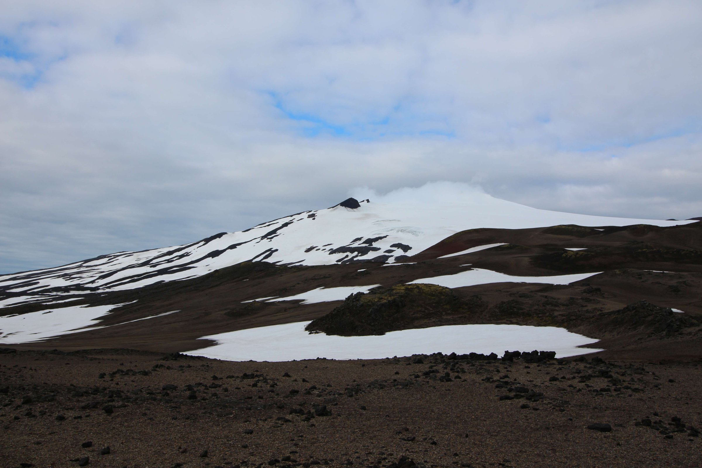 Утро 26-го июля. Встали пораньше и сразу же посмотрели на ледник Снайфедльсйёкюдль. Он был хорошо виден с нашего места в кемпинге. На его шапке было немного облаков. Но так как это было утро, мы предположили, что пока мы до него доедем, облачность на нём полностью расчистится.