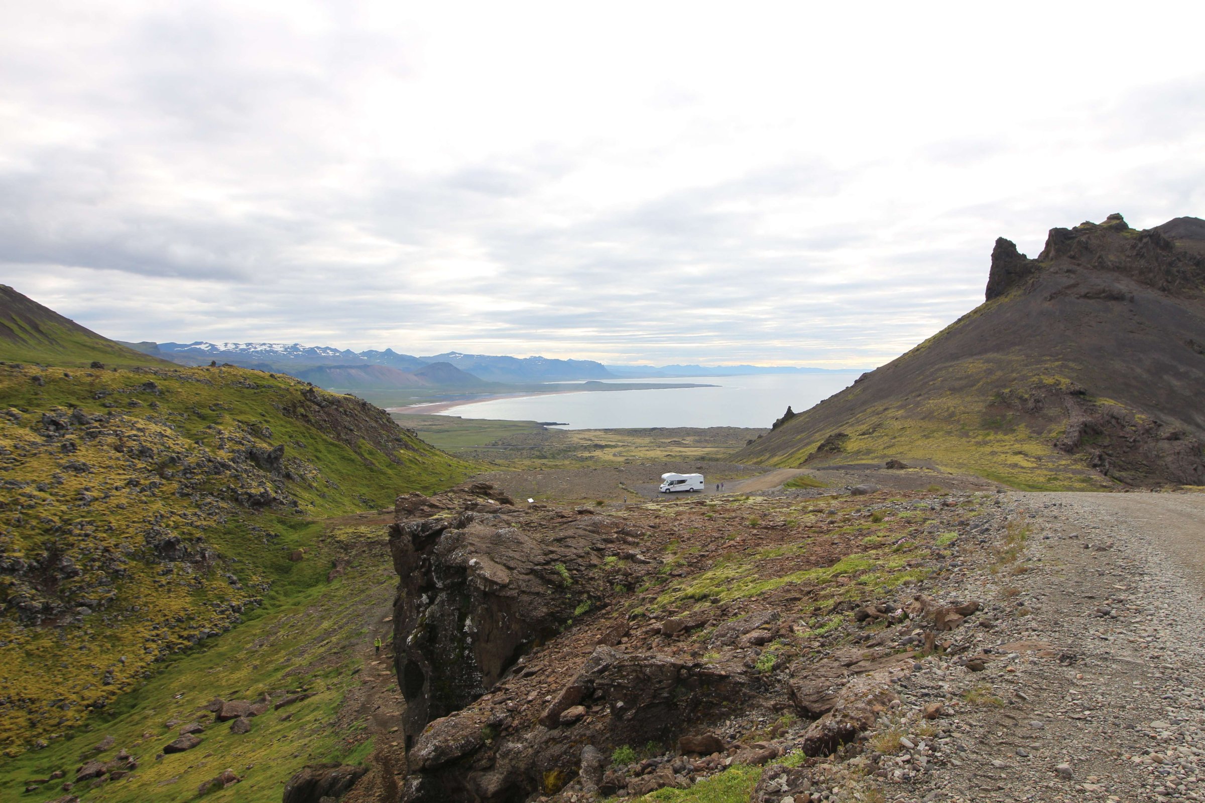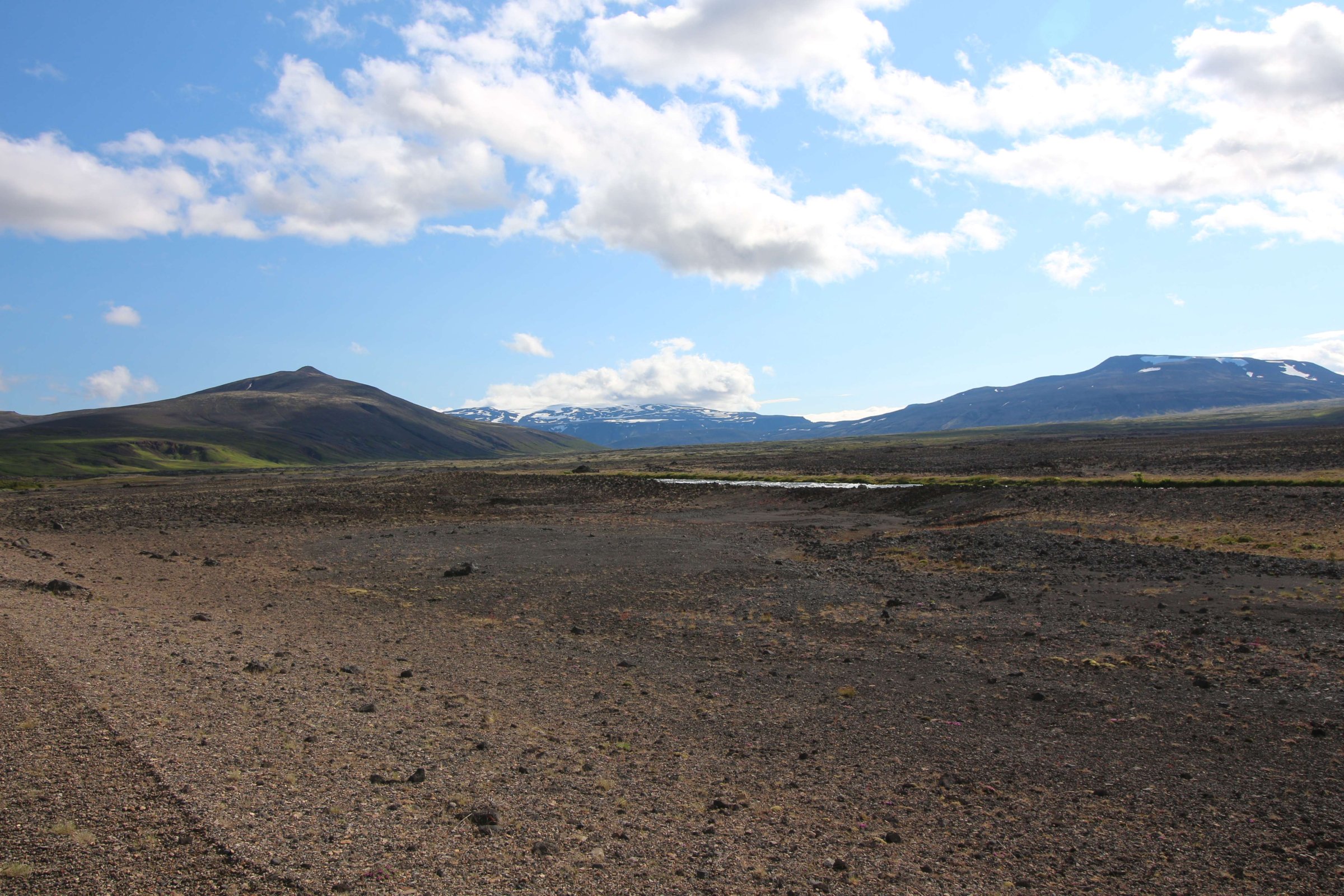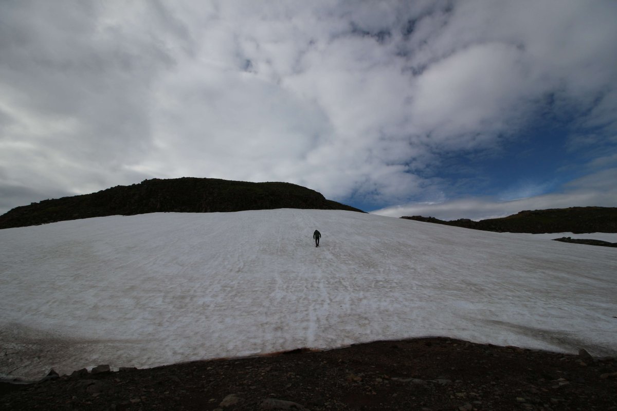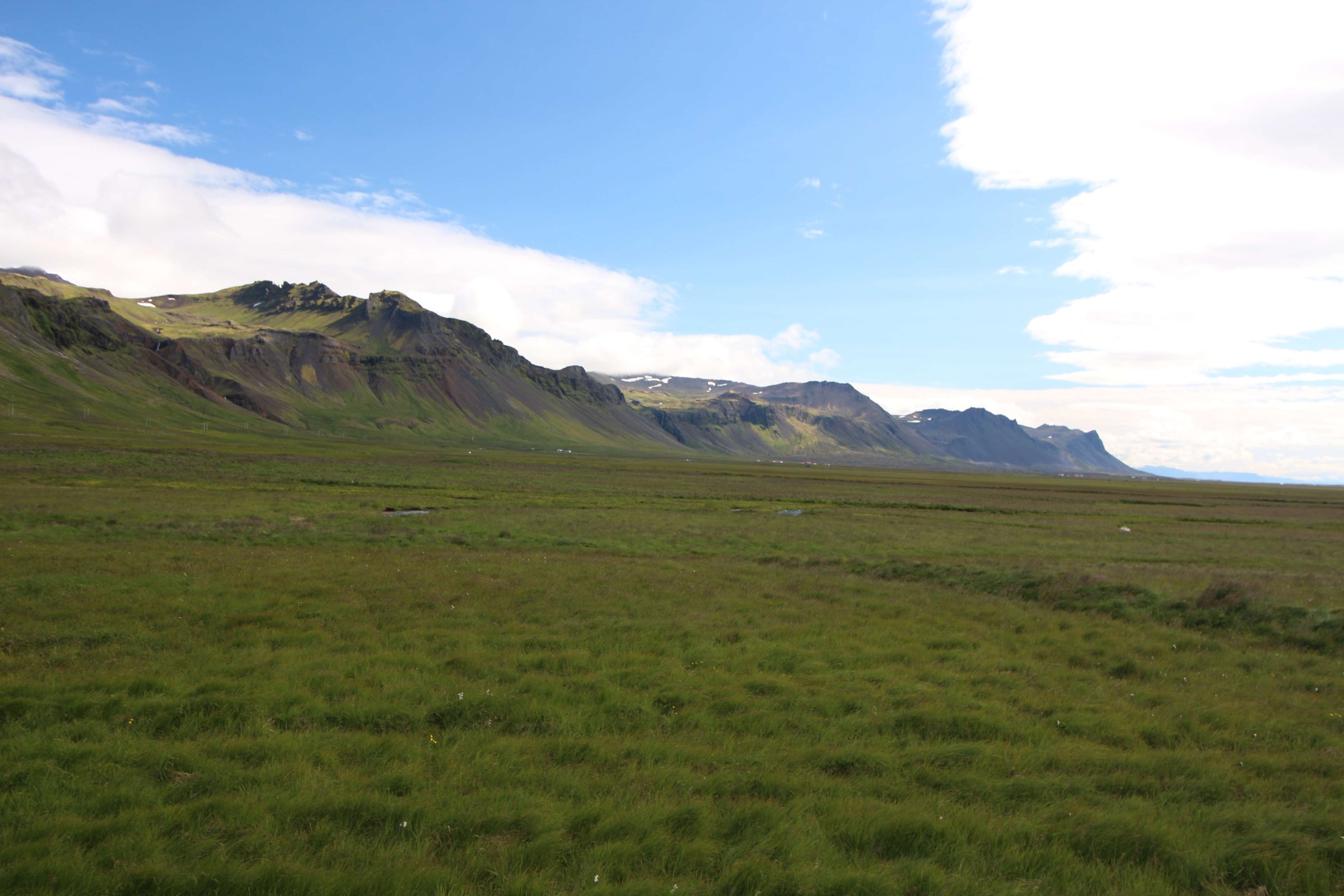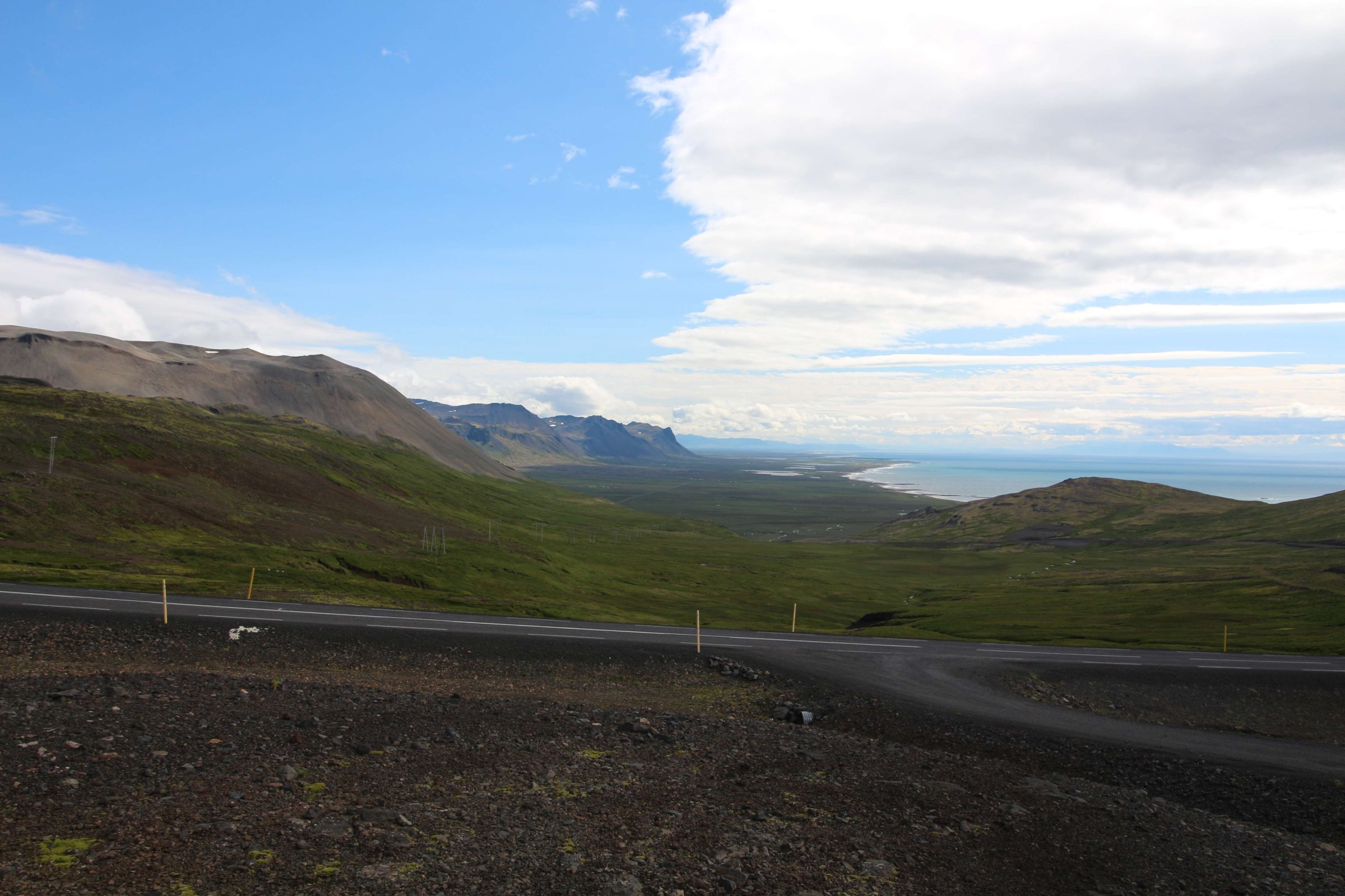 Утро 26-го июля. Встали пораньше и сразу же посмотрели на ледник Снайфедльсйёкюдль. Он был хорошо виден с нашего места в кемпинге. На его шапке было немного облаков. Но так как это было утро, мы предположили, что пока мы до него доедем, облачность на нём полностью расчистится.