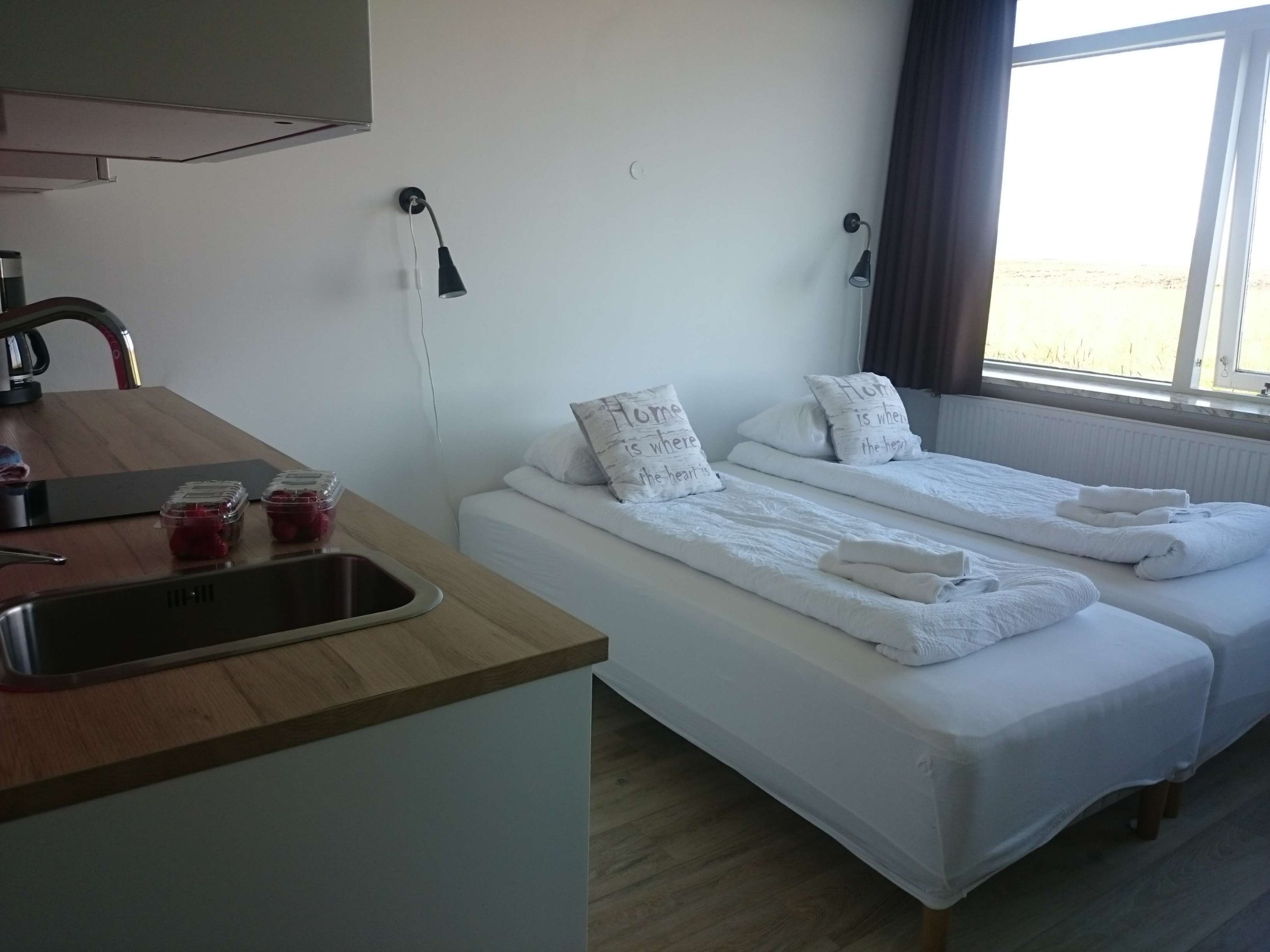 Проехались по первому и последнему платному туннелю в Исландии, не доезжая 30 км до Рейкьявика. Он стоил около 600 руб. (1000 ISK). Дальше мы отправились на заселение в городок Стоксейри. Там я забронировал недорогой (по меркам Исландии) отель. Как обычно он стоил в районе 75 евро. Но из всех отелей Исландии, в которых мы останавливались, это был, пожалуй, один из самых лучших. Сейчас расскажу, какая там система. Для того чтобы заселиться, надо написать в вотсап менеджеру. Он высылает номер комнаты и код. Входим в пустое здание, подходим к своему номеру. Там рядом с дверью висит коробочка, на которой надо набрать (накрутить) присланный код. После чего коробочка открывается, и мы получаем ключ. Отпираем дверь. А за дверью, как оказывается, находятся самые комфортабельные условия. Это, можно сказать, однокомнатная квартира (студия). Там есть всё: туалет, душ, кухня, спальня.