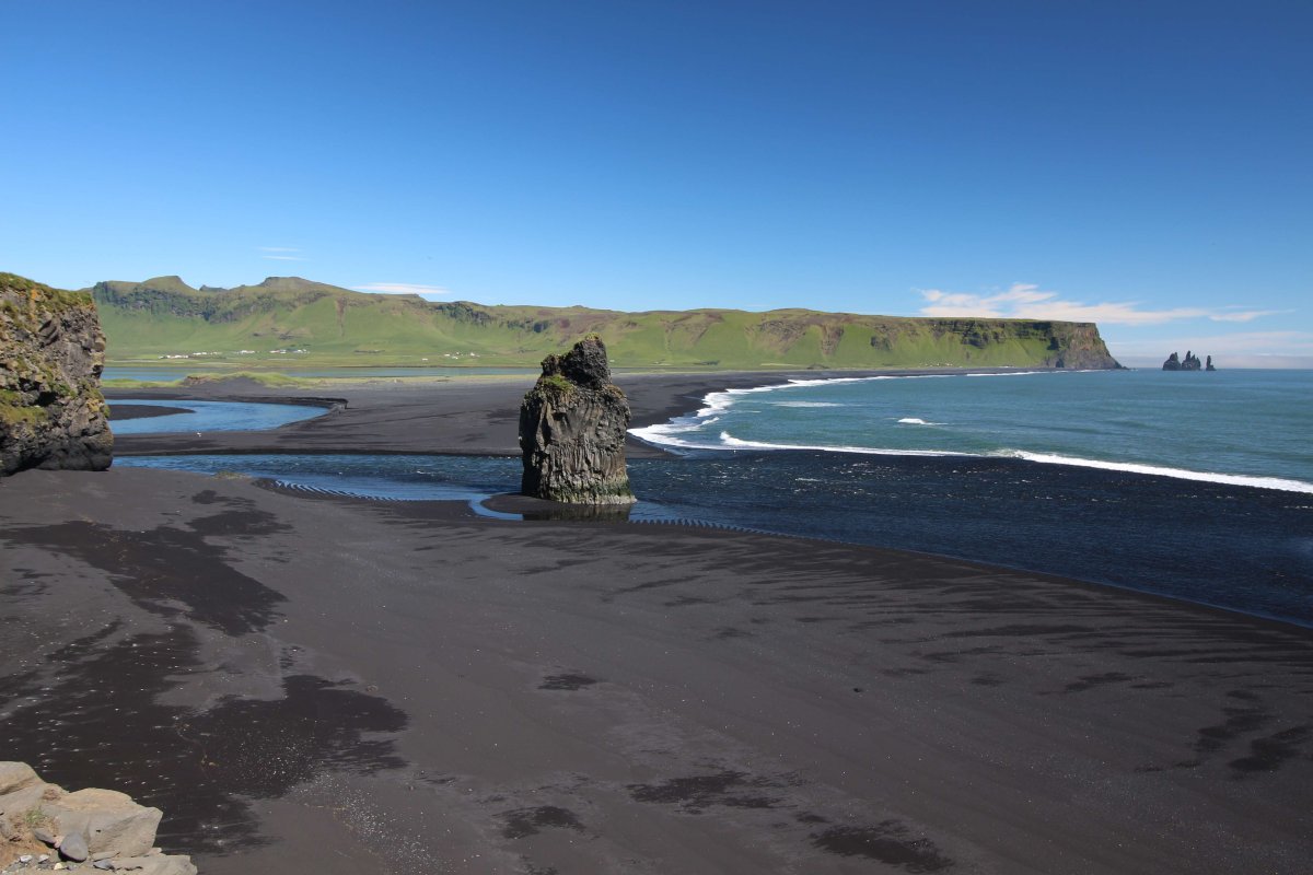 Едем дальше. По пути останавливаемся на готовку и перекус жареной картошечкой, а после едем поближе к городу Vik на красивый пляж с вот такой известной скалой: