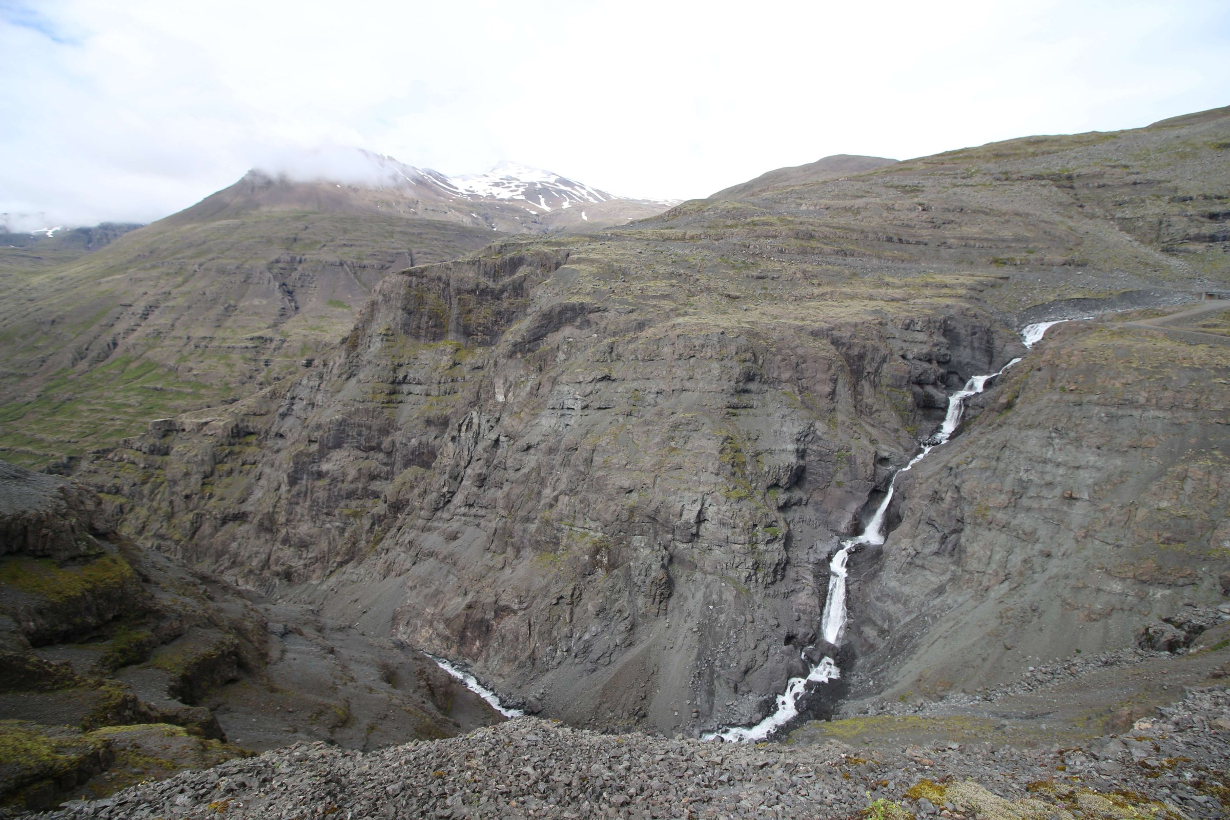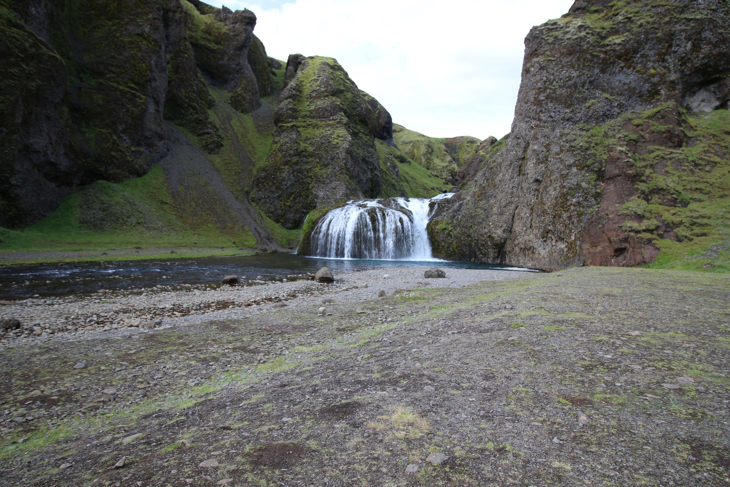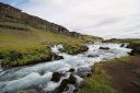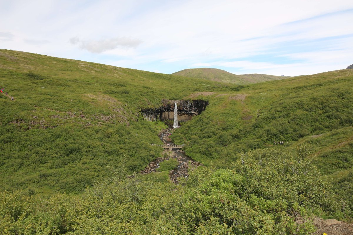 Едем дальше. По пути у нас красивый водопад, парковка платная. Проезжаем её, едем на вторую. Паркуемся и не находим место, где оплатить. Ставим машину и идем в горы. По пути начинаем снимать теплую одежду. В какой-то момент я уже шел в футболке, первый раз в Исландии. Довольно быстро проходим пару км в гору, и вот мы недалеко от этого красивого водопада.