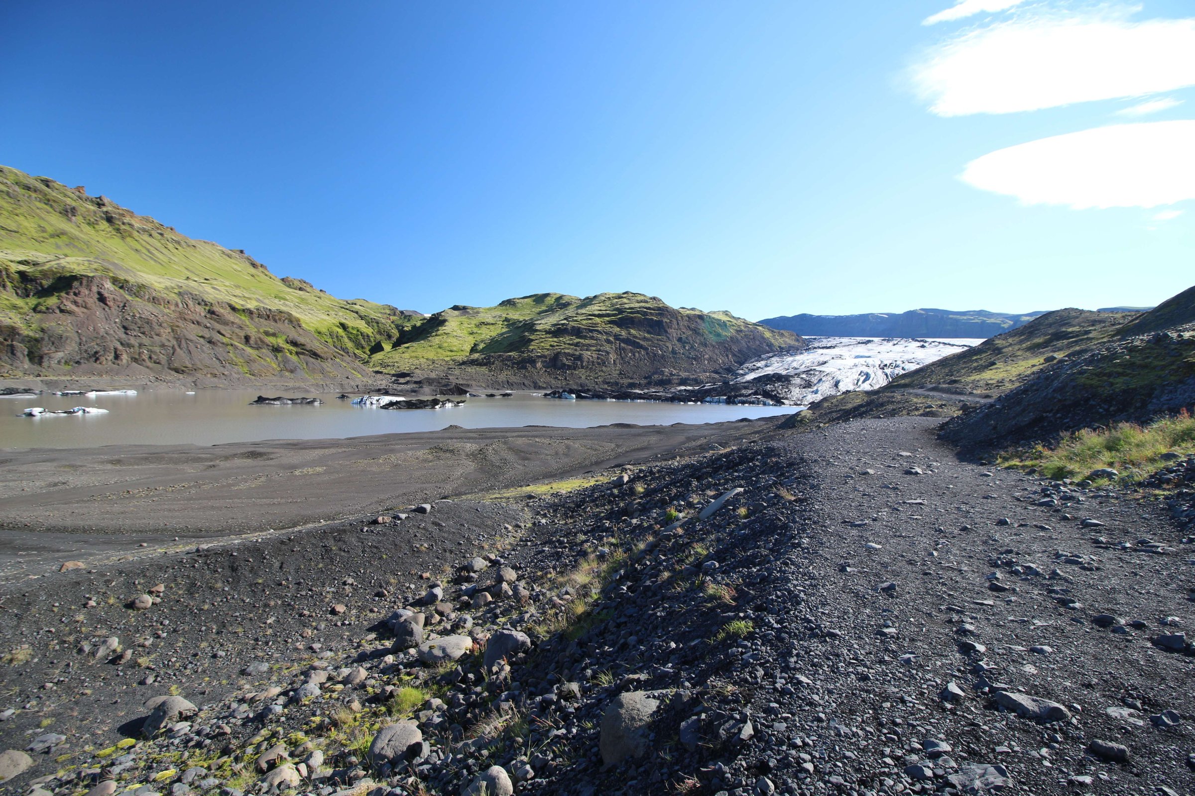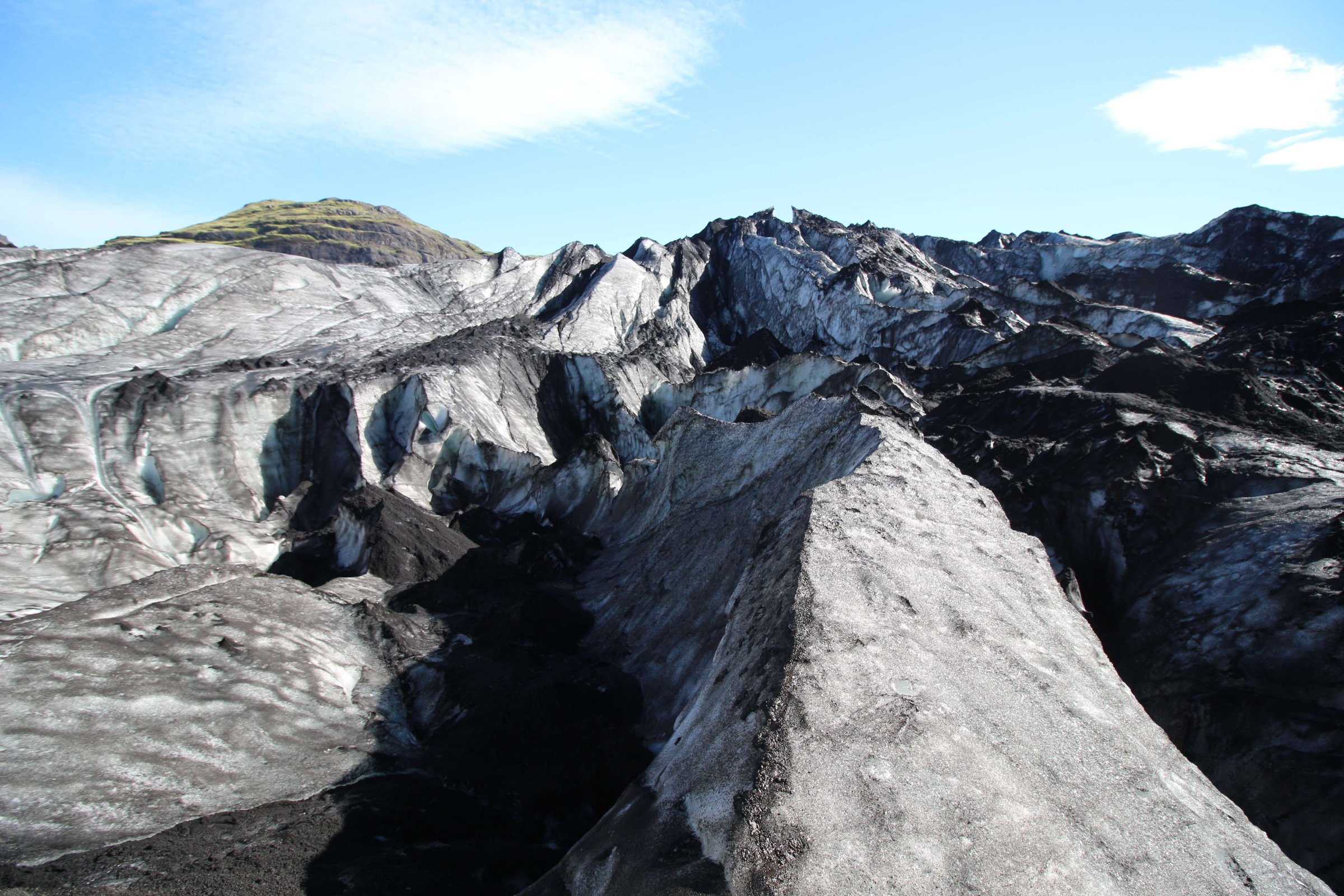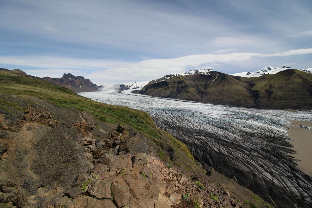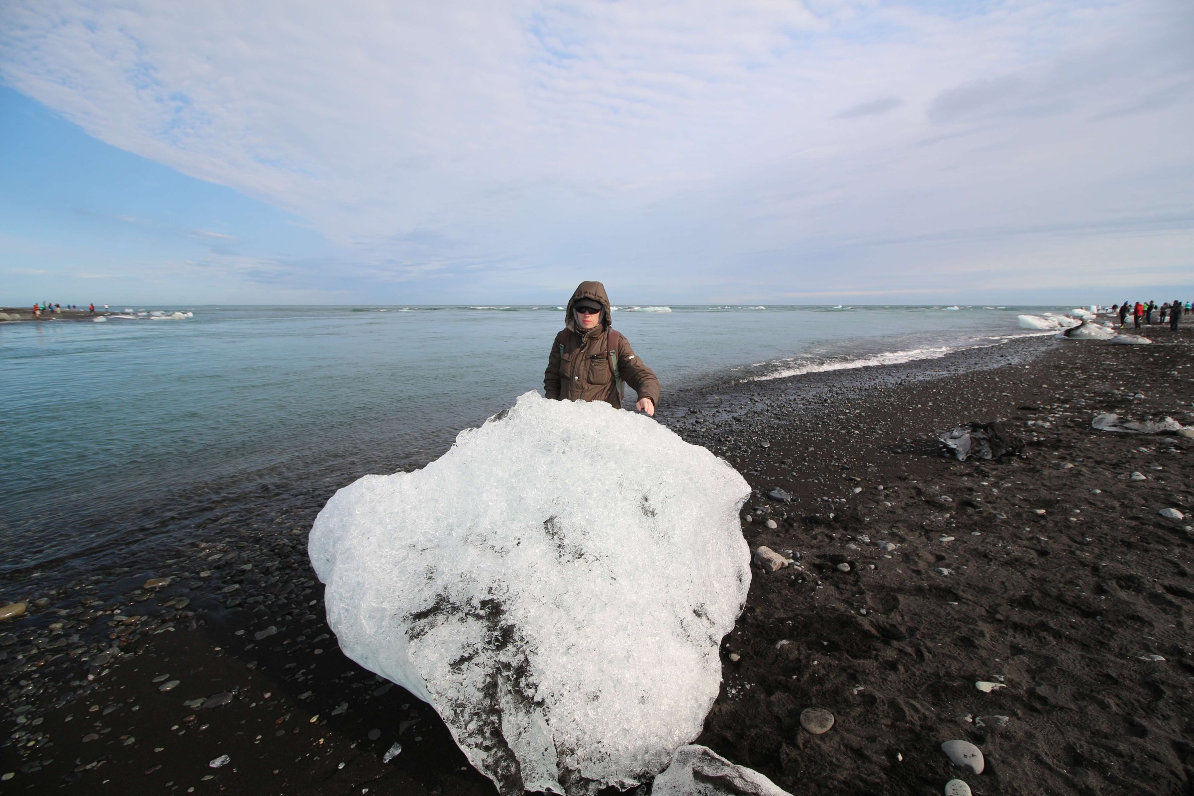 Собрались, заправились водой и поехали дальше по нашему маршруту. Путь предстоял долгий. Добрались до первой точки, но там надо было еще где-то около километра идти пешком. Пошли. На полпути я понял, что оставил документы и деньги в машине. Плюнули на них и пошли дальше) это же Исландия. Напомню, что в Новой Зеландии, в Окленде, где полно шляющихся без дела Маори, наровящих кого-то обокрасть, нас всё-таки обокрали. Разбили окно в машине на парковке и вытащили некоторые вещи. Вот так. В общем, здесь мы дошли до ледника. Сначала мы хотели близко к нему не подходить, а потом всё-таки решили, что ничего в нём экстремального нет, и поэтому подошли к его началу. Но на сам ледник мы не поднимались. Народу там было очень мало.