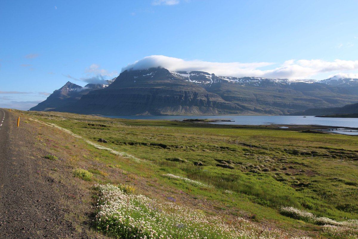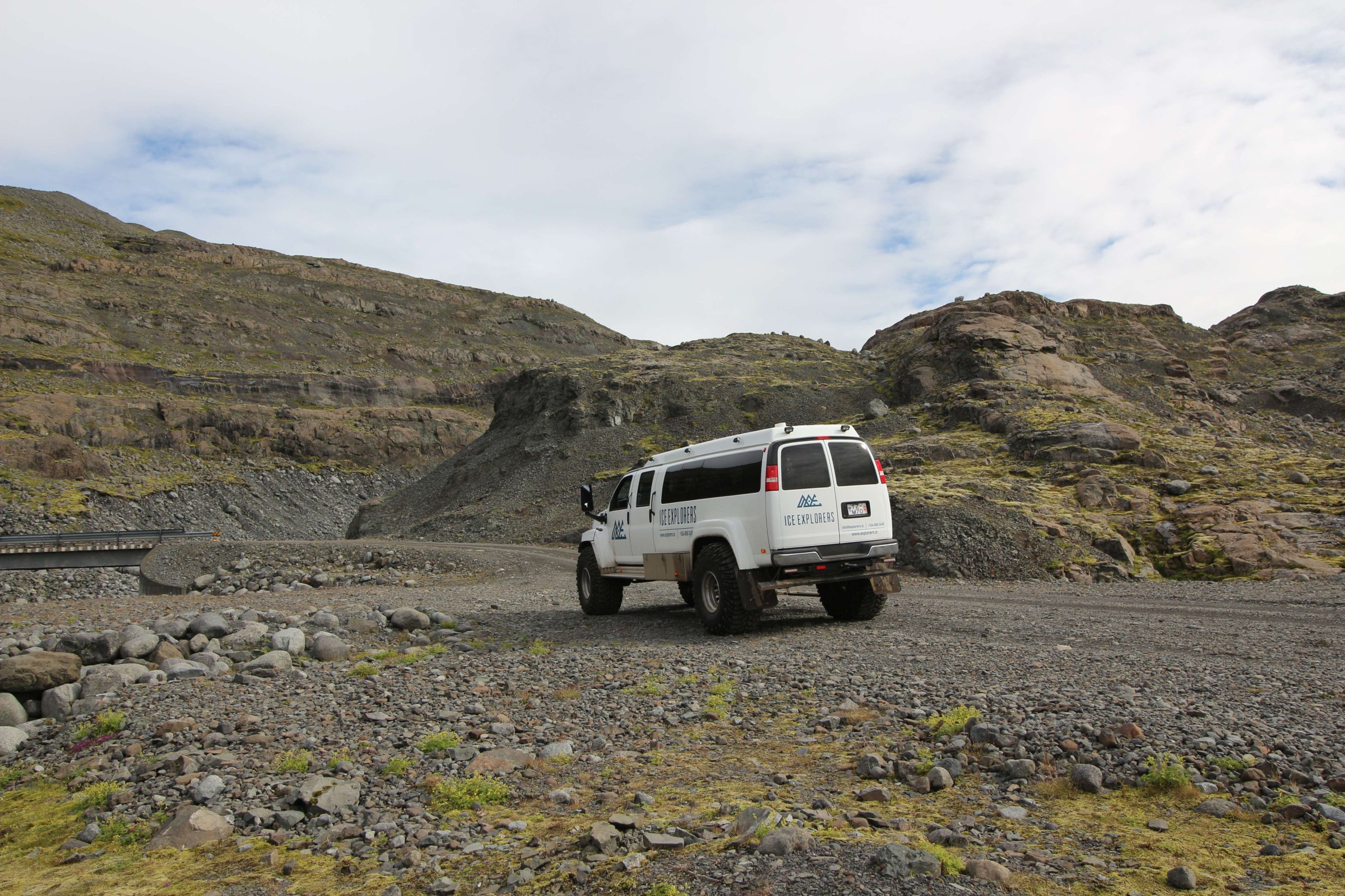 На этом джипе мы сначала проехали по обычной дороге, а потом заехали на F-дорогу, ведущую в гору. В принципе она была крутой, так что мы на своей Киа не рискнули бы туда забраться. По дороге мы встретили двух старушек на Дастере. Не знаю, как им было не стремно ехать по такой дороге. В какой-то момент мы проехали мимо места с видом на ледник. На него мы впоследствии должны будем заехать.