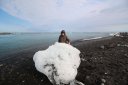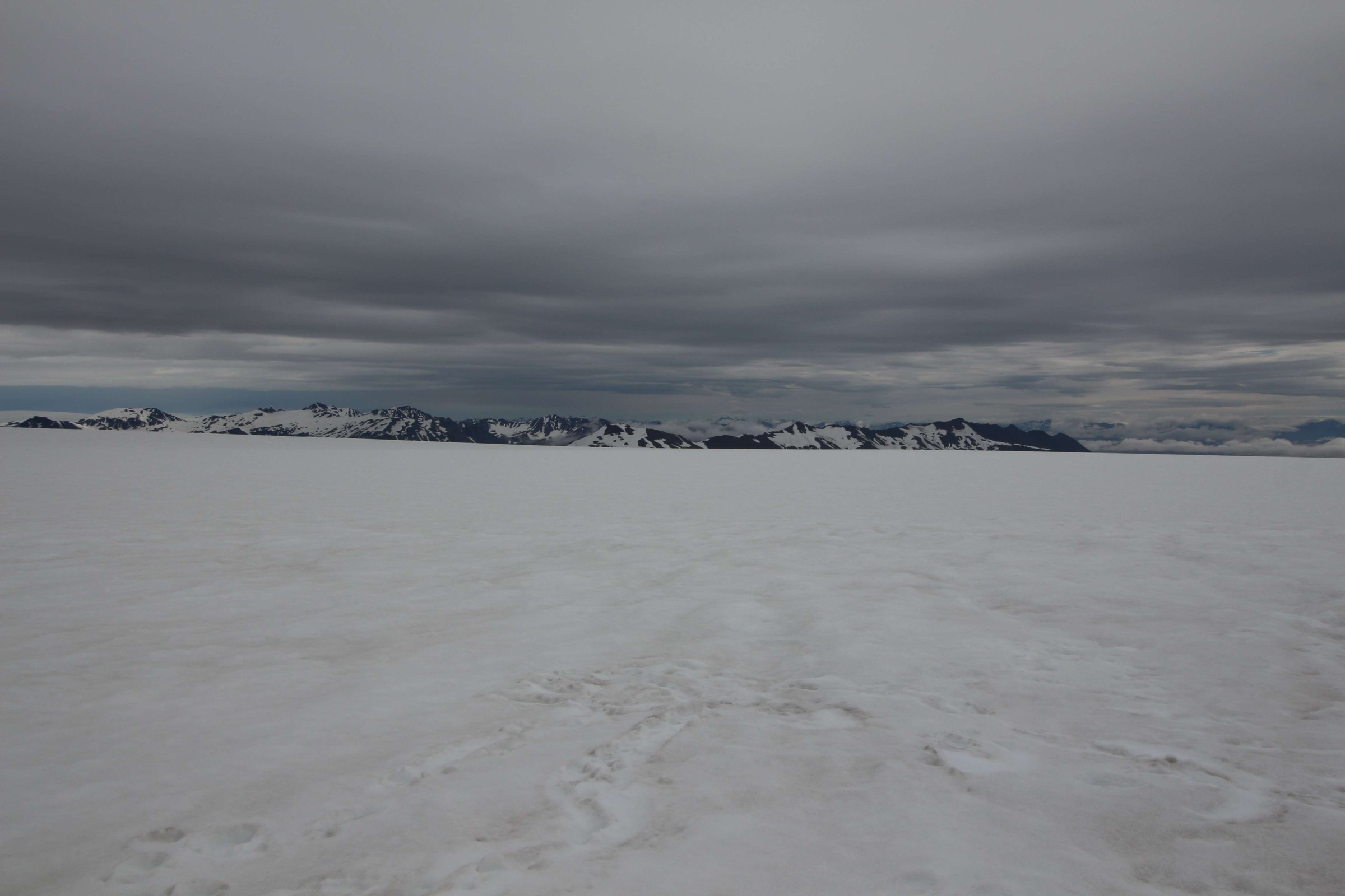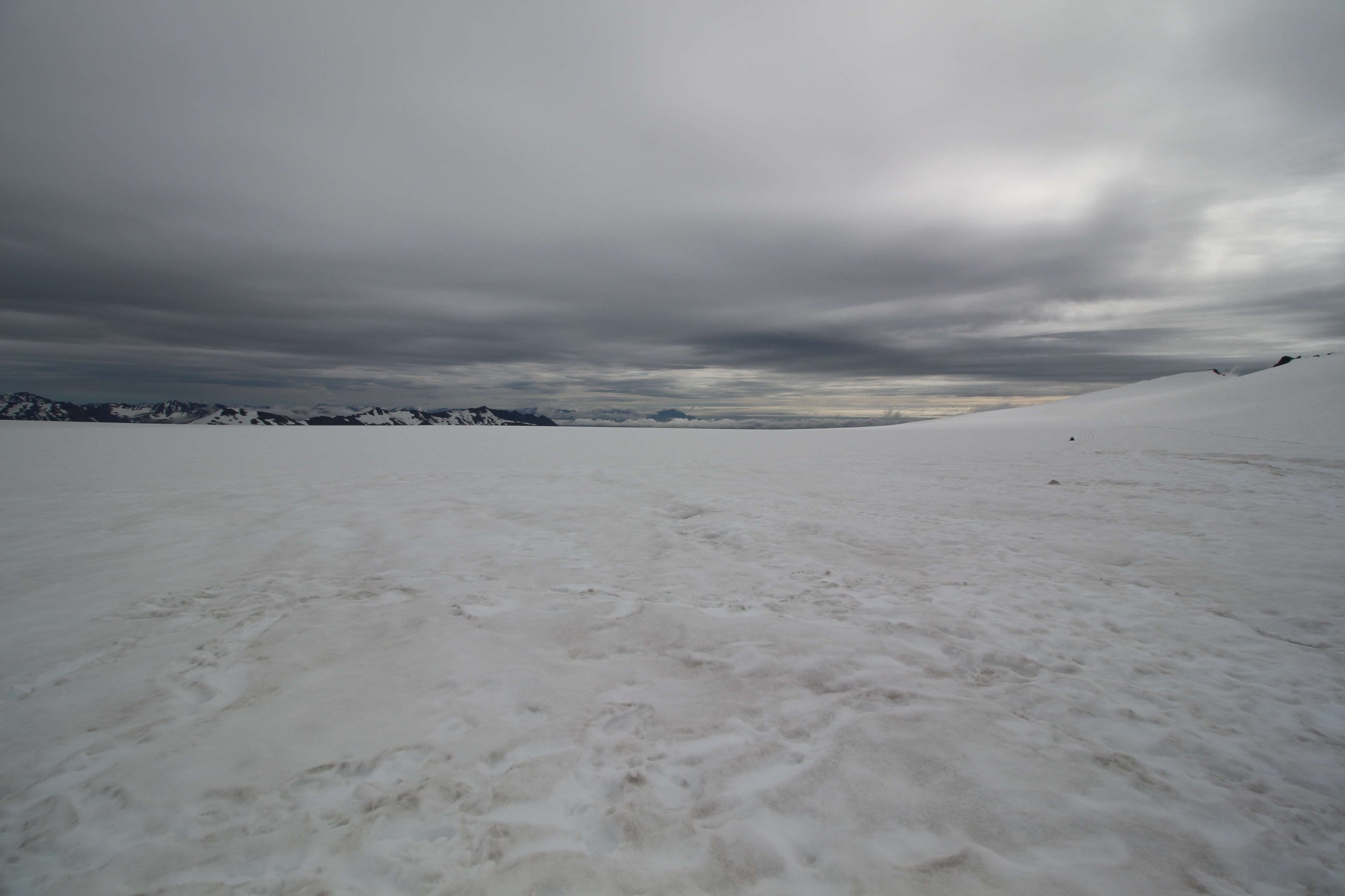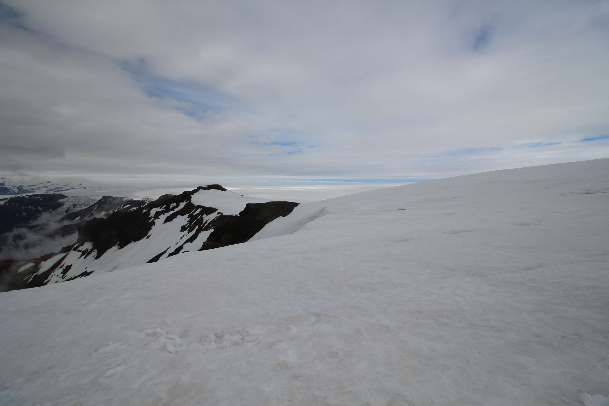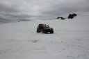 Доехали до лагеря, где люди оставляли свои машины и ехали дальше на снежных скутерах. Но у нас была большая машина с большими колёсами, поэтому мы просто съехали на ледник и поехали по нему. Вот тут мы сделали остановку: