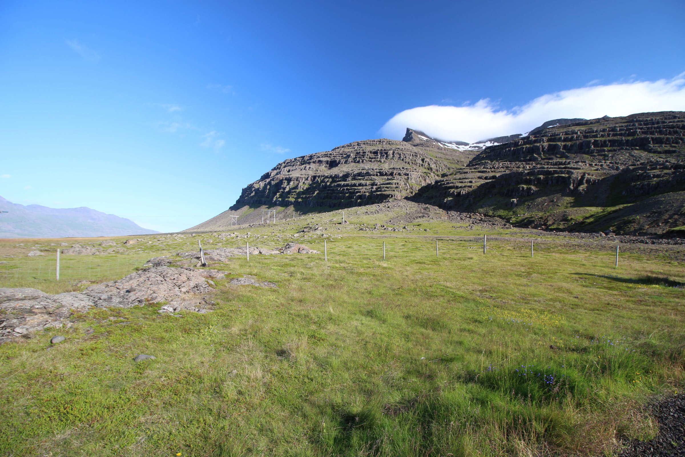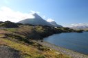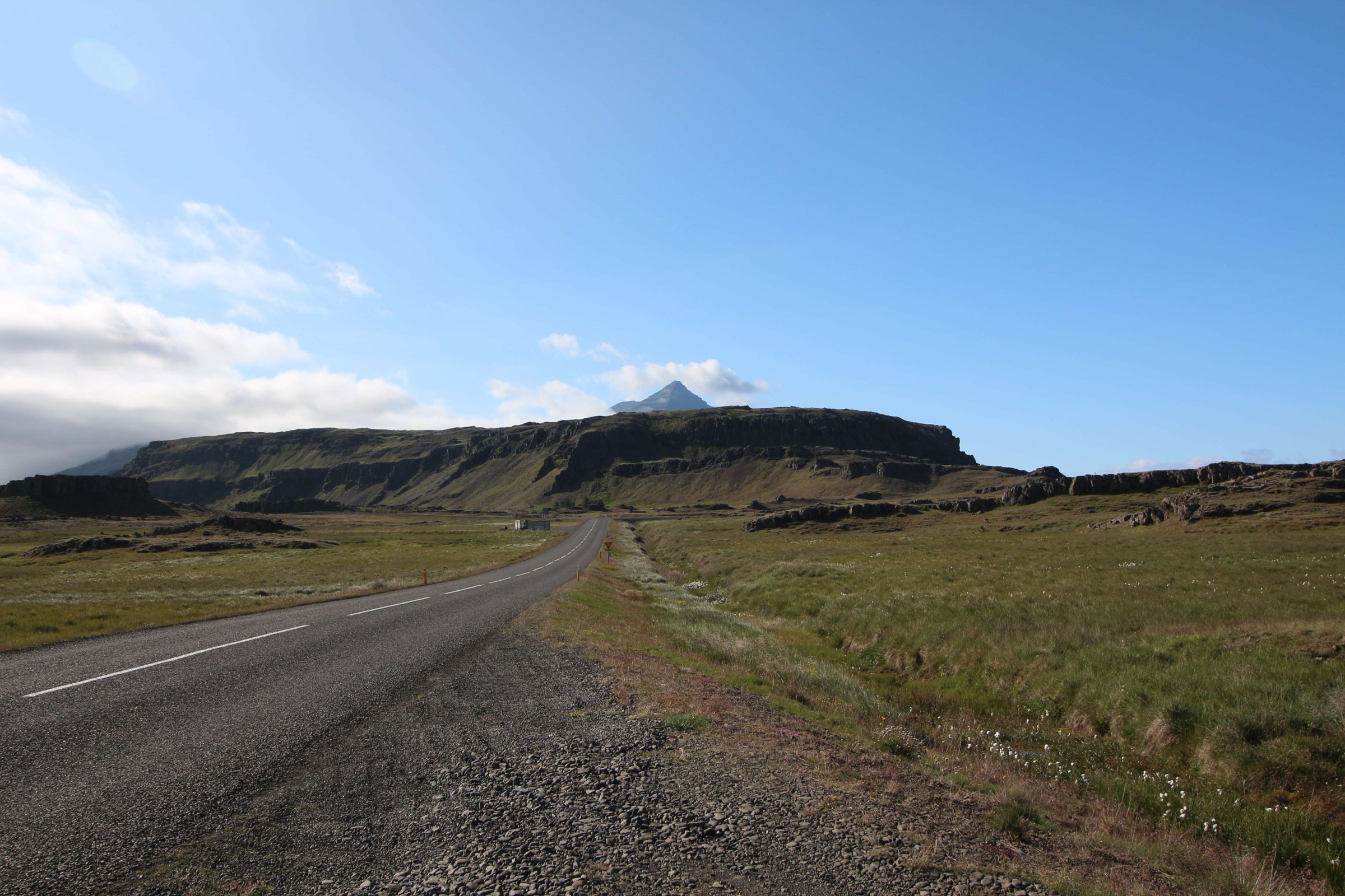Когда мы дошли обратно до машины, то ноги уже гудели, и я не представлял, как мы ещё куда-то пойдём. А следующей локацией у нас была гора, на которую надо было идти пешком, судя по картам. Но, приехав туда, мы увидели гравийную дорогу наверх, которая не была обозначена как F-дорога. Она была весьма крутая, и мы, усталые от предыдущего похода, воспользовались лошадиными силами нашей машины. Въехали на гору. Наверху всё самое красивое было в шаговой доступности. Вид оттуда открывался красивый. Вот вид в cторону самолёта: