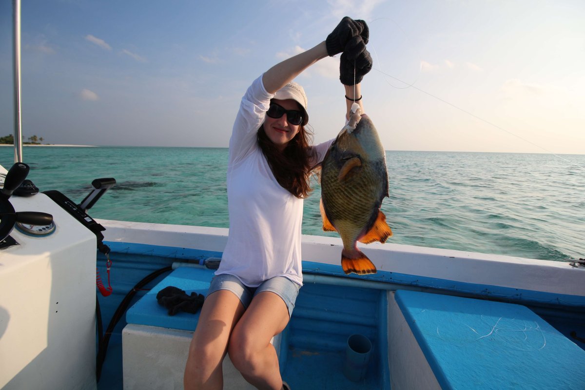 А на вечер у нас была забронирована рыбалка. Мы выбрали время так, чтобы не было возможности сильно обгореть на лодке, ну и оделись соответствующе. Вот тут Света поймала рыбку: