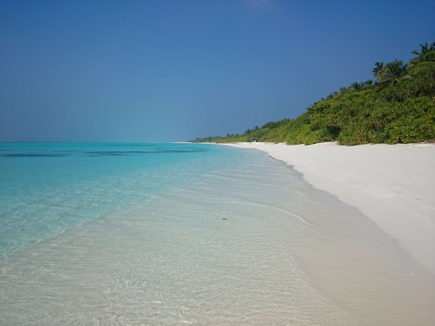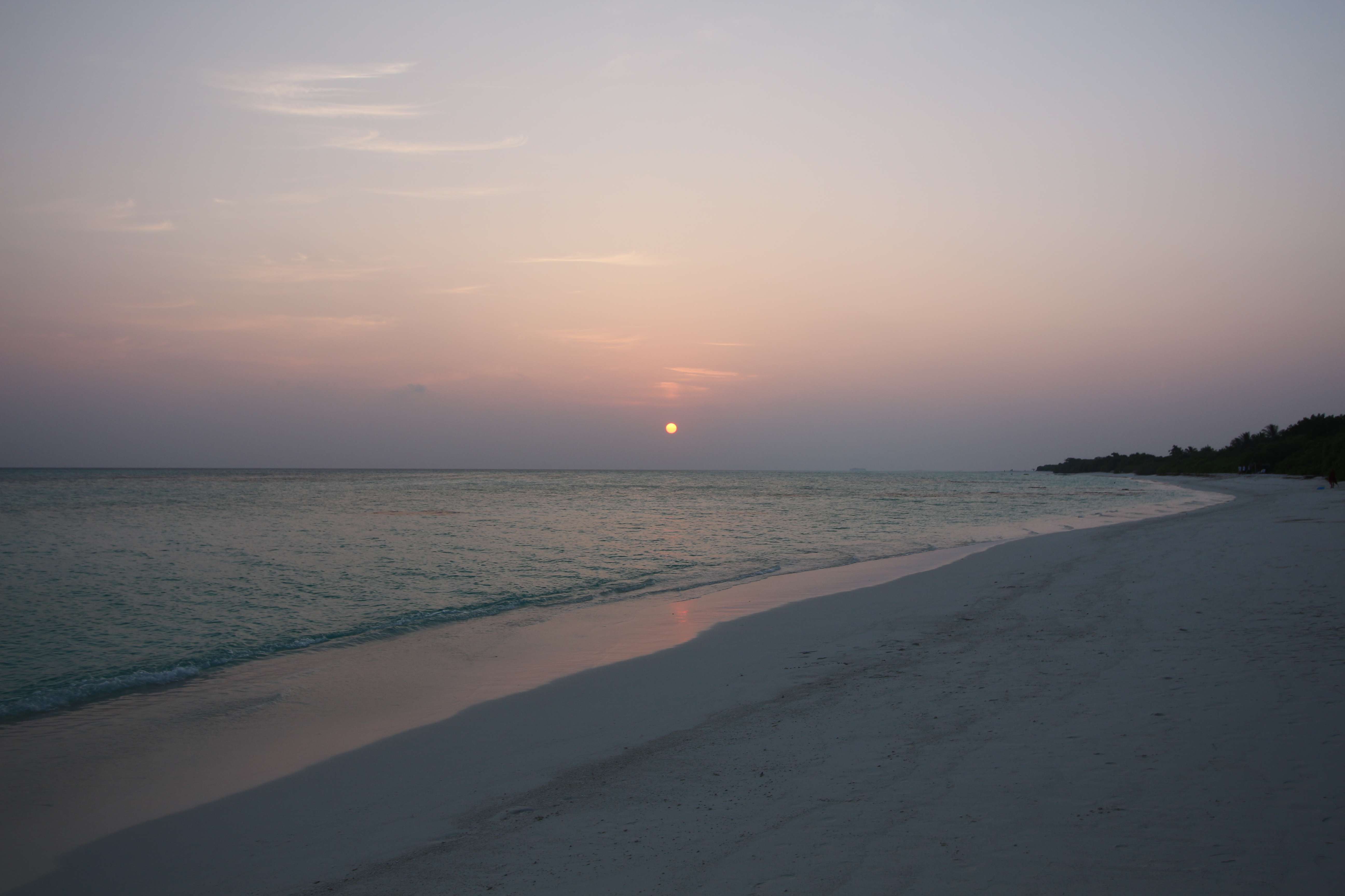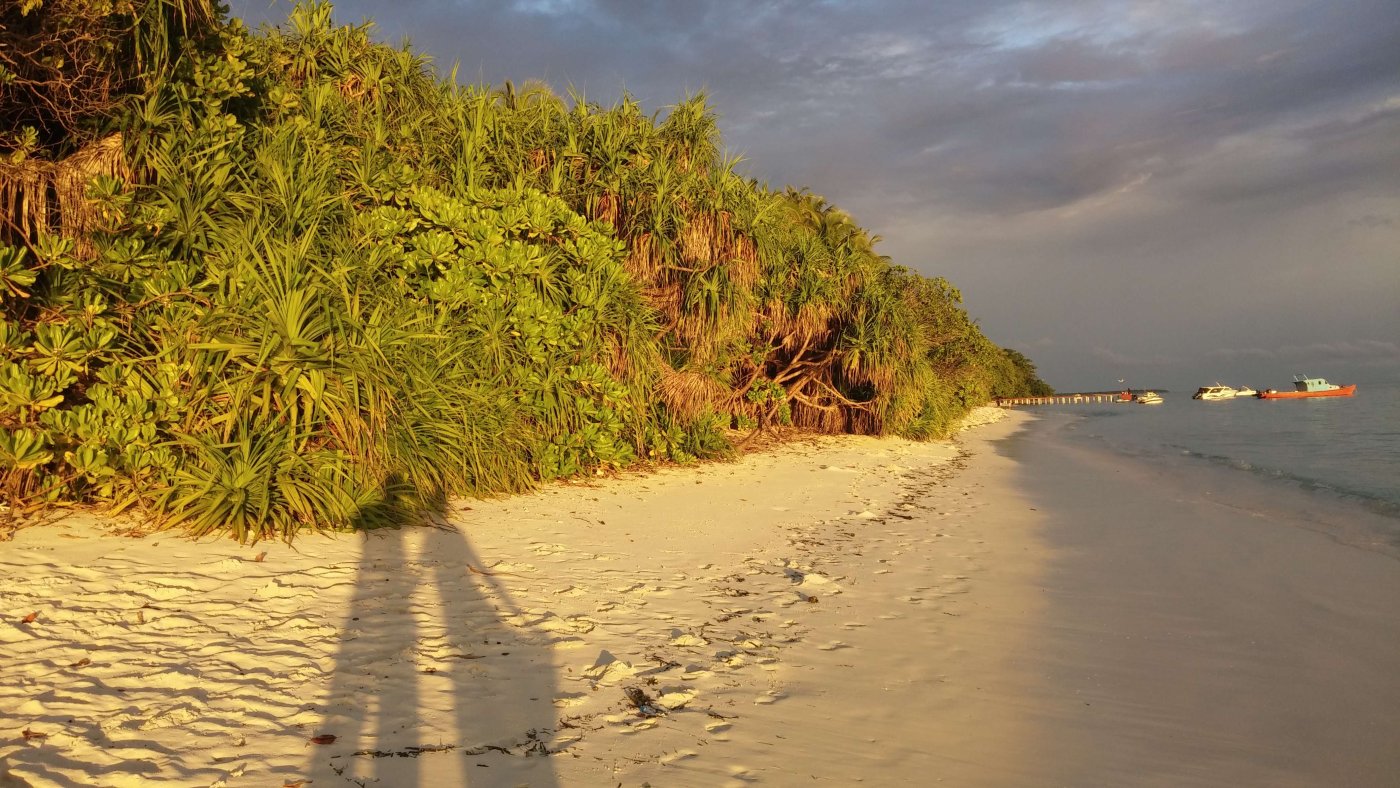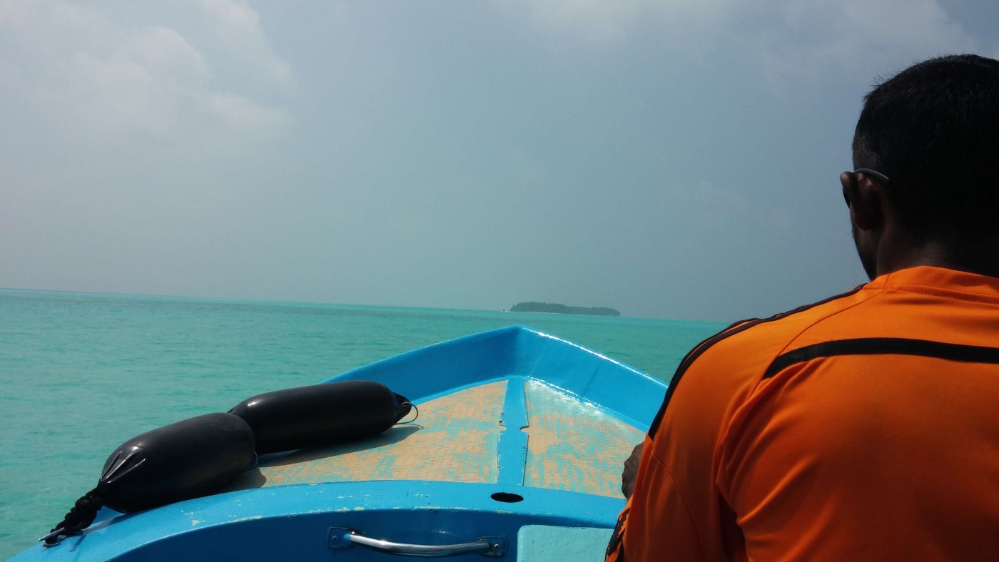 Времени у нас было предостаточно, поэтому мы пошли искать, как нам перебраться на соседний остров. Нашли кассу, заплатили какую-то маленькую сумму, подождали лодку и вступили на неё. Чемоданы нам помогали загрузить местные. Было необычно плыть на лодке, на которой белых было 5-6 человек, а все остальные - чернокожие. Для нас такое было первый раз в жизни. Добрались до острова Мале, и там начался ад: куча мотоциклов и мопедов, снующих туда-сюда, какие-то машины ездят, все гудят. Я начал смотреть по карте на телефоне, куда нам идти, но я не успел это сделать, так как к нам подбежал какой-то местный парнишка и спросил, куда нам идти. Предложил найти такси, но мы сказали, что мы пойдём пешком, и он нас с радостью безвозмездно туда проводил. Остров Мале очень маленький, но перемещаться по его узким улочкам было очень сложно, да ещё и с чемоданами, которые приходилось поднимать из-за неровного покрытия. Пришли в отель, а там на ресепшене кондей) Сразу стало прохладно и боязно за то, что можно простыть. Стоимость каморки, которую мы сняли, была очень большой - порядка 64 доллара за ночь, и это за номер со своей ванной комнатой и туалетом, но без окон. Окошко было только внутрь дома площадью около 1 кв. метра, и там постоянно кто-то сверлил. Мы разобрали вещи и лежали зависали на телек, в котором ничего не было понятно. Там был какой-то индийский телеканал, в котором говорили про сегодняшнее полнолуние. Но нам что-то совсем не хотелось выходить на улицу в этот ад, поэтому мы провалялись весь вечер на кровати. Утро 1-го февраля. Мы проснулись, и я увидел сообщение от управляющего отелем, что отправление лодки смещается с 9 утра на 10:45, поэтому мы смогли неспешно собраться и пойти до причала. Солнца там очень боялись, поэтому я оделся не по погоде: длинные рукава рубашки, шляпа с длинными полями. Дошли до места причала, я побегал поискал лодку, но не нашёл. Но потом к нам подошёл человек, представился, и мы поняли, что это за нами. Он вручил нам билеты на лодку и показал, где она будет, и через некоторое время она приплыла. Он нас туда посадил, и мы поплыли. И опять-таки белых особо на ней не было. Мы ещё боялись, что мы очень устанем на ней прыгать по волнам и всё себе отобъём, а если она ещё будет без крыши, то и сгорим, и простынем. Всё-таки плыть в таком положении нам предстояло около 2-х часов до острова Гоиду (Goidhoo), а потом нужно было ещё плыть от него около 15 минут на соседний остров. В итоге всё прошло неплохо. Лодка была с тентом, прыгала она не очень сильно. Когда Мале скрылся вдали, можно было ощутить, что мы на маленькой лодочке посередине океана куда-то плывём. И если вдруг мы неожиданно утонем, то никто даже не будет знать, где мы. Мой роутер иногда славливал интернет, но это в основном было тогда, когда мы проплывали какой-то остров. Приплыли на Гоиду, вышли из лодки, и тут же нас там встретили другие люди, которые были из Вилубич. Они так и спросили: “Вилубич?". Мы сказали: “Yes". И они посадили нас в свою лодку (она уже была без навеса), и мы поплыли дальше. На острове нас встретила девушка и проводила в гестхаус. Идти пришлось недолго, метров 100) Там нас посадили сразу за стол, каждому дали кокос с трубочкой, и мы его долго пили - он был холодный, и пришлось долго греть его во рту. А пока мы сидели, нас спросили о том, что мы хотим там делать, и как мы будем питаться. Ну насчёт развлечений 