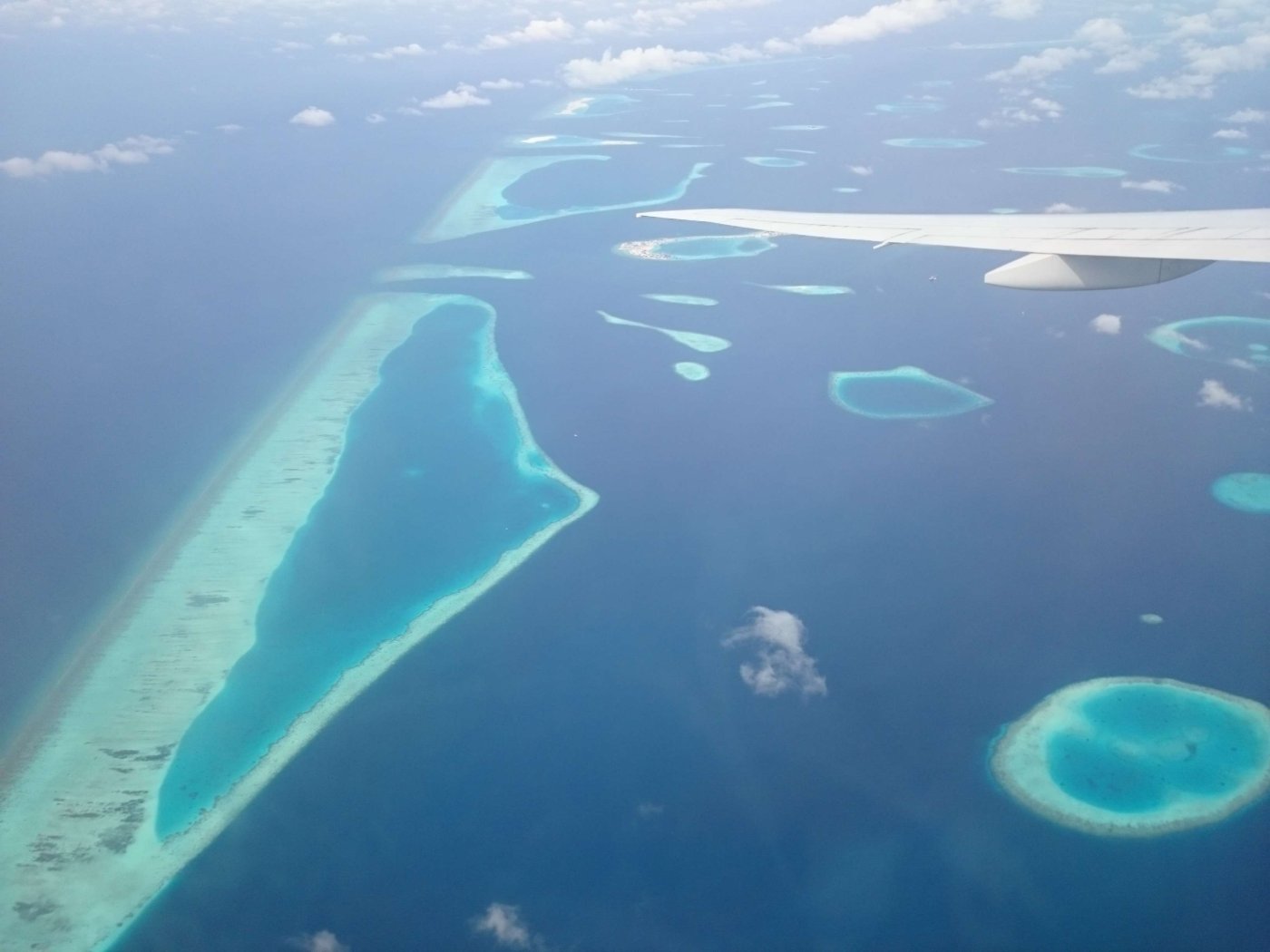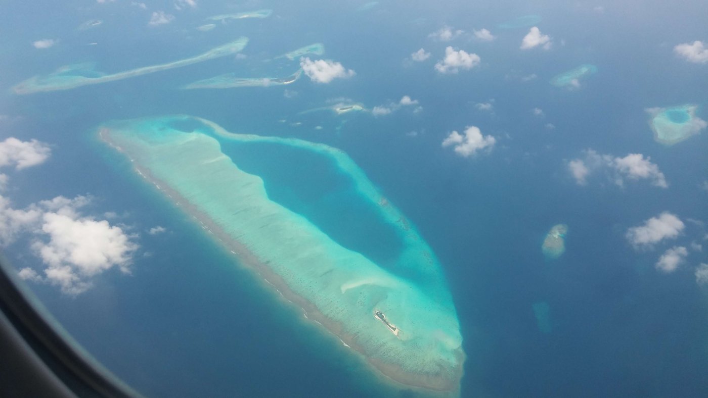Итак, отработали мы половину вторника 30-го января, взяли собранные накануне чемоданы с бутылками воды, оделись потеплее и поехали на такси в Домодедово. В 23:50 у нас был вылет на Мальдивы на регулярном рейсе Emirates с пересадкой в Дубае. До Дубая лететь 6 часов, потом там пересадка 3 часа, а дальше ещё 5 часов до Мале. Разница во времени с Москвой на Мальдивах всего 2 часа. Когда делали пересадку в Дубаях, там было не сильно тепло, всего +18. И было утро, поэтому мы не сильно ужарели, да и в самом аэропорту работали кондеи. Дальше полёт на Мальдивы. Тут ничего интересного, кроме того момента, когда мы начали пролетать над самими островами. Вот тут я их сфоткал из иллюминатора самолёта: По прилёту, когда мы вышли из самолёта, первая мысль была о том, как же мы будем тут дышать. Была жуткая духота, и мы были одеты не по погоде. В полёте ещё было нормально, так как обычно бывает прохладно, а тут вот такая жесть, +32. И на самом деле ощущалось на бОльшее. Наверное, из-за влажности. Да ещё и погранконтроль проходили в жутко душном помещении без кондеев, и как всегда была большая очередь. Такое ощущение, что ни один аэропорт мира не может быстро принять пассажиров одного рейса так, чтобы они не выстраивались в очередь. Мне всегда казалось, что для них является сюрпризом то, что прилетело так много человек. На контроле мужик попросил нас показать букинг. Что-то там изучал, но в итоге пропустил нас в страну. После этого мы пошли сразу переодеваться, и я попутно купил симку местного оператора, по-моему, за 30 долларов на 15 или 30 Гб. И почти сразу же у нас уже был интернет через мобильный модем.