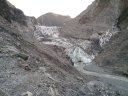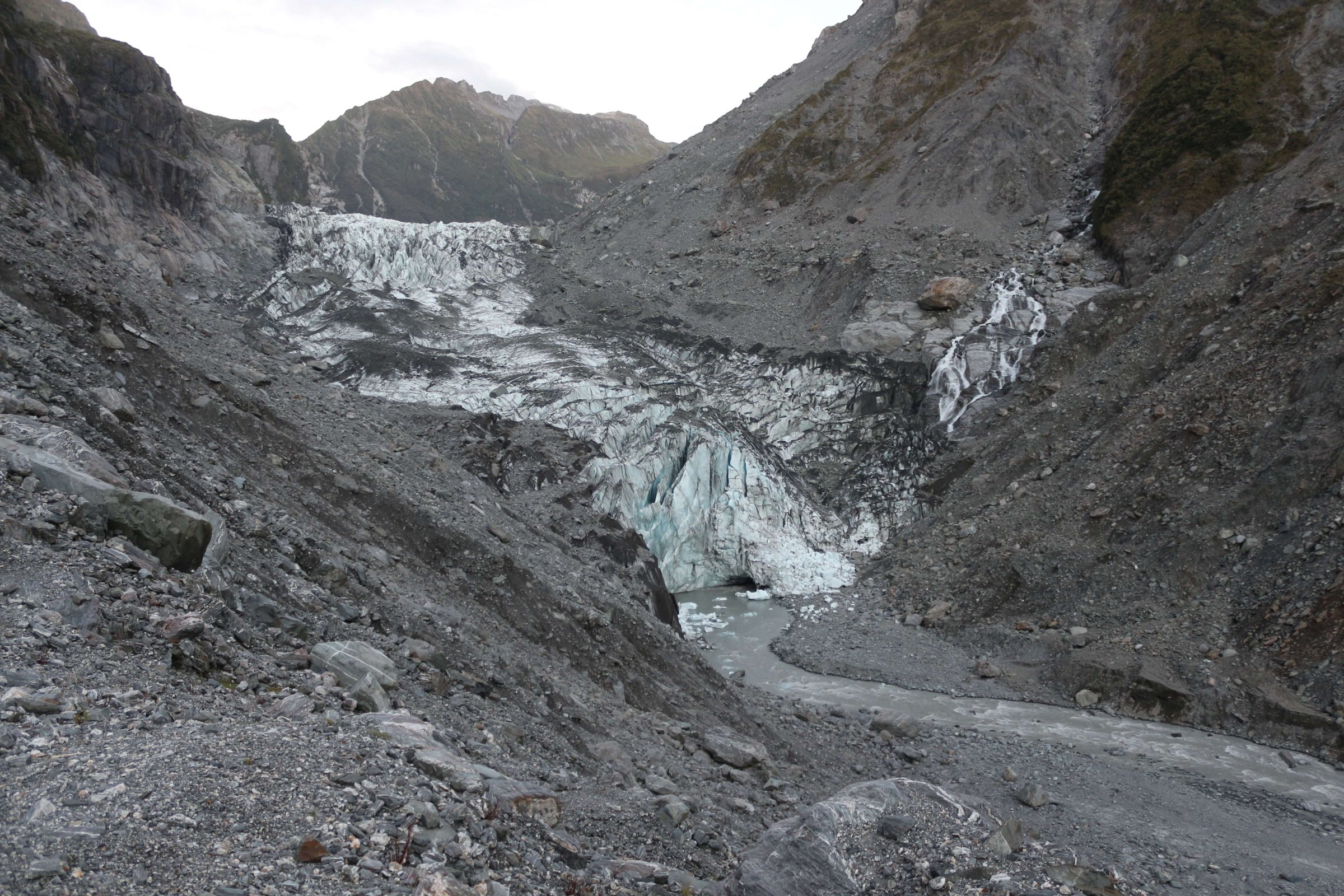Доехав до посёлка в 19:50, я заселился и быстро поехал на ледник, чтобы успеть его увидеть и пофотографировать до заката солнца. Я быстро ехал, а потом быстро бежал до него, обходя речку, текущую от ледника по восточному её побережью. Идти там минут 30 в гору, везде висят знаки, что там опасно, так как по сути это ущелье, где сверху на тебя может упасть камень. Я добрался без происшествий. Когда туда поднимался, то встретил нескольких людей, уходящих оттуда, а поднявшись к смотровой точке, понял, что я тут последний человек на сегодня. Пока вы туда дойдёте, придётся попрыгать по камушкам, по которым течёт вода. Я в итоге не промок, но и дождя в этот день не было. Может, в какие-то дни там сложнее пройти из-за сильных потоков воды с горы.