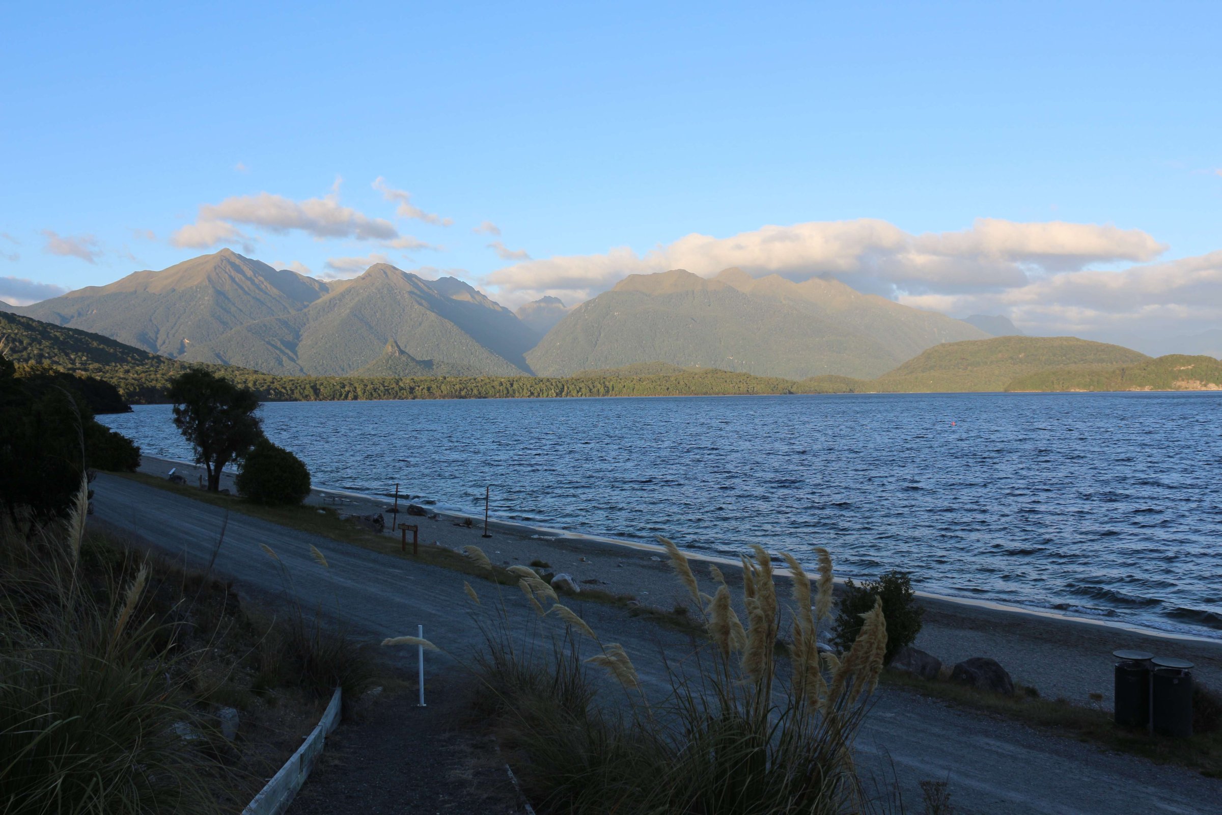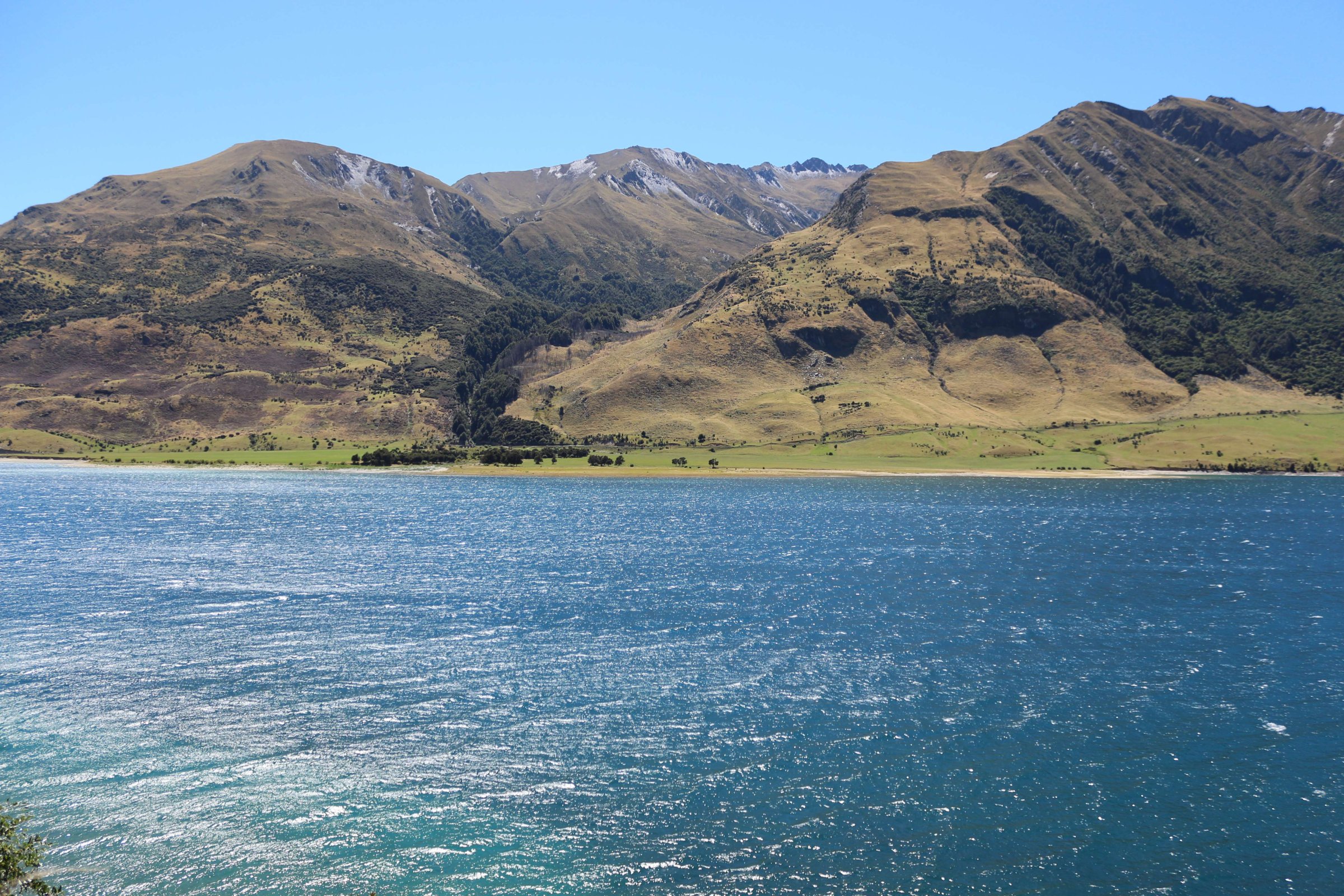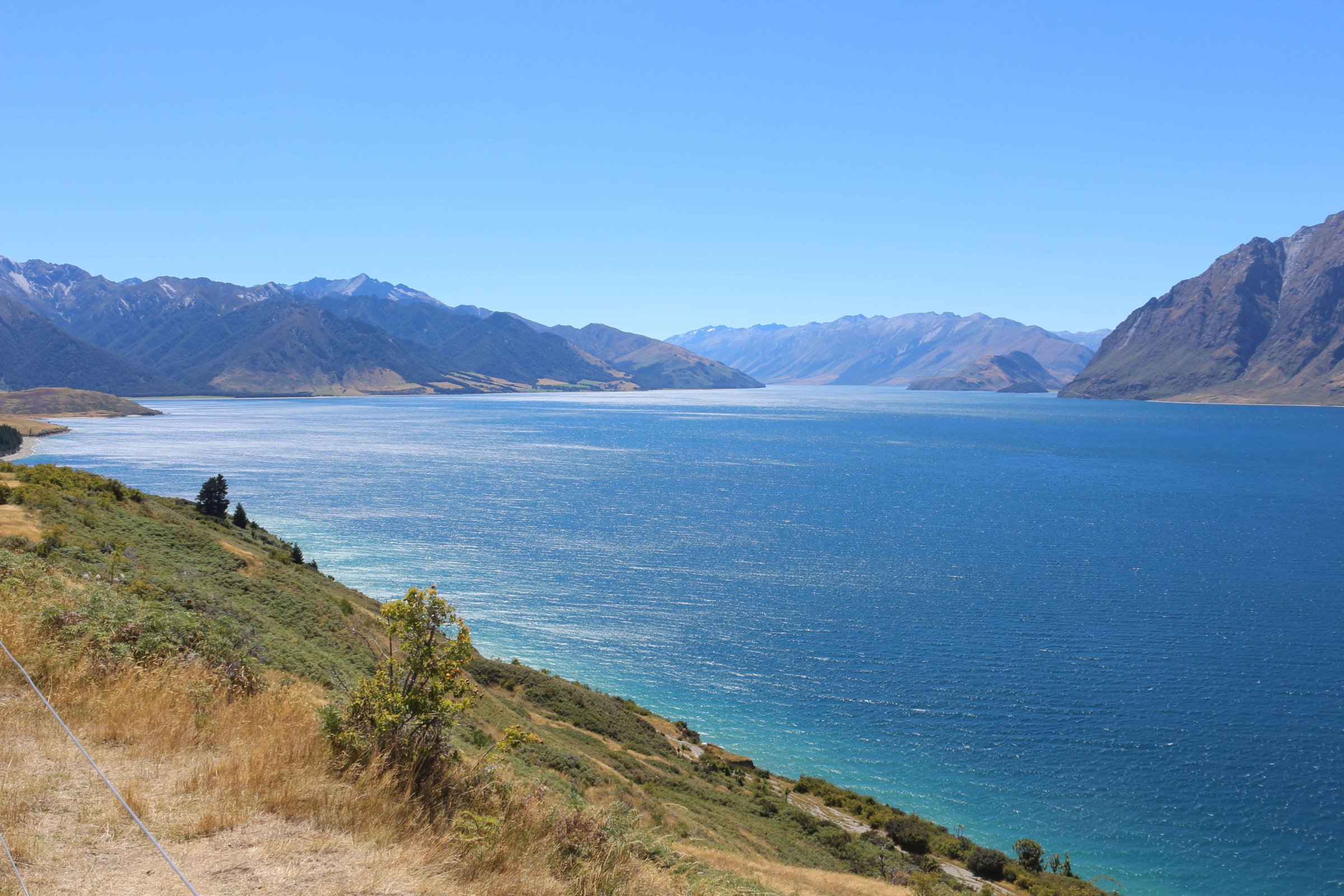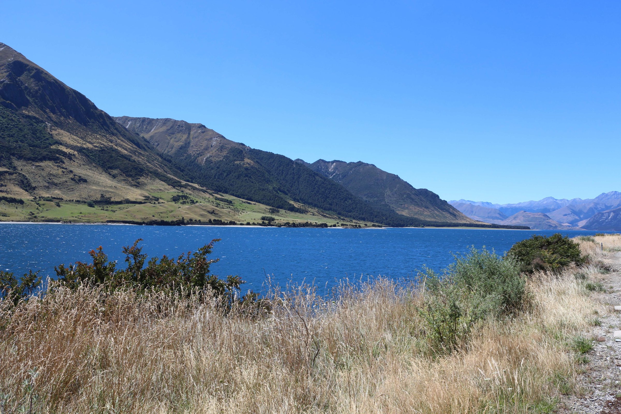 Утром 12-ого февраля в 7:45 я выселился из гостиницы в Манапоури(Manapouri) и поехал к леднику Фокса(Fox Glacier), до озера Хавеа(Hawea). Путь мне был знаком, но останавливаться для фотографирования всё равно приходилось, так как где-то, когда я проезжал в прошлый раз, погода была плохая. В районе этого озера пропала мобильная связь и интернет, уже были мысли, что я смогу попасть в интернет только в Крайстчёрче, но к вечеру, когда приехал в пункт назначения, связь появилась, в посёлке с одноимённым названием ледника.