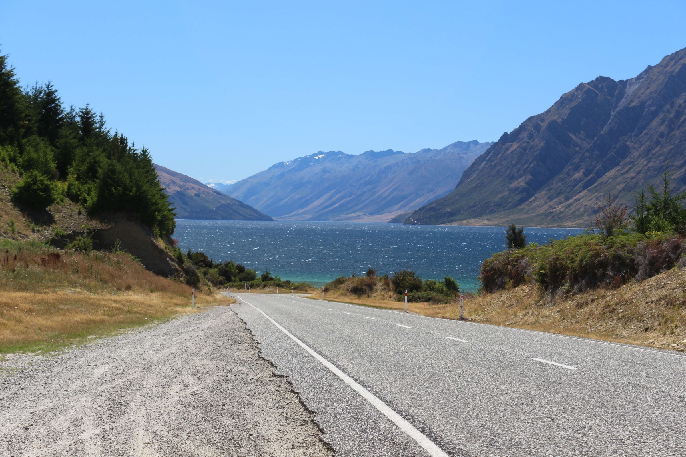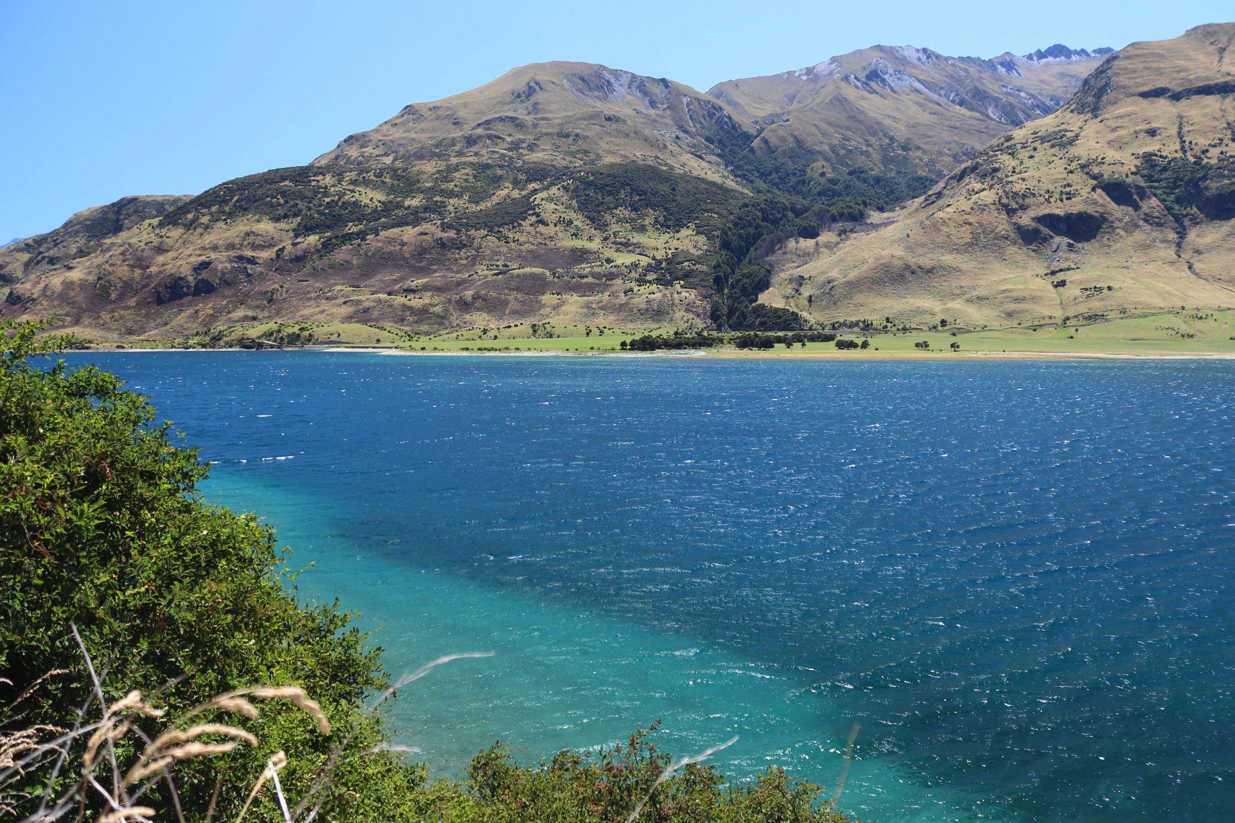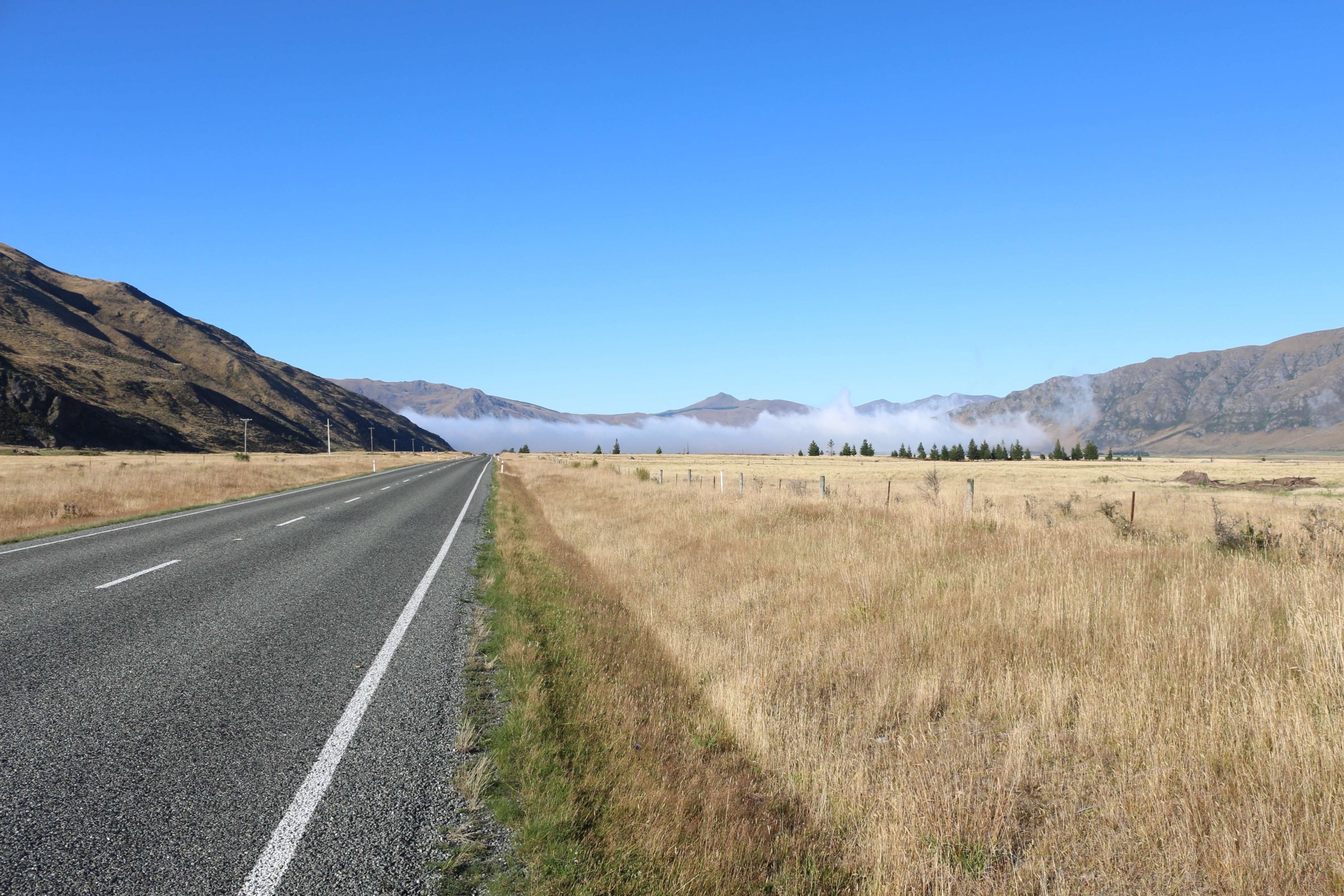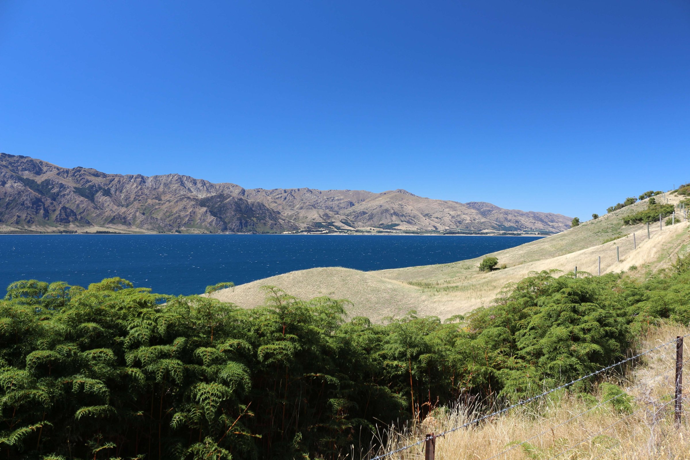 Утром 12-ого февраля в 7:45 я выселился из гостиницы в Манапоури(Manapouri) и поехал к леднику Фокса(Fox Glacier), до озера Хавеа(Hawea). Путь мне был знаком, но останавливаться для фотографирования всё равно приходилось, так как где-то, когда я проезжал в прошлый раз, погода была плохая. В районе этого озера пропала мобильная связь и интернет, уже были мысли, что я смогу попасть в интернет только в Крайстчёрче, но к вечеру, когда приехал в пункт назначения, связь появилась, в посёлке с одноимённым названием ледника.