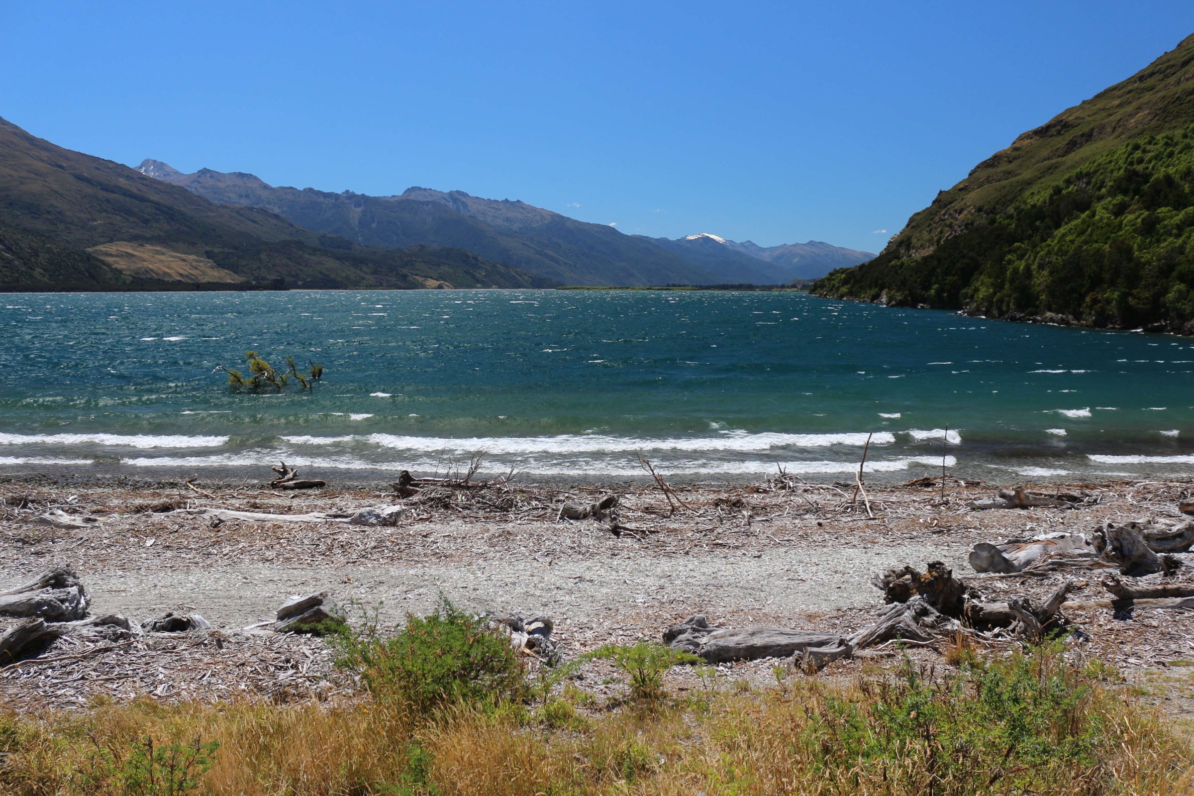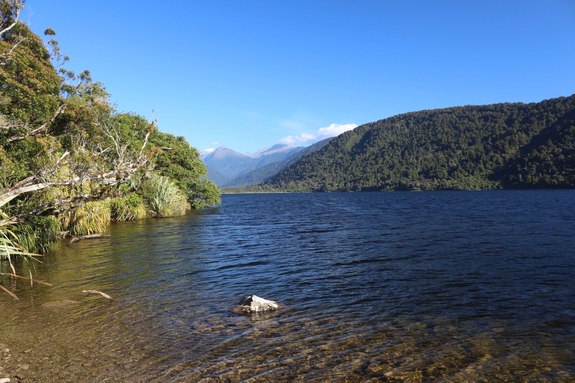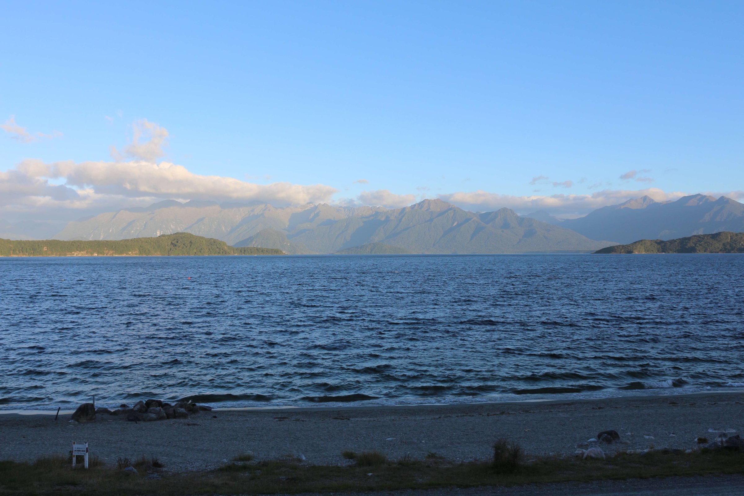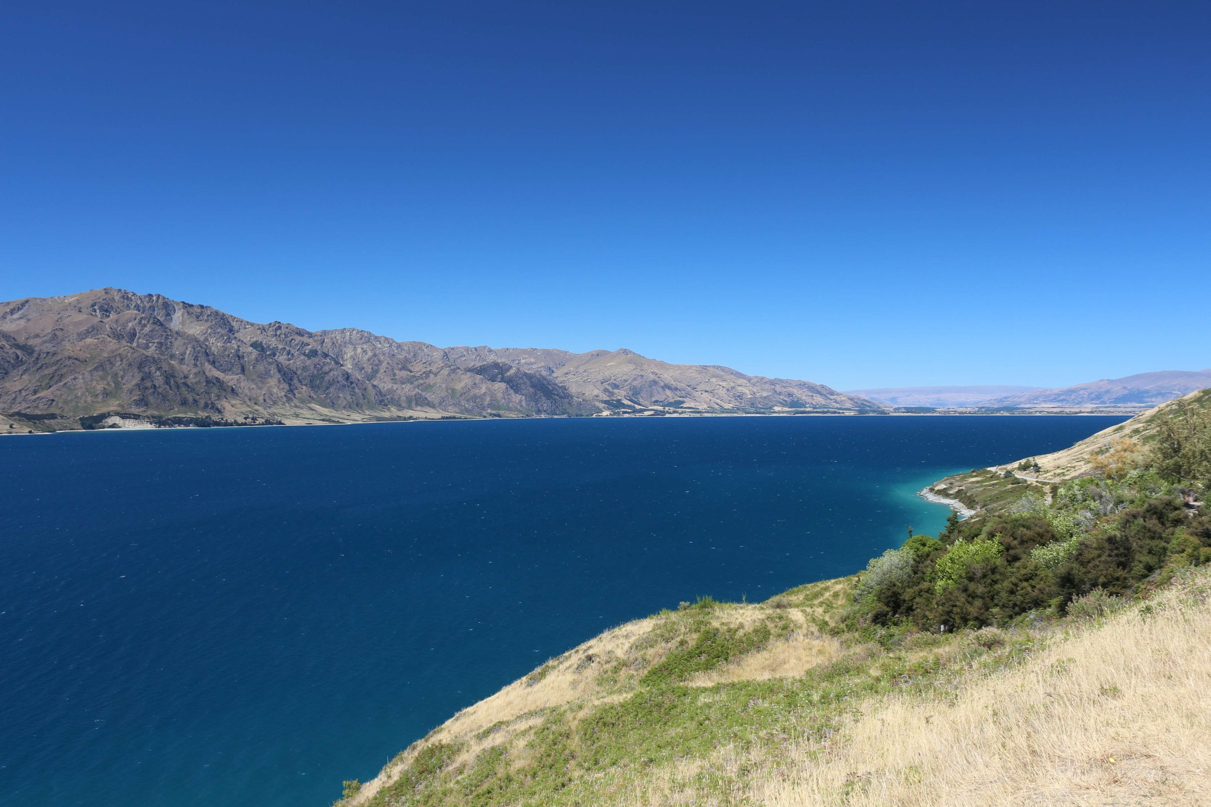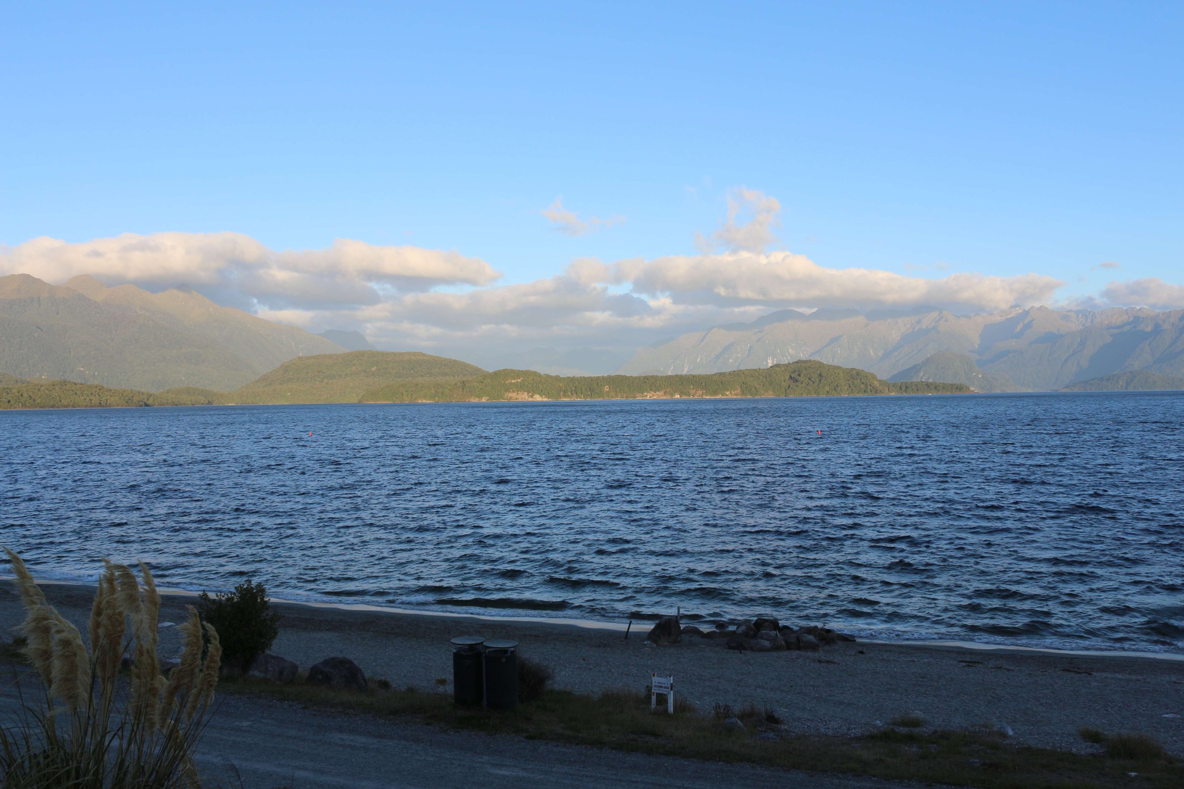 Утром 12-ого февраля в 7:45 я выселился из гостиницы в Манапоури(Manapouri) и поехал к леднику Фокса(Fox Glacier), до озера Хавеа(Hawea). Путь мне был знаком, но останавливаться для фотографирования всё равно приходилось, так как где-то, когда я проезжал в прошлый раз, погода была плохая. В районе этого озера пропала мобильная связь и интернет, уже были мысли, что я смогу попасть в интернет только в Крайстчёрче, но к вечеру, когда приехал в пункт назначения, связь появилась, в посёлке с одноимённым названием ледника.