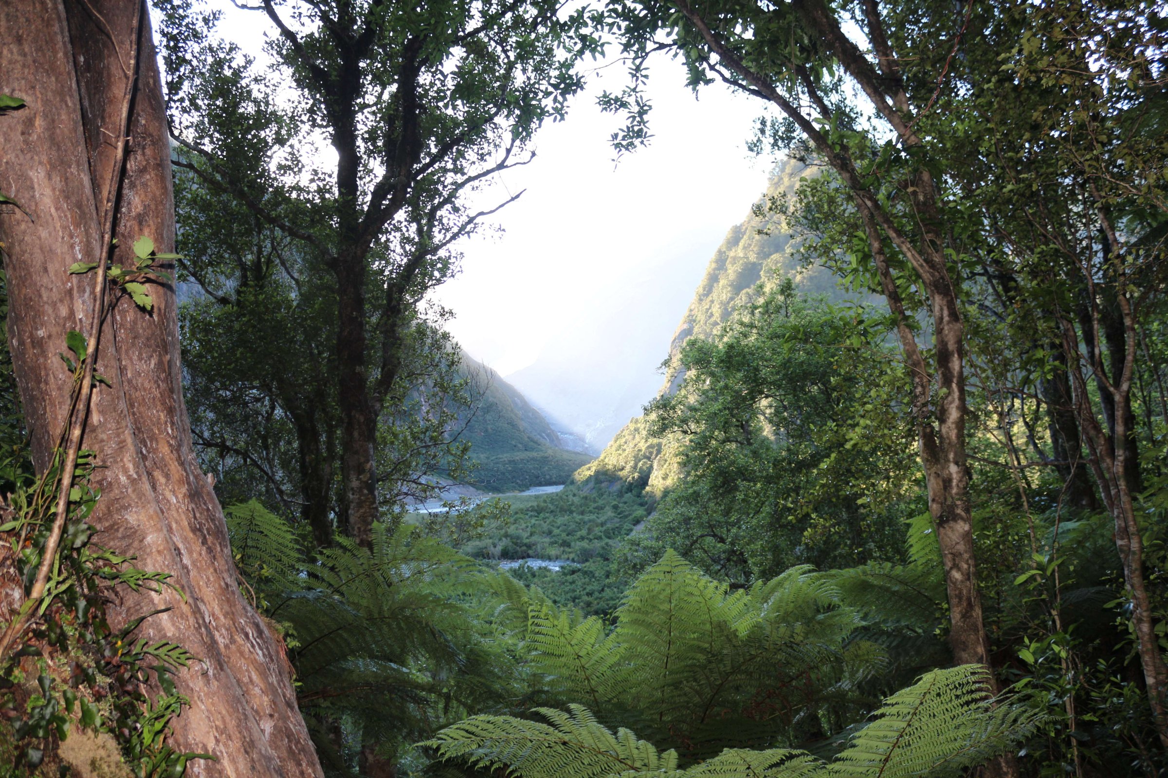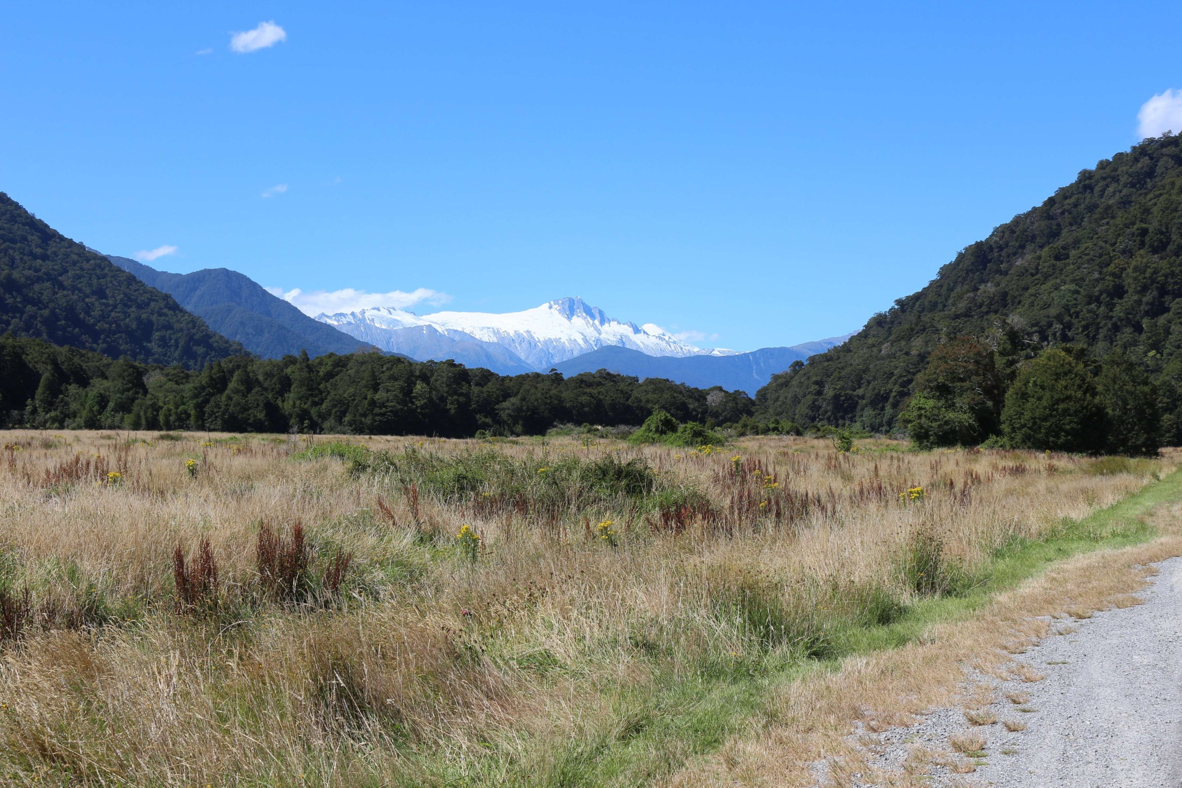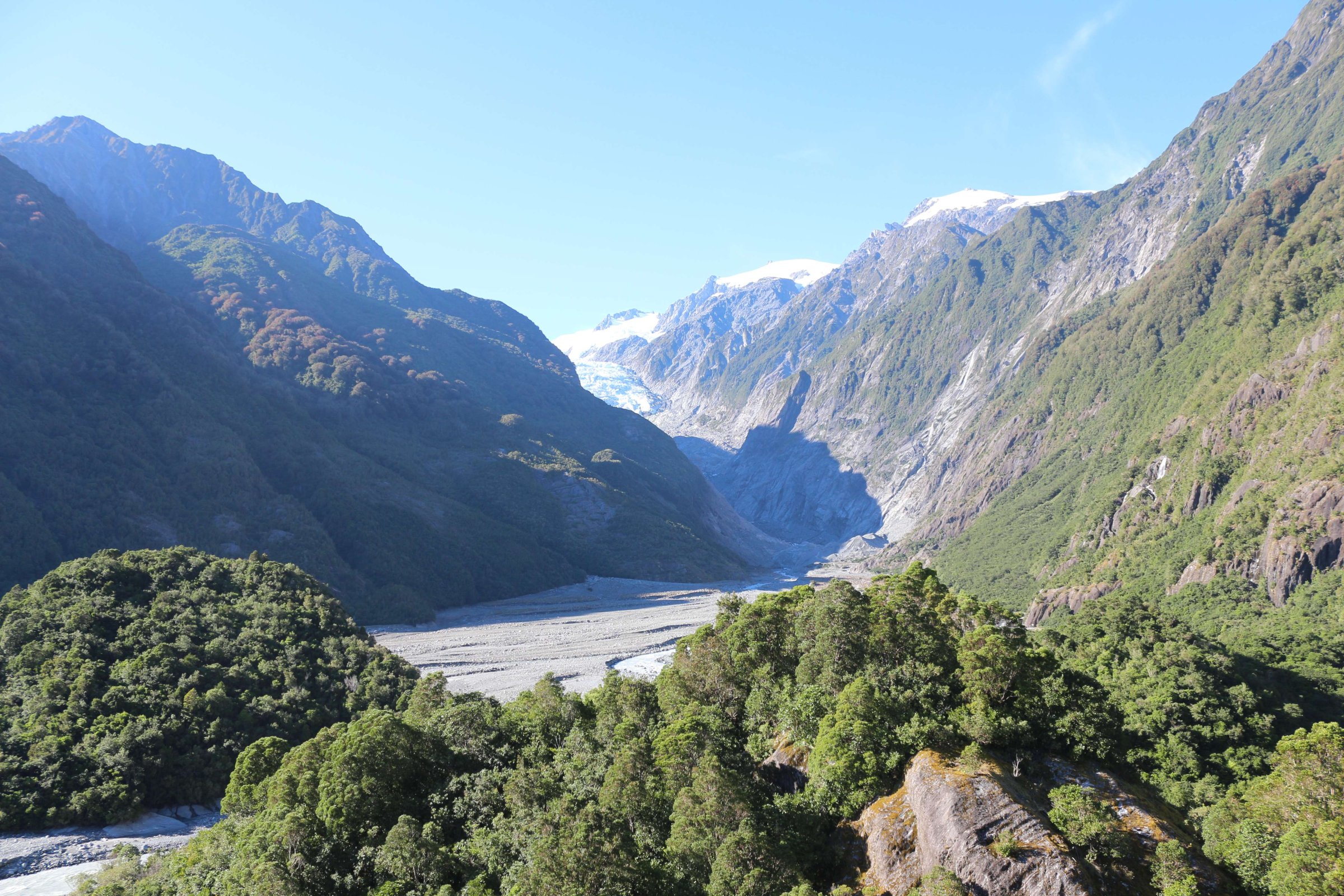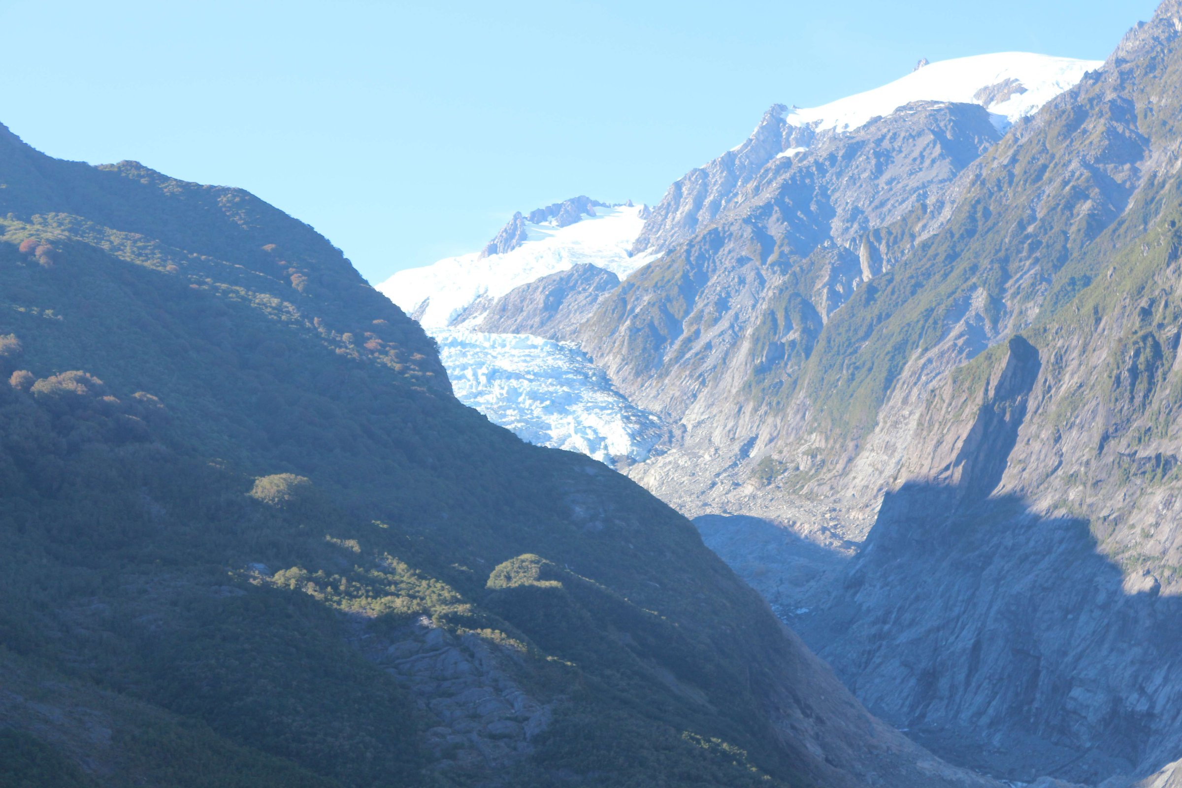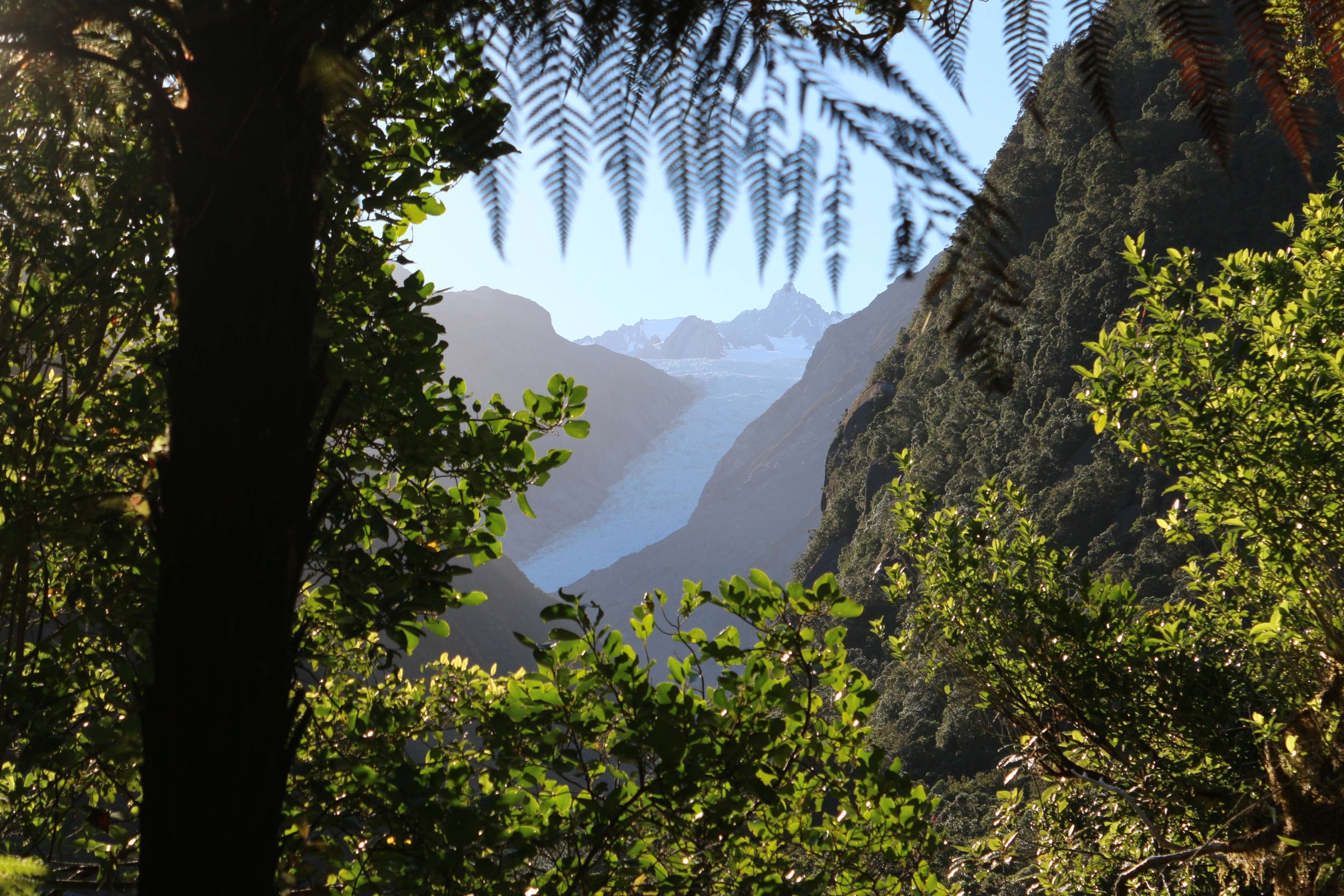 Я сделал несколько фотографий из леса на еле видный ледник и погнал в Крайстчёрч(Christchurch). По дороге я заехал на площадку, с которой открывается хороший вид на ледник Франса Джозефа(Franz Josef Glacier). Там была возможность пойти пешком на несколько часов в треэк, но у меня уже не было на это времени.