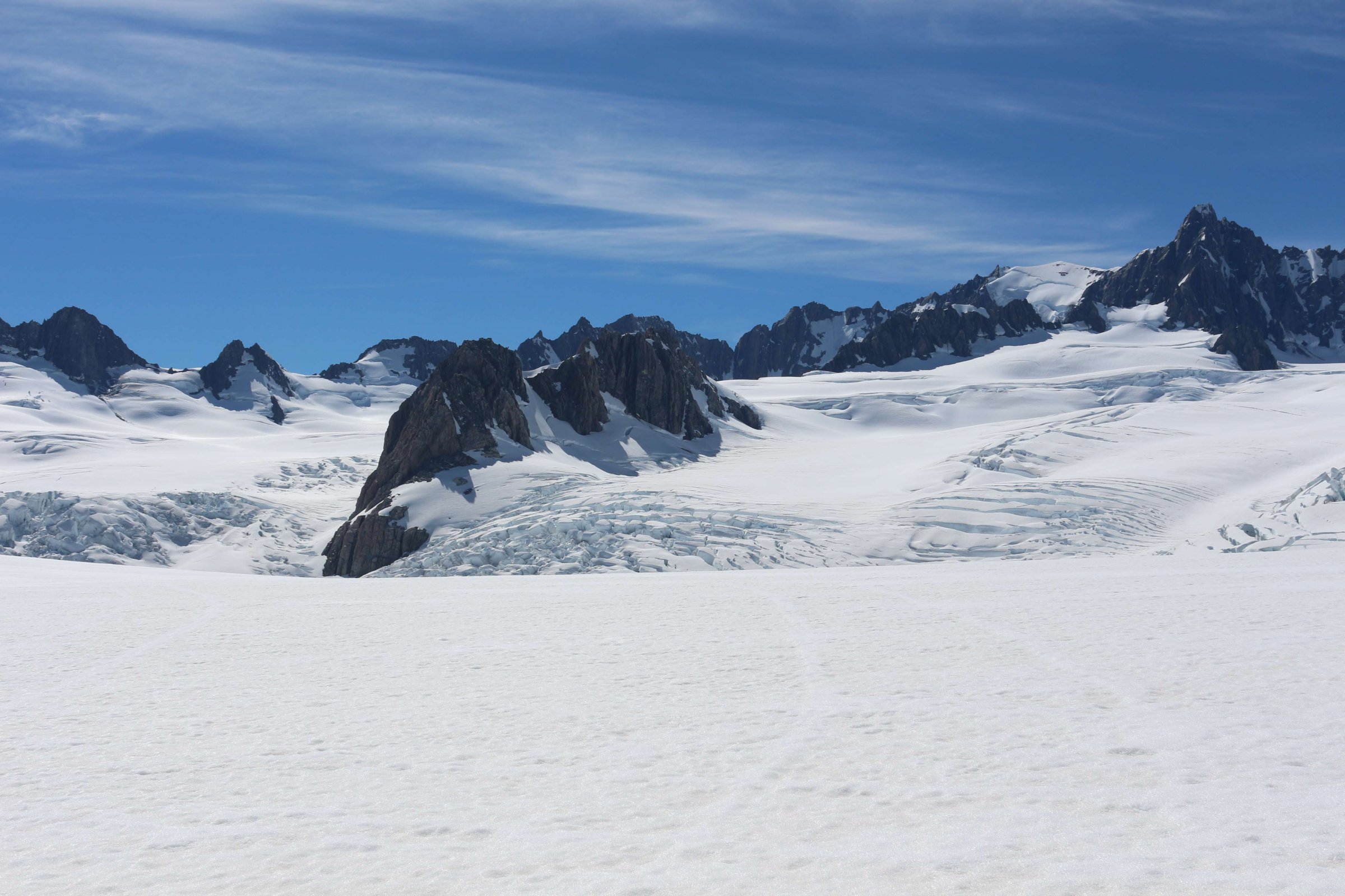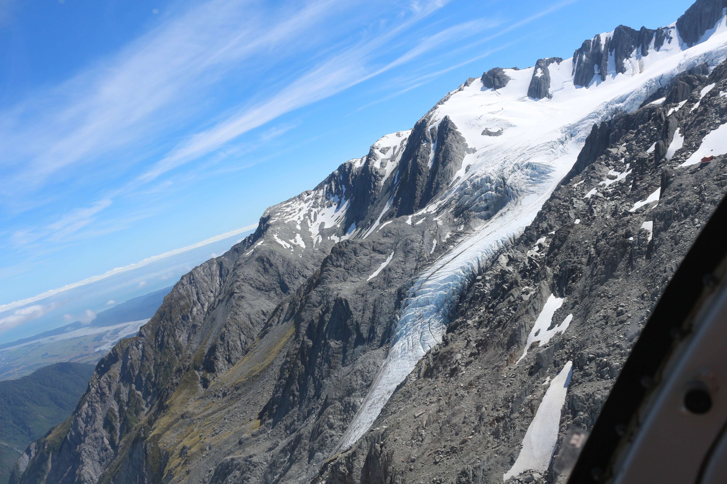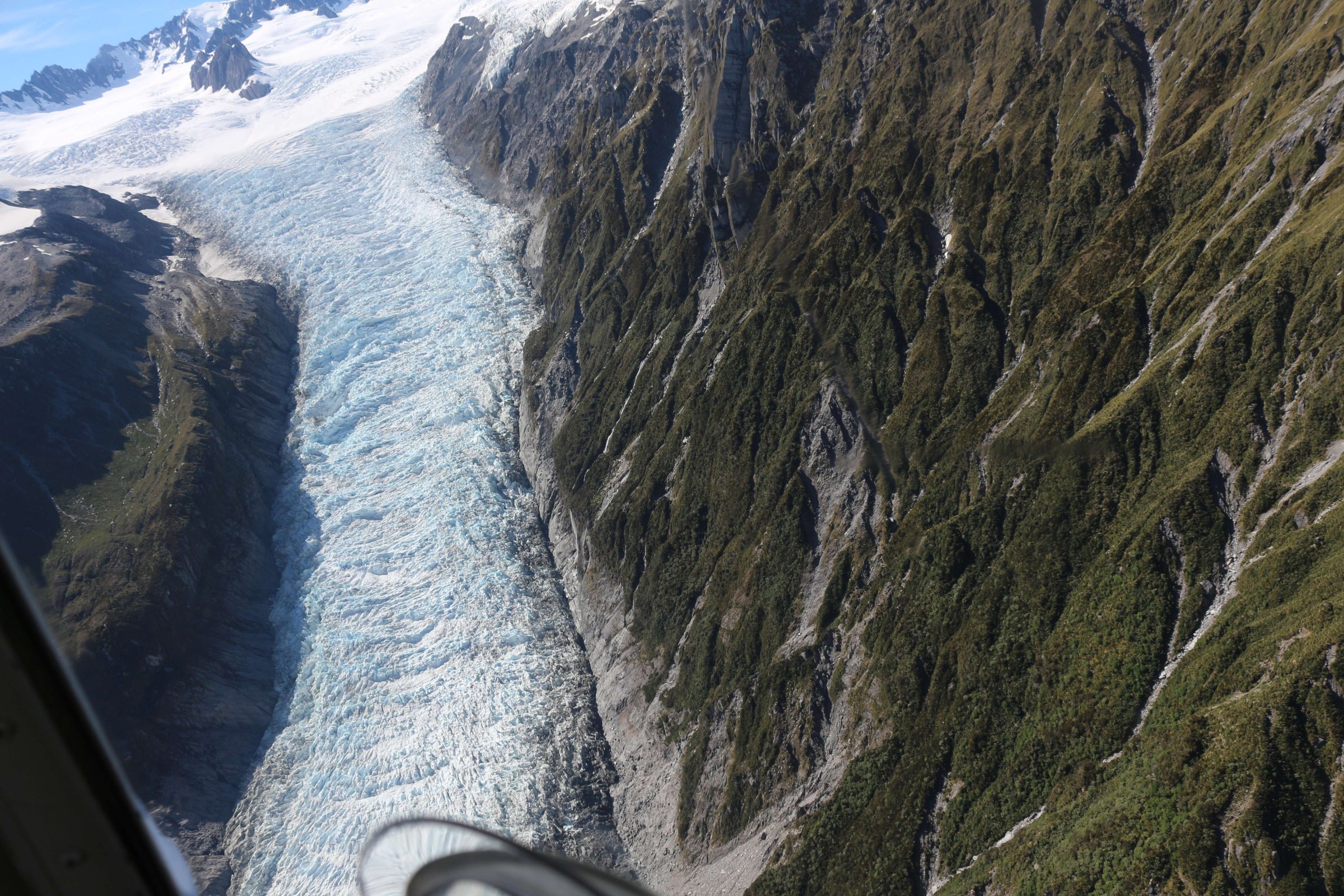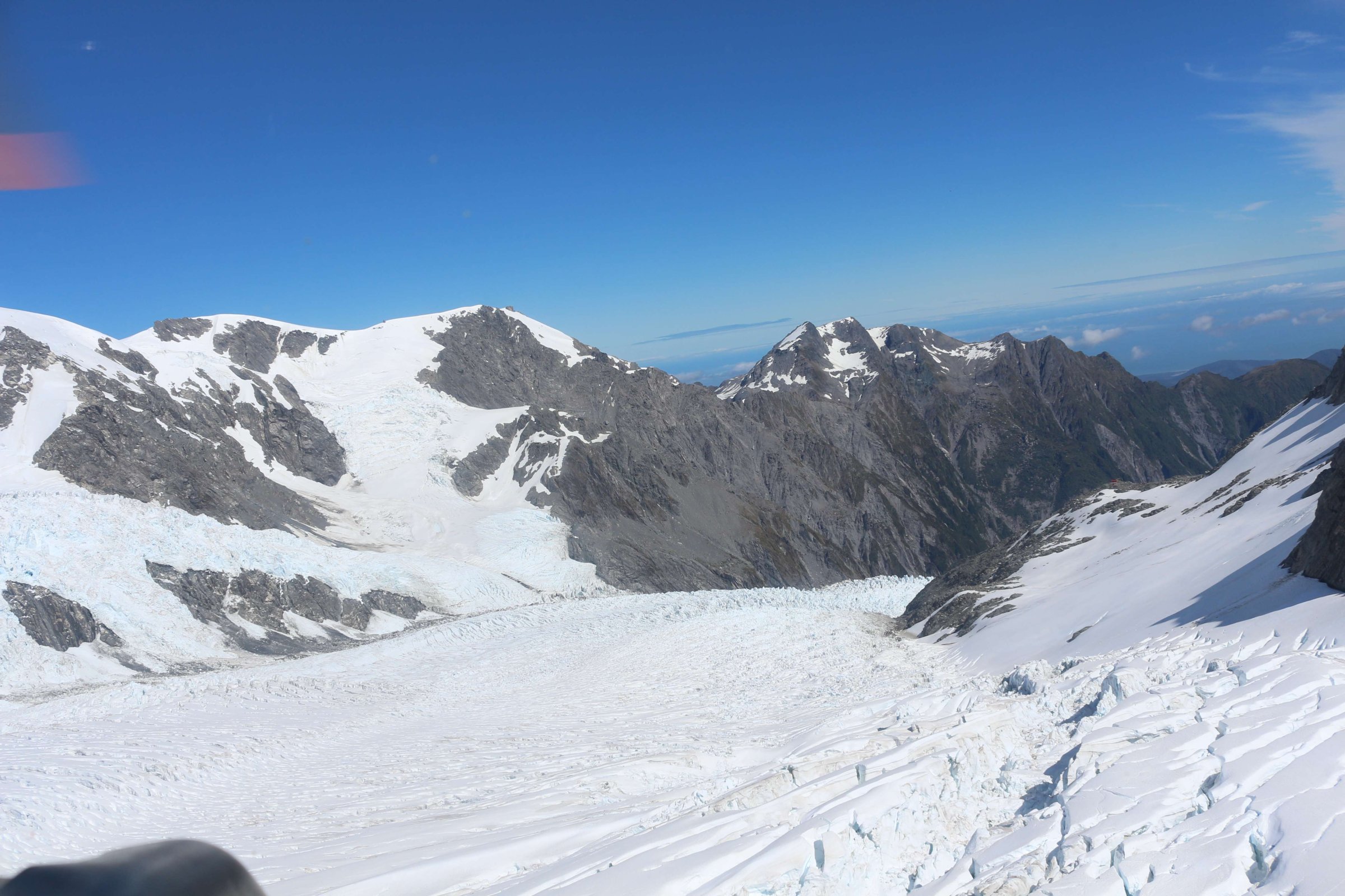 В деревушке под названием ледник Франса Джозефа(Franz Josef Glacier) я увидел рекламу вертолётных экскурсий на все ледники. Там мне предложили много вариантов полёта, и самый дорогой и обширный стоил 450 новозеландских долларов. Он включал в себя час полёта, и за этот час вас бы свозили посмотреть на два ледника, и вы бы совершили облёт горы Маунт Кук, на которую я так и не попал, и вблизи её так и не смог увидеть. Но эти полёты были только во второй половине дня, и я согласился на менее дешёвый тур. Вертолёт вмещает 5 пассажиров. За 250 новозеландских долларов вас доставят на ледник Фокса(Fox Glacier), высадят там, и у вас будет время пофотографироваться на нём. С собой попросили взять только фотоаппарат, всё остальное я сдал в камеру хранения при аэродроме. Куртку тоже сказали сдать, так как на леднике было тепло, несмотря на то, что там вокруг лежал снег, и мы были на высоте 2000 м над уровнем океана. На леднике мы пообщались с пилотом вертолёта и остальными путешественниками. Все удивились, что я из России, они, вероятно, редко встречают россиян. В роли путешественников там в основном китайцы, японцы и австралийцы, русским туда добраться сложно. По крайней мере, так все думают. Но я в принципе не особо ощутил каких-то проблем при перелёте. Да, долго, но сам перелёт интересен. За 26 часов успеваешь побывать в 3-х странах, полюбоваться видом из окна, поесть вкусную еду в самолёте и, если станет скучно, посмотреть фильмы на дисплее, вмонтированном в спинку кресла впереди сидящего пассажира.