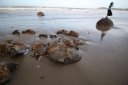 Рядом с Данидиным, на побережье, есть одно место, которое мы не могли пропустить, поэтому заехали туда - валуны Маэраки. Это камни, имеющие круглую форму и весомый размер. Такое ощущение, что это окаменелые яйца динозавров, некоторые из них были расколоты.