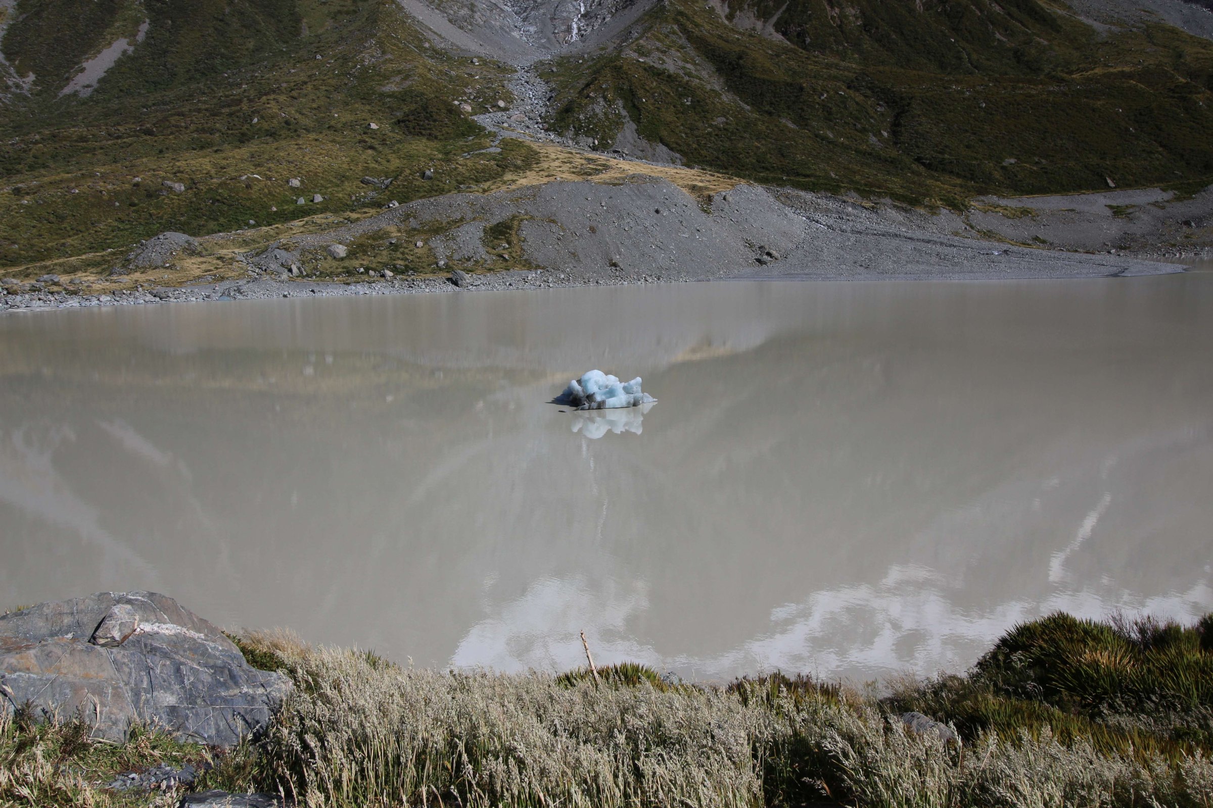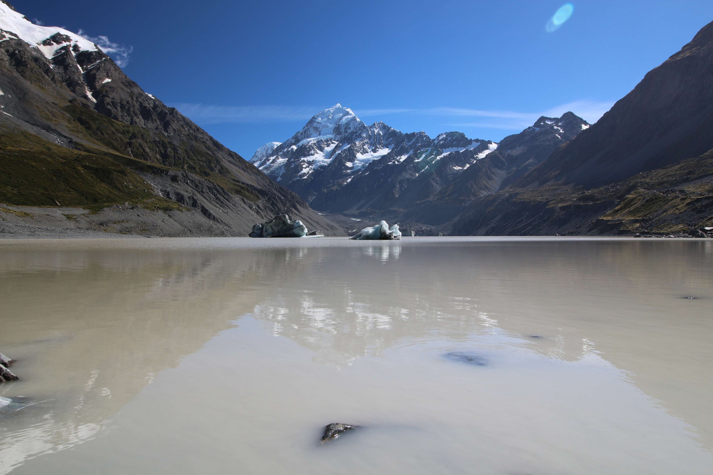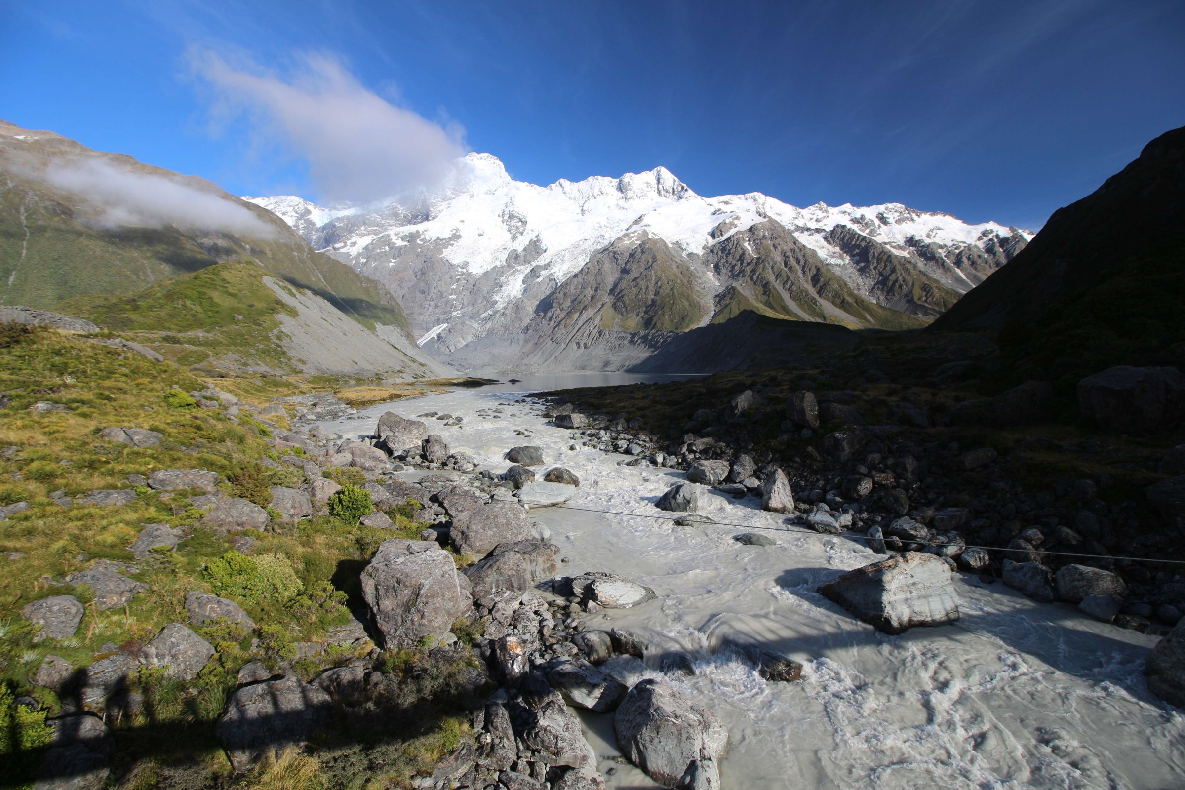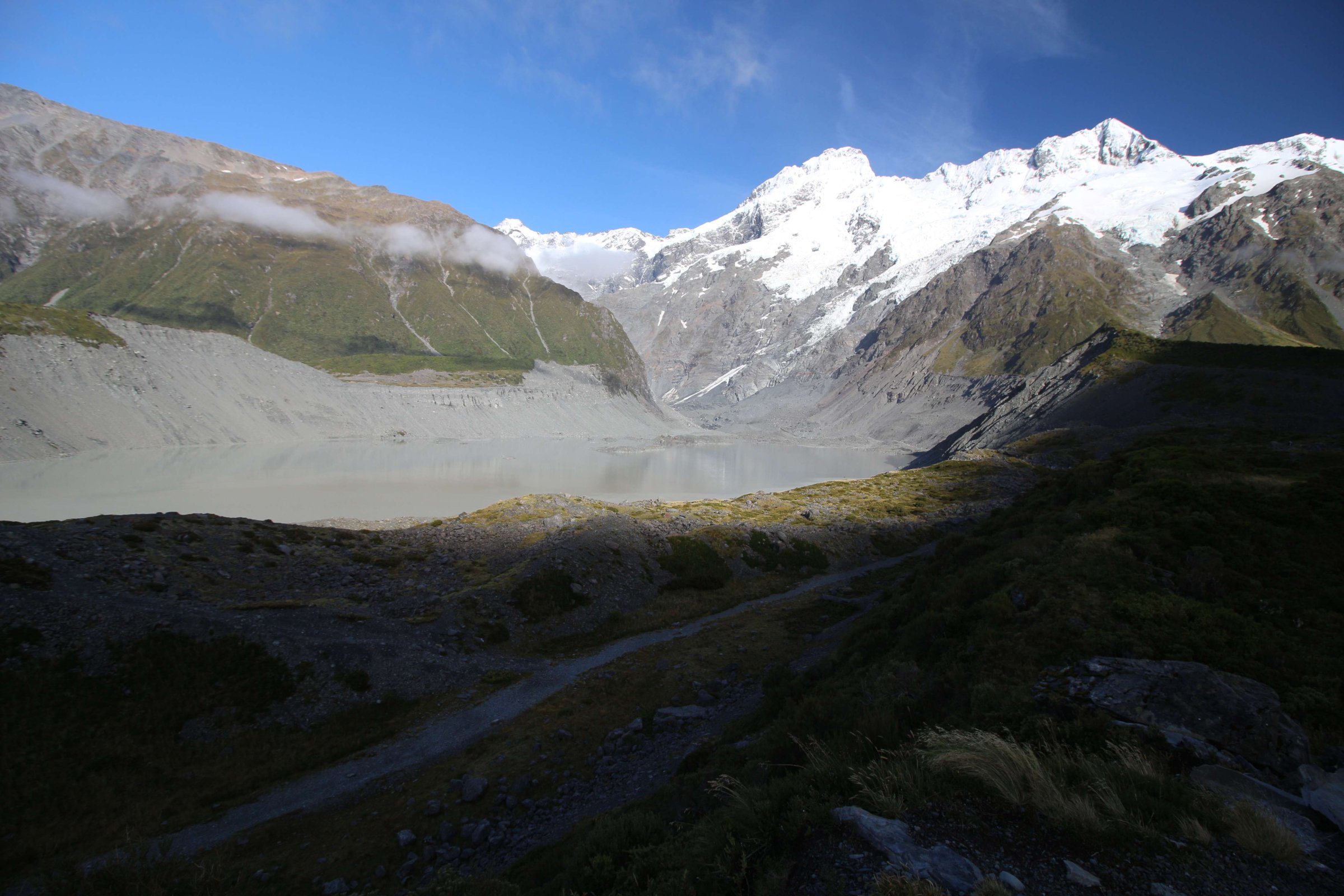 Собрались, поехали. Людей на улицах почти не было. Мы спокойно выехали из кемпинга и направились к Маунт Куку, останавлививаясь в красивых местах, чтобы сфотографировать Маунт Кук издалека. Погода нас не подвела, было ещё холодно, но тучи уже начали расходиться. Утром вода у озера Пукаки не приобрела ещё изумрудный цвет, поэтому мы ее почти не замечали. Что ж, едем дальше. Приехали к месту парковки: перед выходом на Hooker Valley Track, длина которого 5 км до ледникового озера у подножия горы Маунт Кук. В принципе дошли быстро, но по пути начали мерзнуть. У машины, когда собирались, было тепло, так как светило солнце, но стоило нам пройти несколько сотен метров, как мы попали в тень гор, и стало холодать. Пришлось укрываться.