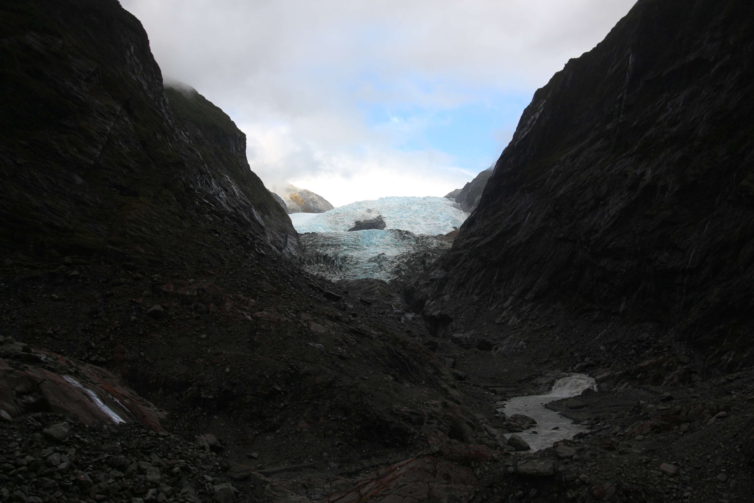 Прогноз погоды говорил о том, что туда, куда мы едем, после обеда дождя не будет. Но прогноз не оправдался. Сильного дождя реально не было, а вот моросящий дождь все-таки был. А ехали мы к ледникам Fox Glacier и Franz Josef Glacier. На леднике Fox Glacier всё было в тучах, мы поездили вокруг него и в итоге решили никуда не ходить, тем более я там уже был. Приехав на второй ледник Franz Josef Glacier, мы всё-таки хотели попробовать дождаться того момента, когда дождь перестанет идти, и в принципе дождались. Но всё равно было пасмурно, и сам ледник был не так красив, как когда я его видел 2 года назад. Но тогда я смотрел на него издалека и не ходил в трек на 2 км до него, а сейчас мы решили это сделать, и в итоге дошли до него.
