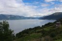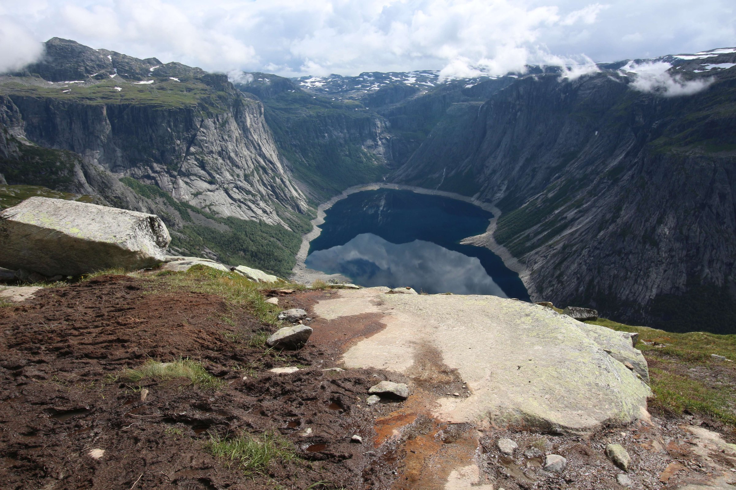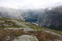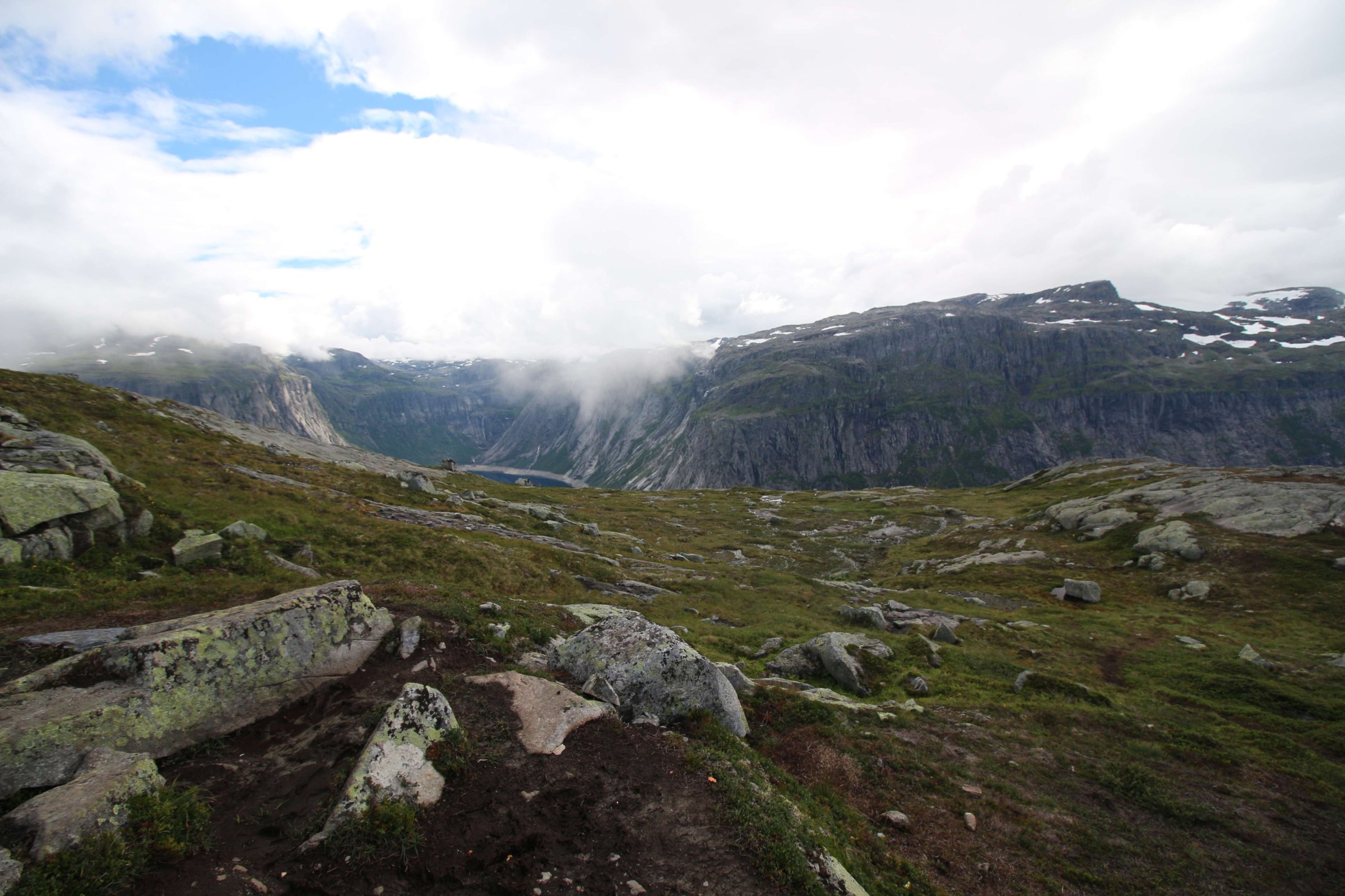 Дальше мы вернулись в Одду, сходили в магазин за продуктами. Там кассирша заговорила с нами по-русски. Мы поведали ей то, что завтра хотим подняться на язык Тролля, она нас пожалела, и, как оказалось, не зря. После магазина мы поехали на разведку к языку, и надо было ещё найти место, где можно было переночевать. Приехав к языку, поняли, что по дороге туда припарковаться и разбить палатку негде, а у самого языка парковка платная, 15 часов 200 NOK. Поехали обратно в город искать нормальное пристанище, но не нашли, и в итоге пришлось ночевать в машине. С обочиной там плохо, так как везде высокие горы, а дорога пролегает по их подножию. И, скорее всего, дорогу у гор люди отвоёвывали с трудом, поэтому обочины там немного и немного места, где можно разбить палатку и припарковать машину. Мы уже подумывали не идти к языку, так как ночь в машине была ужасная. Спать было невозможно, заднее сиденье у нас было забито вещами, поэтому спали на полуразложенных передних сиденьях. Утром я проснулся раньше и решил, что мы всё-таки должны собраться и поехать к языку, так как когда ещё такое мы сможем провернуть. Вернулись к платной парковке языка, оплатили её на 15 часов, собрали тяжелые рюкзаки с запасной одеждой, едой и газовой плиткой. Рюкзаки оказались очень тяжёлыми, даже не знаю, что там было такого, что в сумме давало такой вес. Взяли палки для ходьбы и пошли. Первый километр был супер сложным - грязь и крутой подъём. В некоторых местах этот подъём был оборудован камнями, имитирующими ступеньки, но где-то приходилось месить грязь. Второй километр был отдыхом - он был не таким крутым, и грязи было уже немного. Третий - опять крутой подъём, но уже без грязи. Там мы встретили белорусов, которые возвращались с языка. Они нам поведали, что они туда пошли вчера, не дошли несколько километров, разбили палатку на ночь, а утром встали, добежали налегке до языка, пофоткались и вернулись к палатке, собрались и теперь идут к парковке не сильно уставшими. Это самый удобный способ дойти до языка. А за одни сутки это очень сложно сделать. Но мы уже пошли по этому пути, и пути назад не было. Следующие 8 километров были не такие сложные, как 1-ый и 3-ий, но усталость давала о себе знать. По пути мы проходили несколько красивых смотровых площадок.
