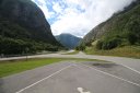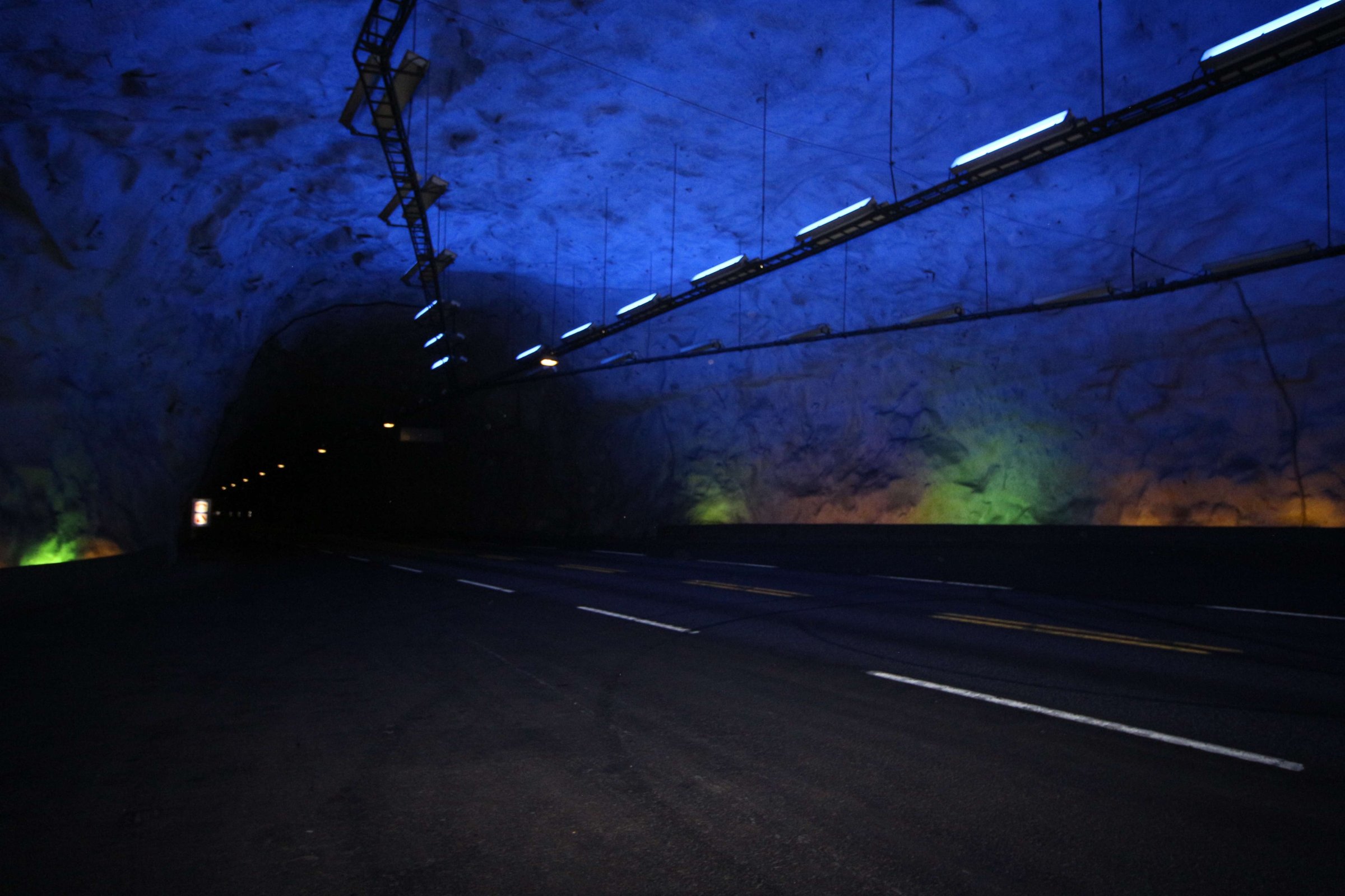 По дороге мы въехали в длинный Лердальский тоннель, его длина составляет 24,5 км. В нём уже мы начали замечать камеры фиксации скорости, поэтому приходилось держать скорость на уровне. В туннеле на каждом километре были таблички с надписями, показывающими, сколько мы уже проехали и сколько осталось. Также на всём протяжении туннеля было 2 места, где можно было остановиться и отдохнуть.
