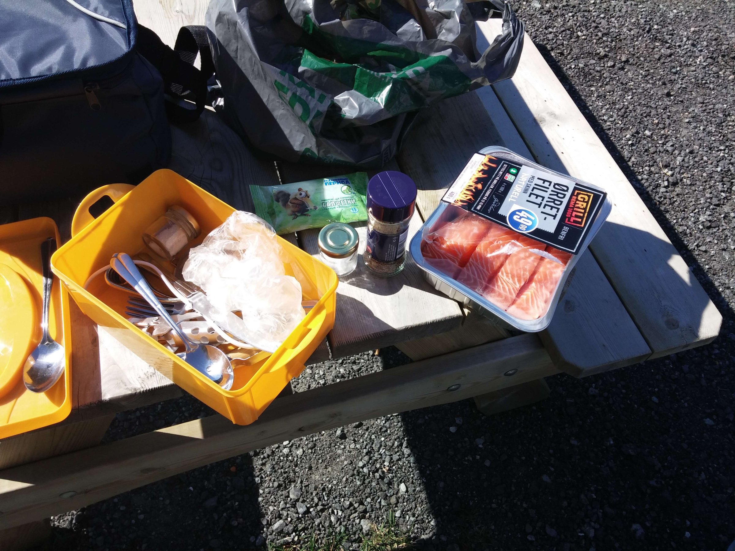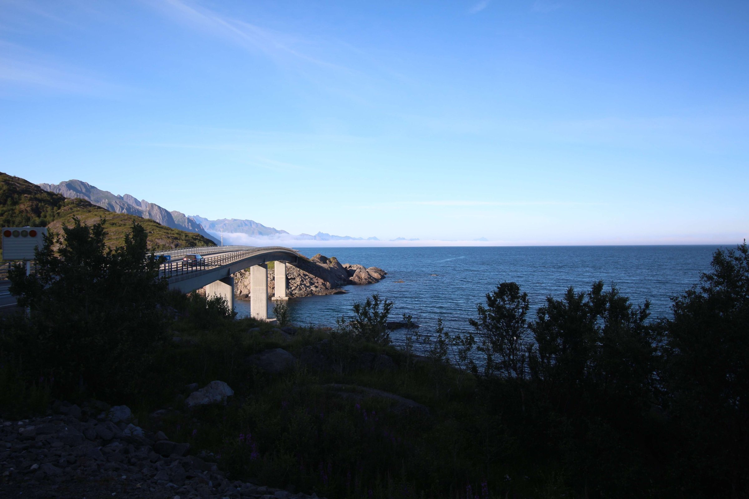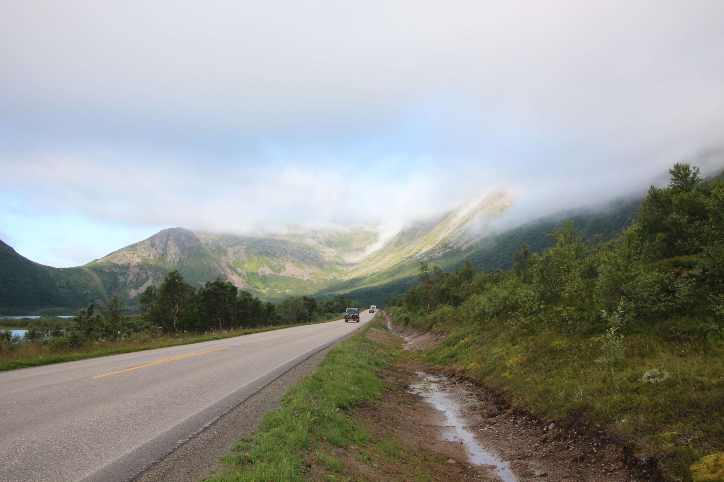Итак, 22-ое июля 2016 года, проснулись мы в местечке под названием Birtavarre, собрались и поехали в сторону Лофотенских островов. На пути у нас был остров под названием Сенья (Senja), до него нам предстояло проехать около 250 км. Ну и как полагается, мы очень долго ехали, так как по дороге много останавливались, чтобы полюбоваться видами. Также раз в 2-3 дня нас задерживало то, что мы останавливались в пути и готовили нормальную еду. До готовки мы заезжали в супермаркет, обычно это был Rema 1000, и покупали там красную рыбу по цене 400 руб. за 400 гр. Рыба была вкусная и без костей, и мы, проголодавшись, съедали её с супом за раз.