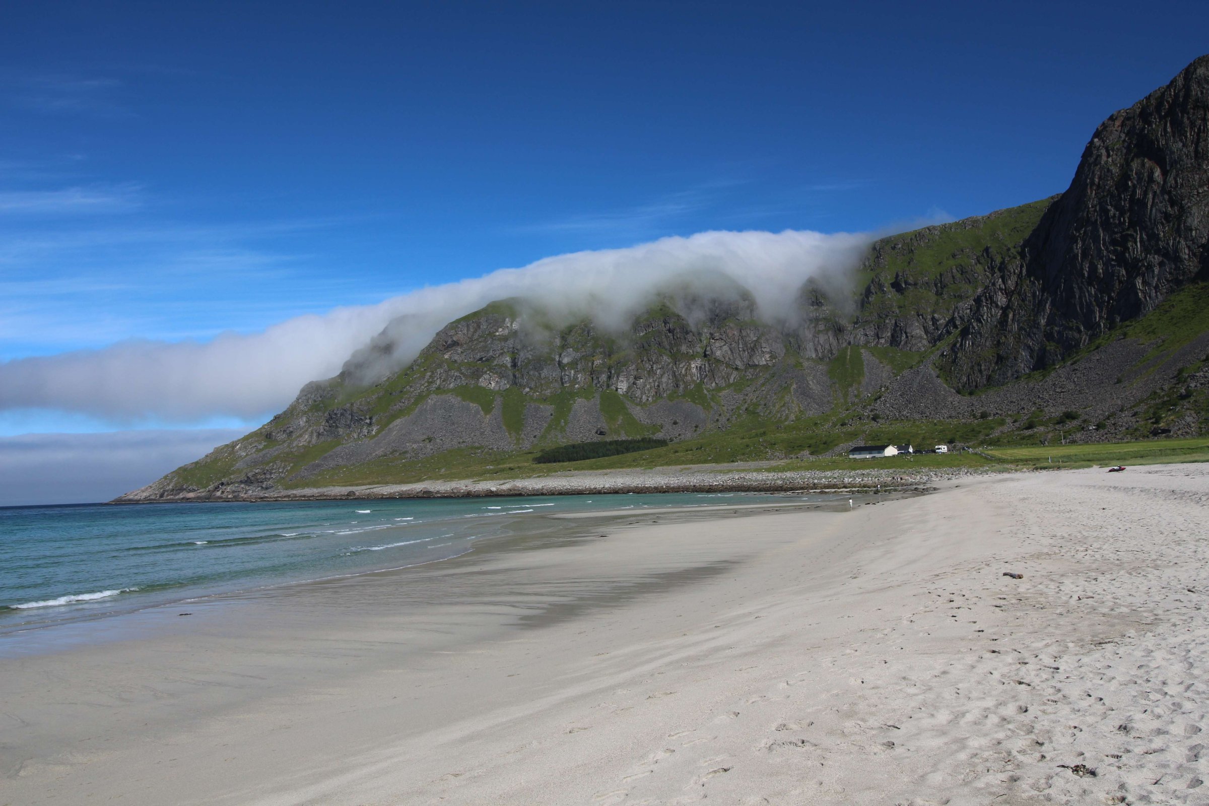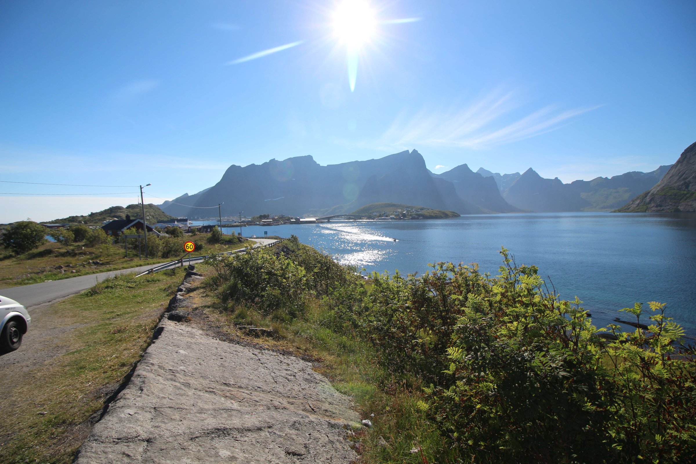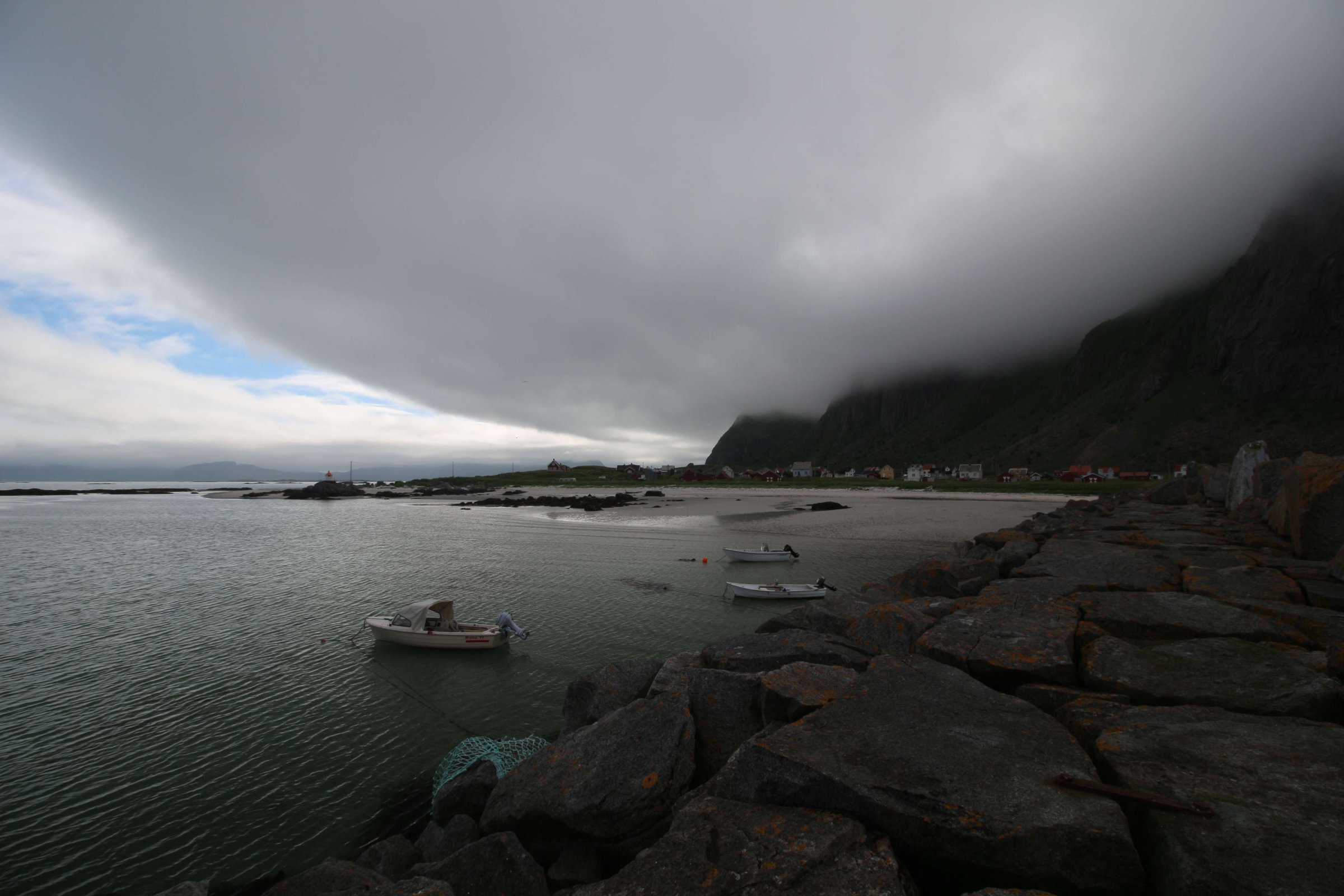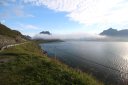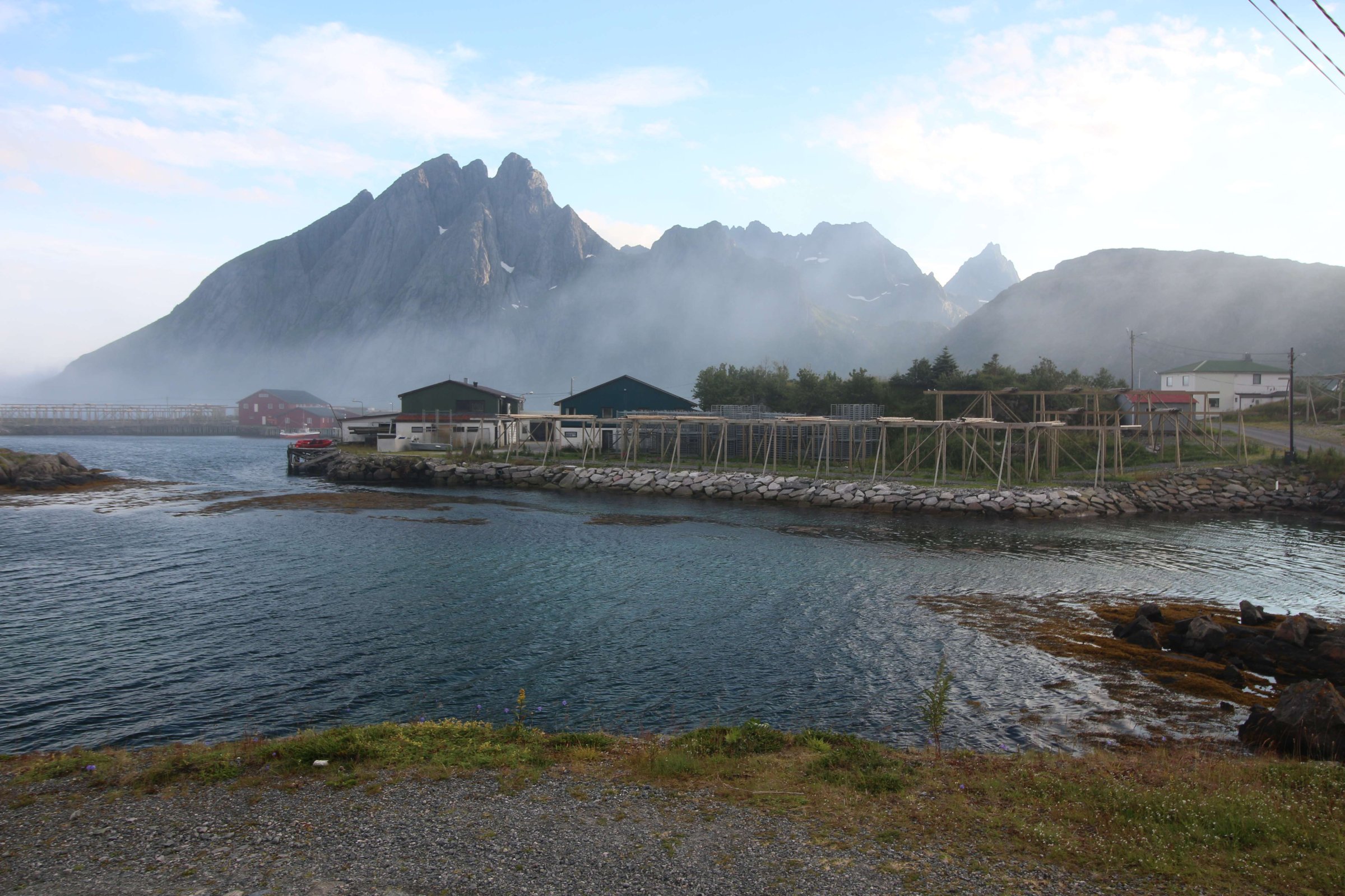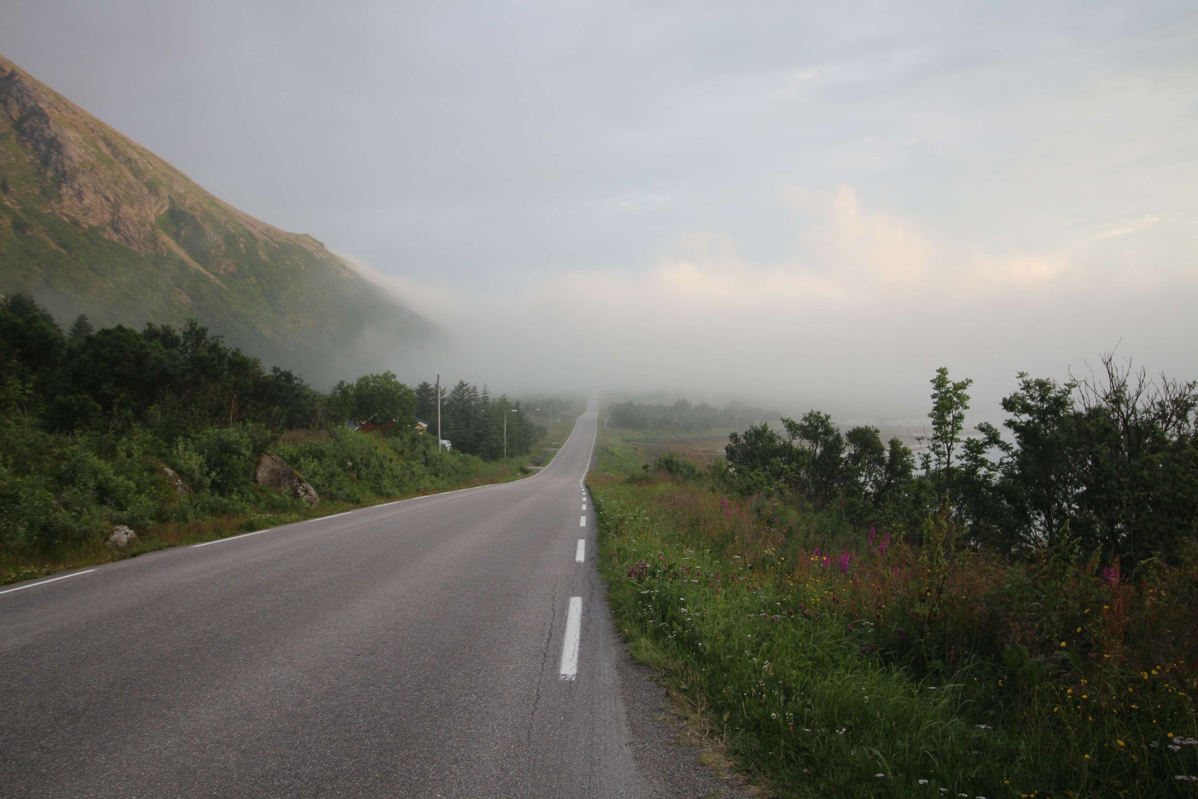 Едем дальше. По плану у нас Лофотенские острова, и никакой гостиницы или кабинки мы там не бронировали. Хотели найти место либо дикарём, либо по ходу движения. Тут начался дождь, да и туман заволок настолько, что было плохо видно дорогу. Поискал я как всегда кемпинги через приложение MapsWithMе, и в найденные мы поехали пытать счастье. В первом кемпинге кабинки были заняты. Поехали в следующую, а там жена владельца кемпинга оказалась русская. Она нам сказала, что у них все кабинки на несколько месяцев вперёд забронированы, и так везде на Лофотенских островах. И она нам предложила место под палатку, на что мы неохотно согласились, причем место было только на лужайке перед окном их дома. Это была первая ночь путешествия, когда мы были вынуждены ночевать в палатке, но зато стоимость палатко-места была ниже, чем у кабинки - 200 NOK (1800 руб.). В эту цену входил еще комплекс из кухни, туалетов и душей, но душ за отдельную монетку. И так мы поселились на несколько дней на Лофотенских островах. До этого мы нигде больше, чем на одну ночь, не задерживались. Но тут я понял, что всё за один день объехать нельзя, да и на следующий день погода не обещала быть хорошей. Поэтому на Лофотенских островах мы провели 3 дня. Один день был дождливый, второй средний, а третий хороший. Но каждый день под конец дня наваливал туман с воды. Вообще управляющая сказала, что мы вовремя приехали - у них в день нашего приезда был первый день лета, то есть была более менее хорошая погода.