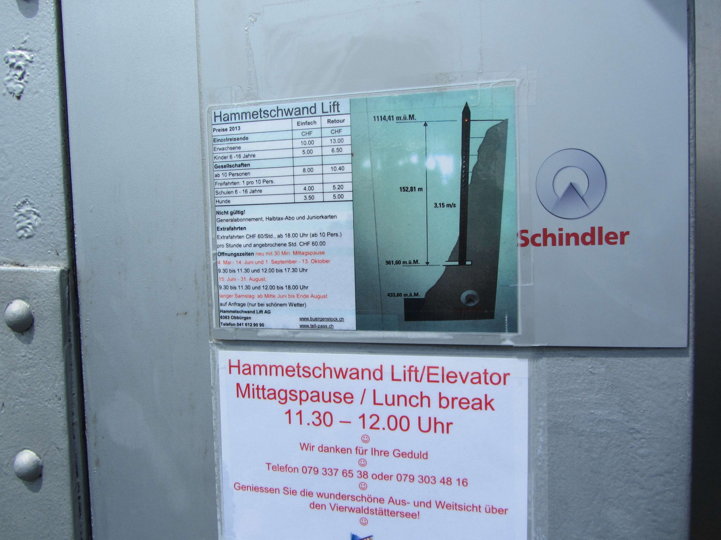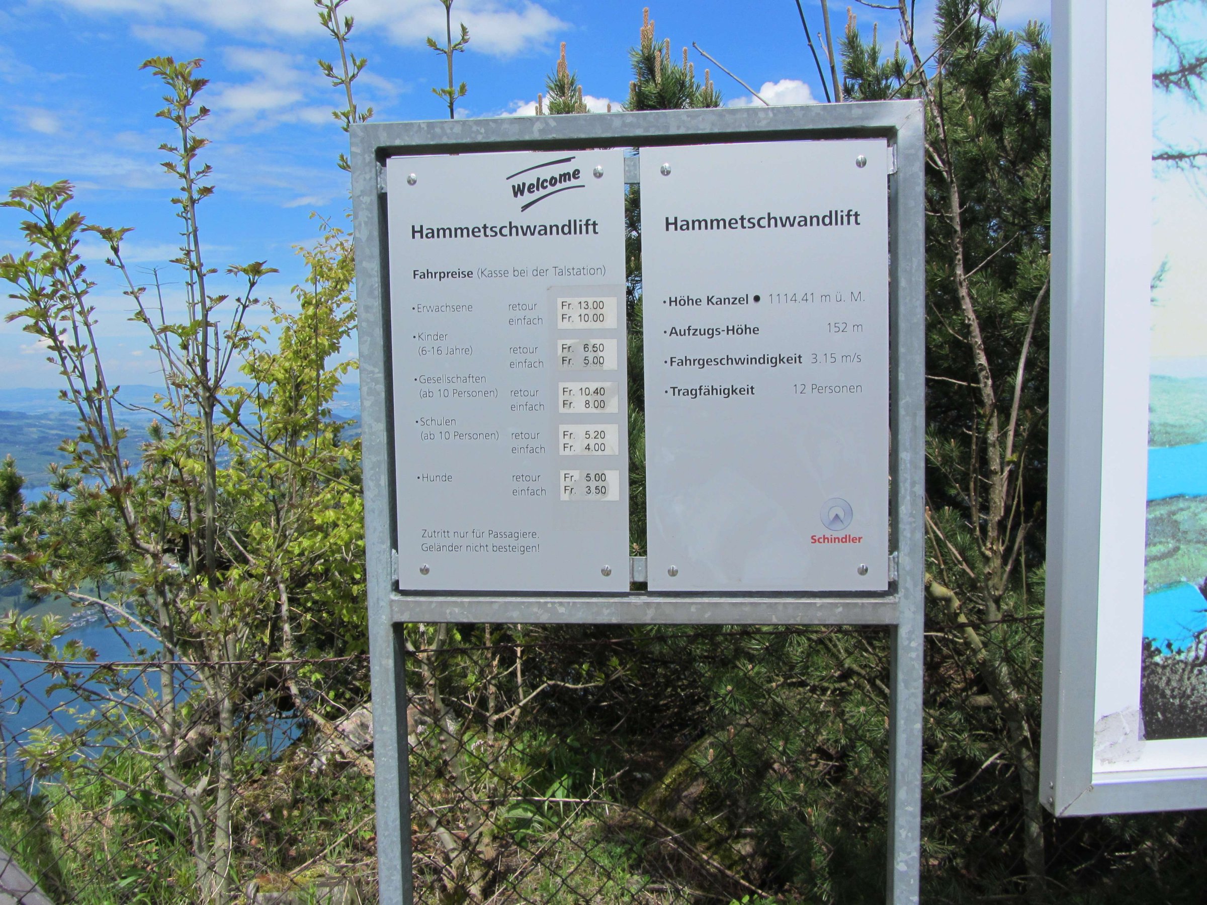 Hammetschwand Lift основан в 1905 году, после этого в 1991 году лифт был модернизирован. Высота лифта составляет 152 метра, это расстояние он проходит меньше, чем за минуту, и всё это время вы можете видеть красоты Фирвальдштетского озера сквозь стеклянные стены лифта. Верхняя часть лифта находится на 681 метр над уровнем озера. Скидок на билеты по SwissPass на подъём нет. Полная стоимость билета в мае 2013 года туда-обратно была в районе 13 шв. франков на взрослого.